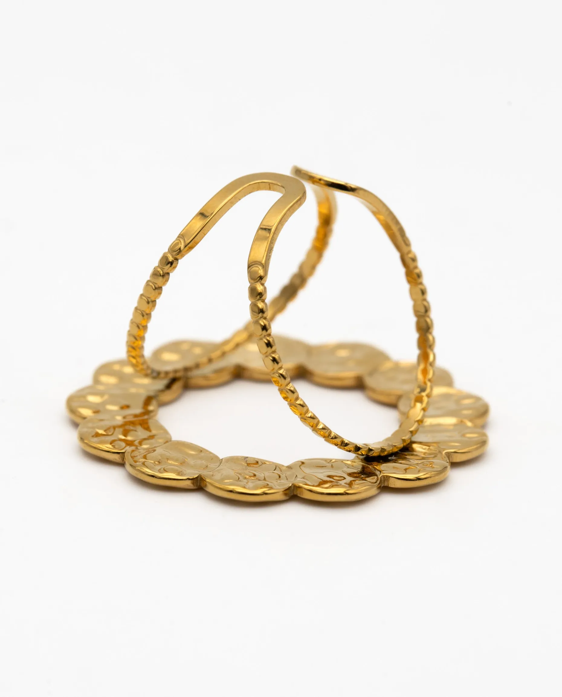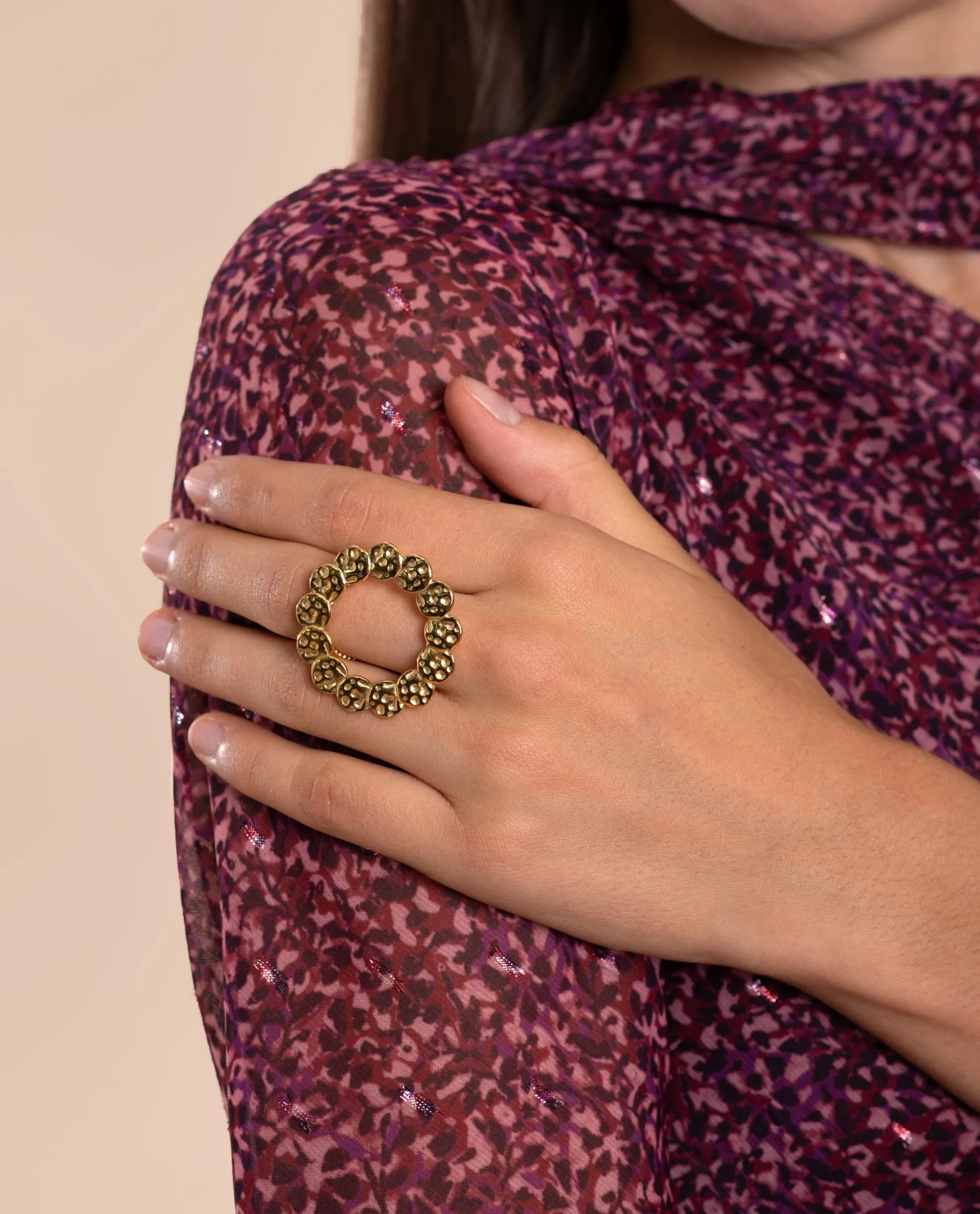 Este anillo en forma de círculo tiene un tamaño maxi y un elegante diseño que querrás llevar en tus ocasiones más especiales. Está hecho de acero inoxidable, muy resistente, y bañado en Oro de 18kt. Su tamaño es ajustable y alrededor está compuesto por pequeñas medallas irregulares. Si eres amante de los accesorios originales, hazte con este anillo!