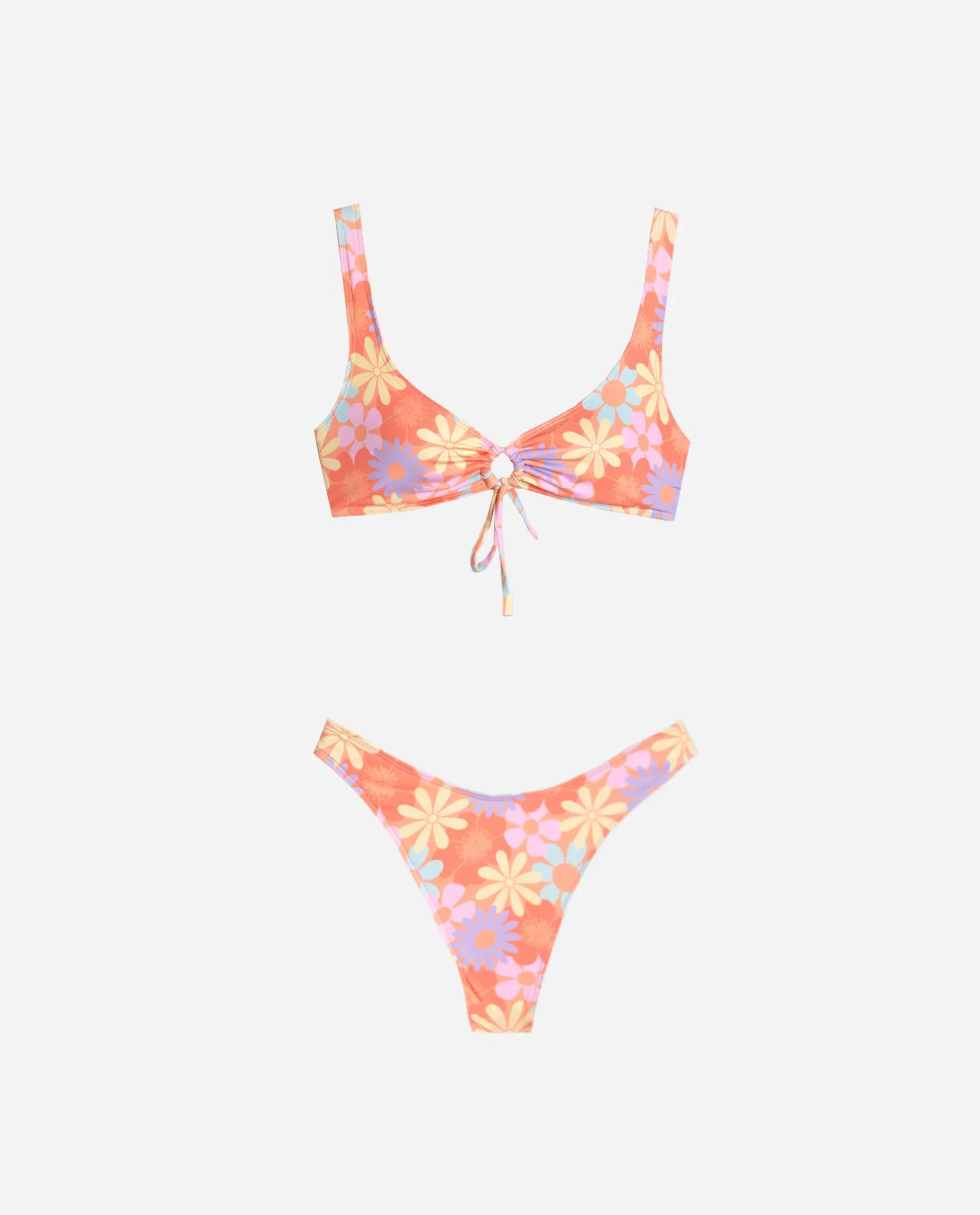 Este bikini es uno de los más especiales de la colección inspirada en los 2000’s. El top es de tirante ancho con un círculo fruncido en el centro que favorece muchísimo el escote. La braguita es muy muy cómoda y recoge muy bien porque al tener forma de V podrás ajustártela a la altura que quieras de la cadera. El estampado de flores vintage es máxima tendencia este verano y la combinación de colores lo convierten en un diseño único con el que vivirás los momentos más especiales del verano… Lista para darlo todo?