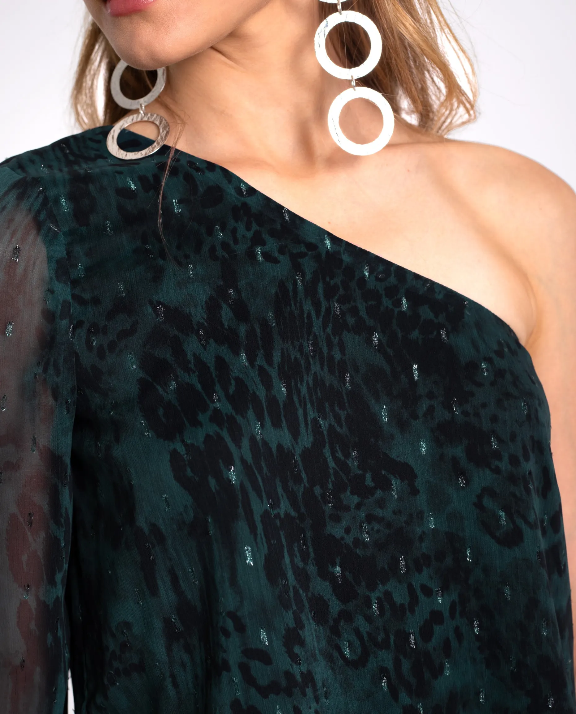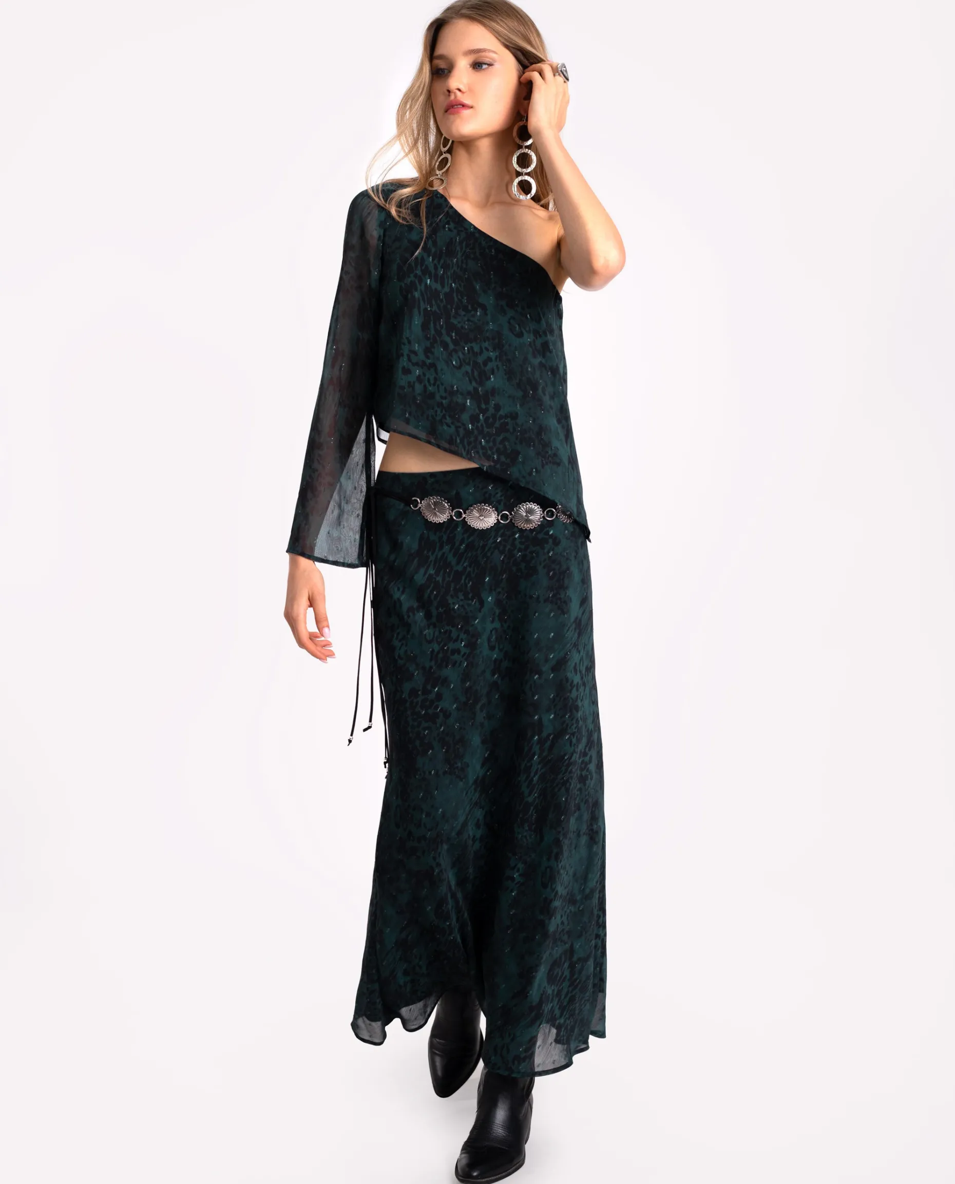 Esta blusa es una de nuestras favoritas porque la puedes llevar en mil ocasiones y combinar tanto con falda como con pantalón. El estampado animal print, creado en tonos verdes y con hilos de lurex, aporta un brillo sutil que hace que este conjunto sea muy versátil y perfecto para llevar a diario y también en ocasiones especiales. La blusa tiene el escote y bajo asimétrico, con una manga larga acampanada. ¡Combínala con la falda a conjunto y consigue el look completo!