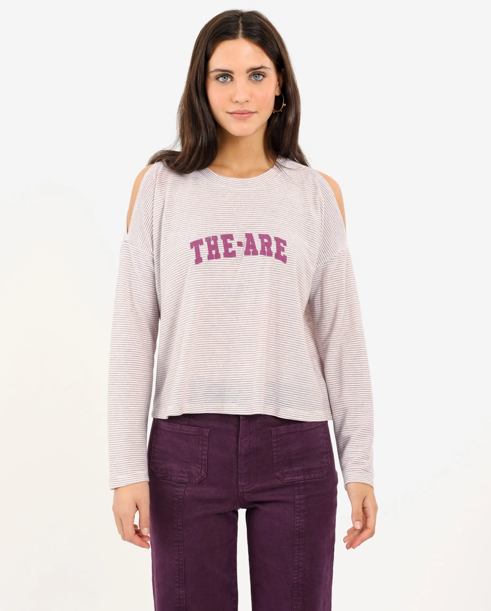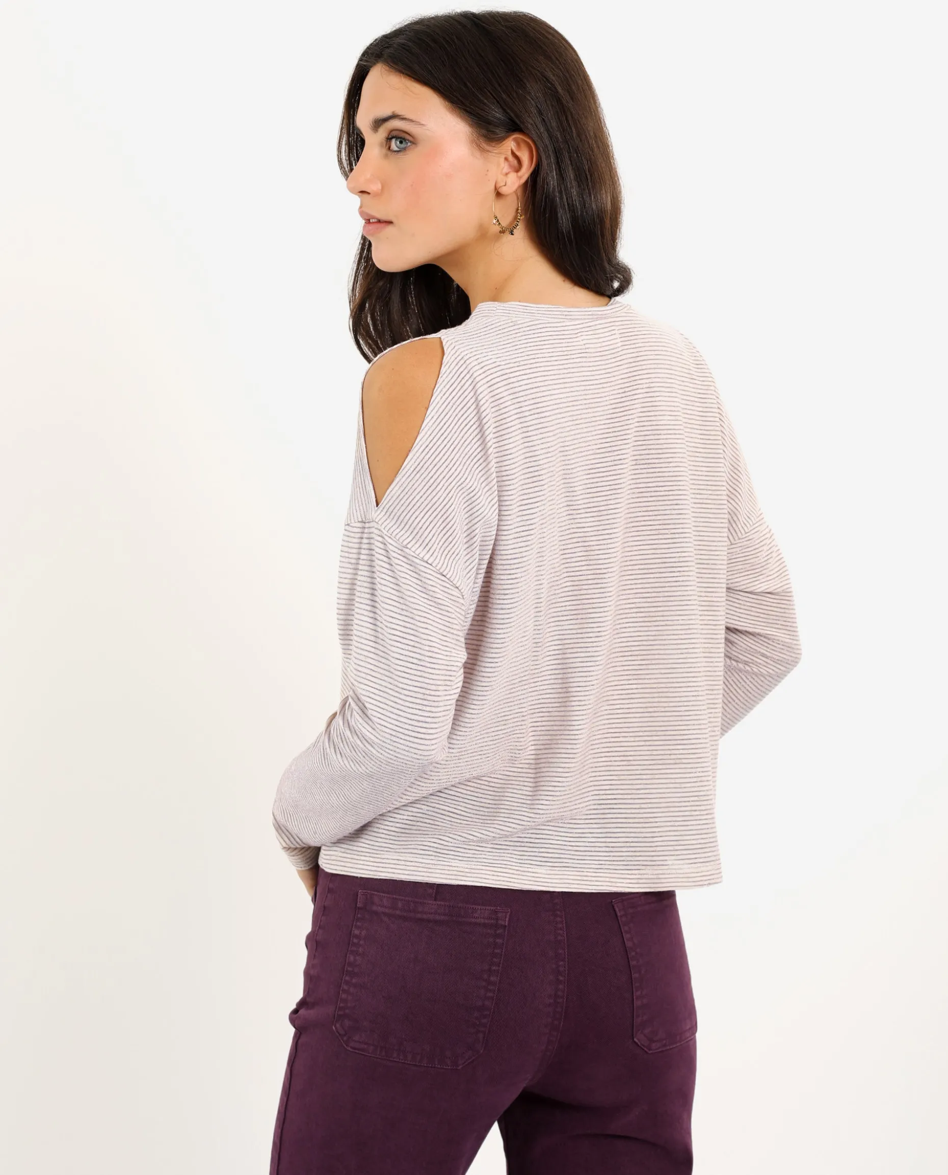 Nos encantan los básicos con detalles especiales y por eso hemos diseñado esta camiseta de rayas con aberturas en los hombros. Con el patrón de un jersey oversize y confeccionada en tejido elástico de rayas horizontales e hilo de lurex con un poco de brillo. Es cómoda y fácil de combinar, se convertirá en tu imprescindible para llevar con unos jeans en tu día a día.