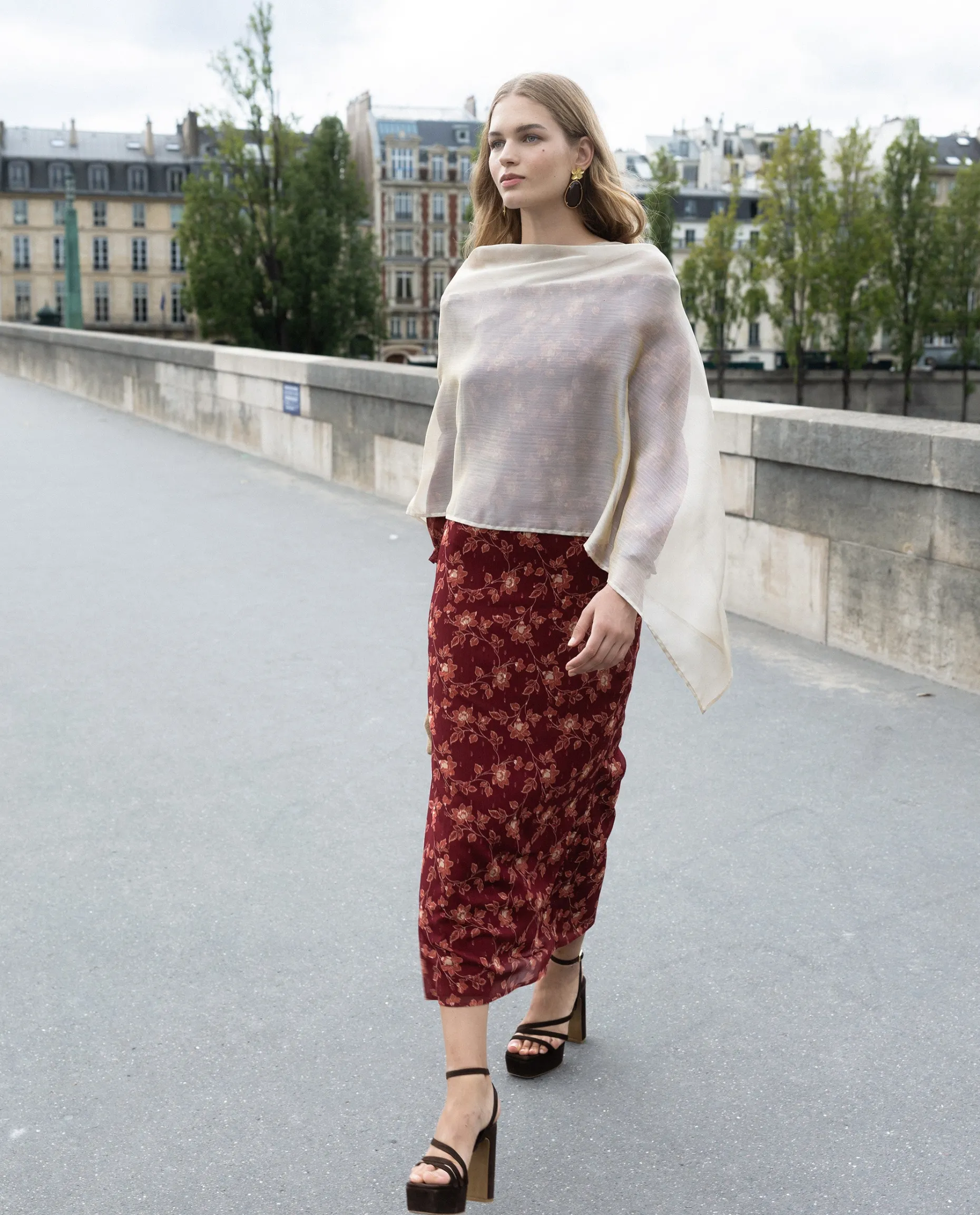 Uno de los complementos más buscados para eventos por su versatilidad y funcionalidad. Esta capa de invitada unida está confeccionada en un tejido de gasa fluido, sedoso y agradable al tacto que elevará cualquier look a otro nivel. Elegimos el color champagne con un poco de brillo por lo elegante y favorecedor que sienta. Ideal para combinar con cualquier vestido, mono o conjunto de invitada.