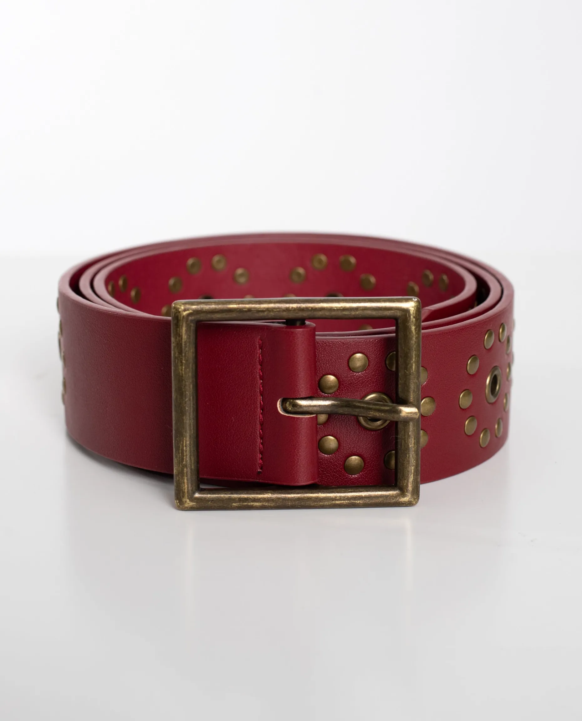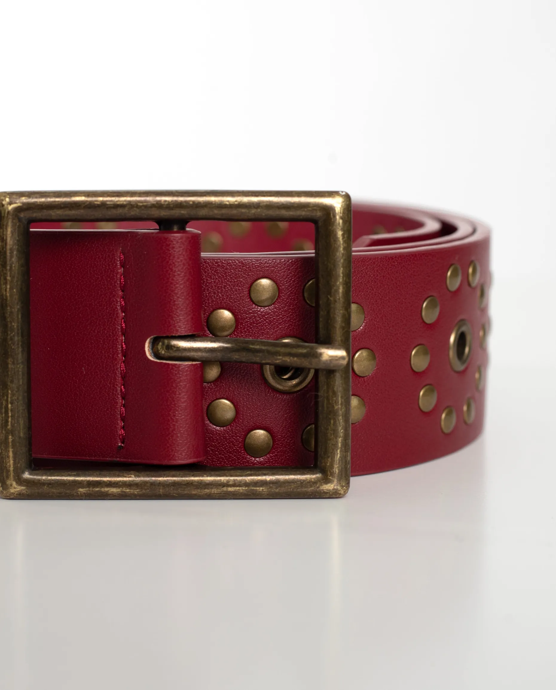 Cinturón de piel de color granate con tachuelas y ojales oro envejecido. Hebilla cuadrada con las puntas redondeadas. Por su diseño con ojales, se puede ajustar en todo lo largo del cinturón.