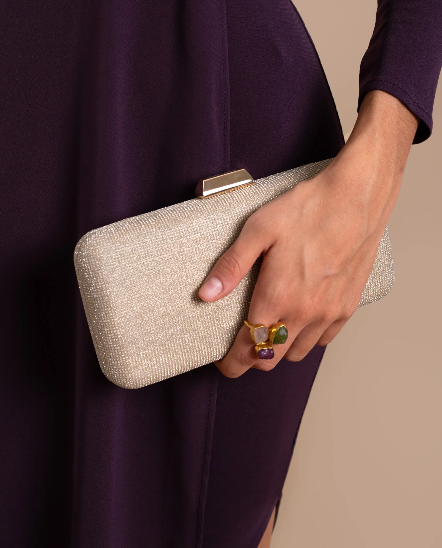 Tienes justo delante el bolso perfecto para tu próximo evento porque combina con absolutamente todo! El tejido es suave, con un poco de textura y brillo, es muy elegante y tiene el tamaño ideal para llevar lo imprescindible. Lleva una cadena dorada en el interior para colgar.