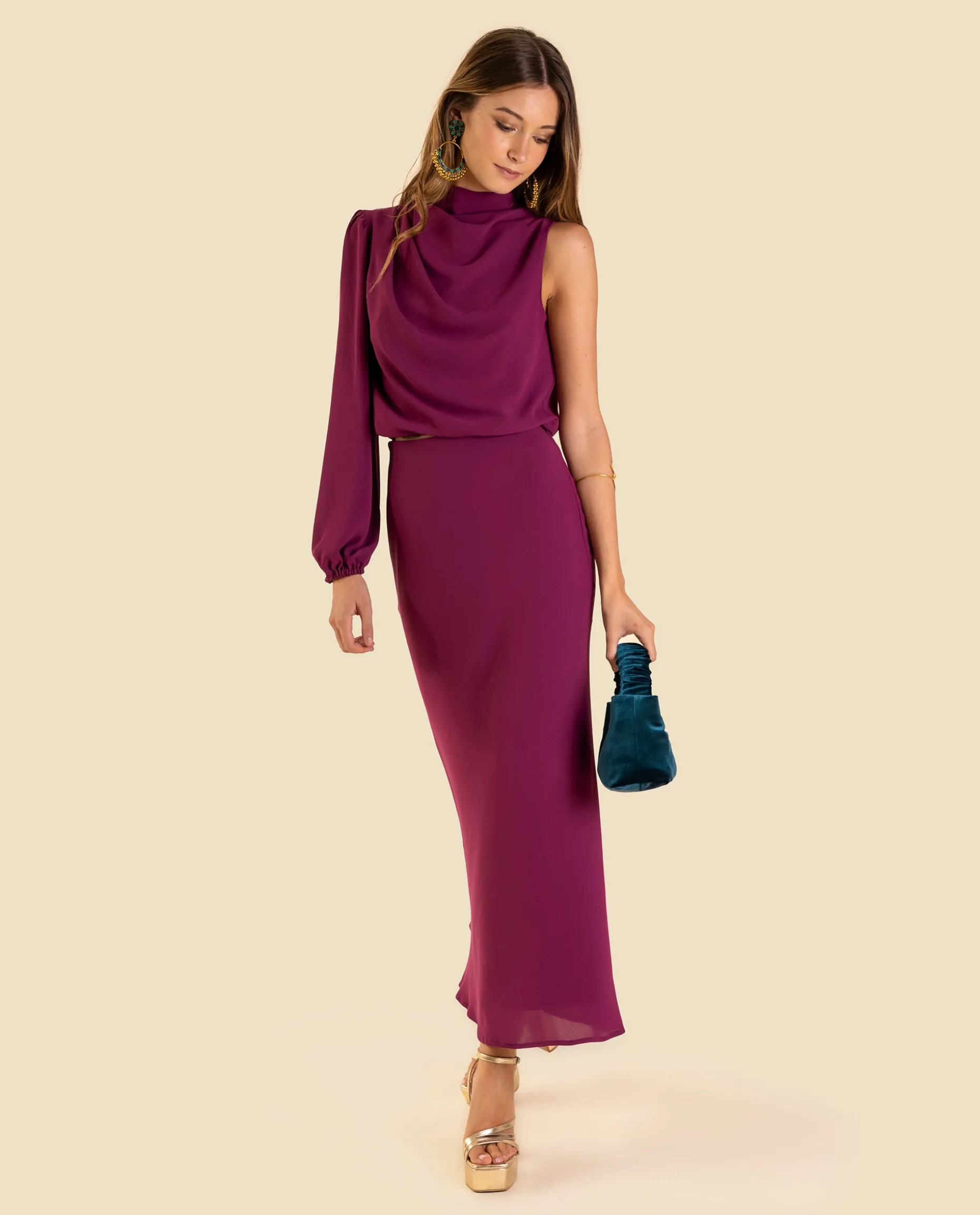 Nos encantan los conjuntos de dos piezas para una ocasión especial por su versatilidad y estilo. En esta colección, la falda Mrs. Arriaga destaca por su diseño ajustado con un poco de vuelo en el bajo que no puede ser más elegante. Es de talle alto, con la cintura elástica para un ajuste perfecto y el tejido es uno de los más especiales, una gasa con una caída preciosa. El efecto óptico del total look es un vestido, pero al ser dos piezas podrás combinarlo de diferentes formas. Completa el look con la Blusa Mrs. Arriaga para lucir espectacular durante el gran día!