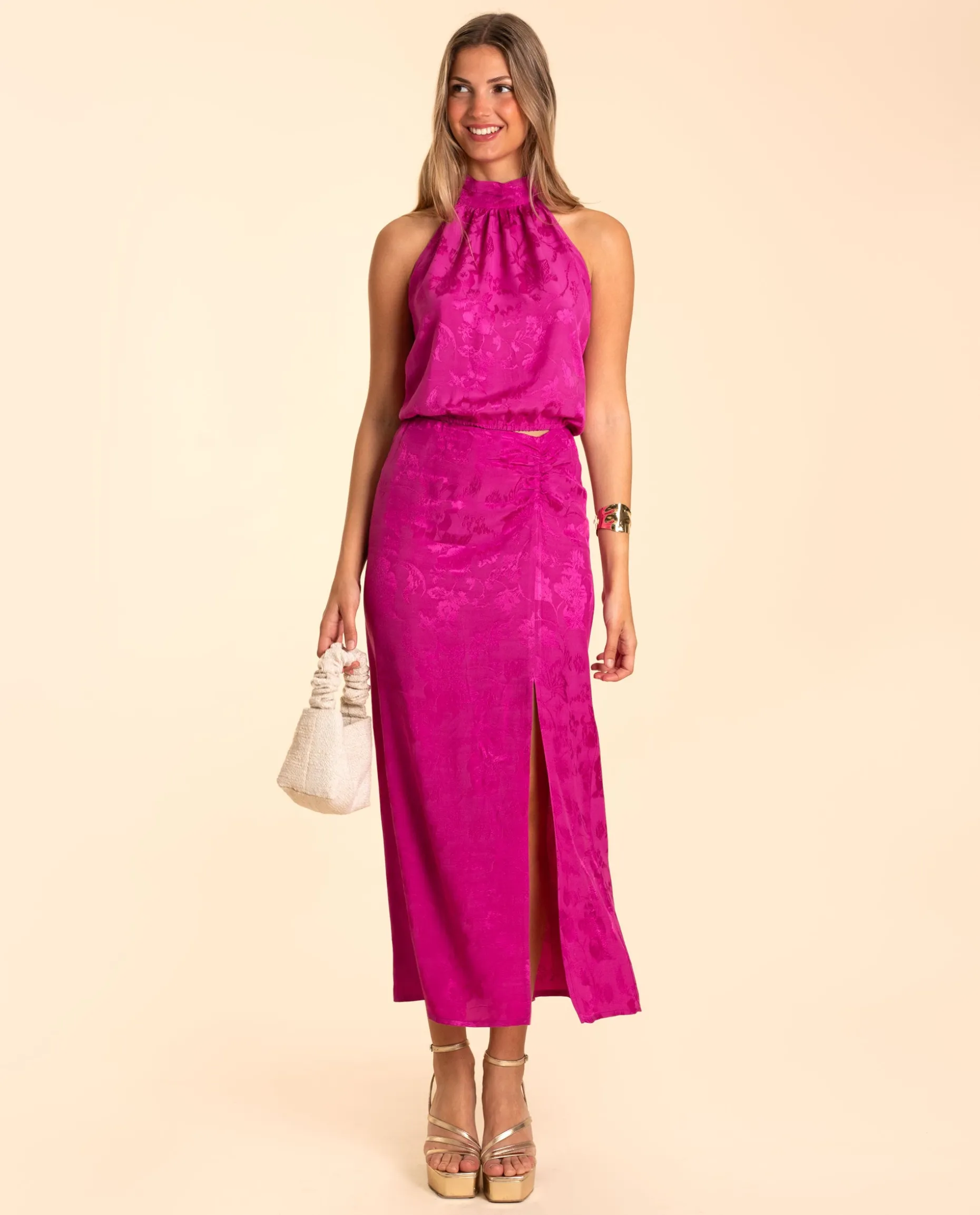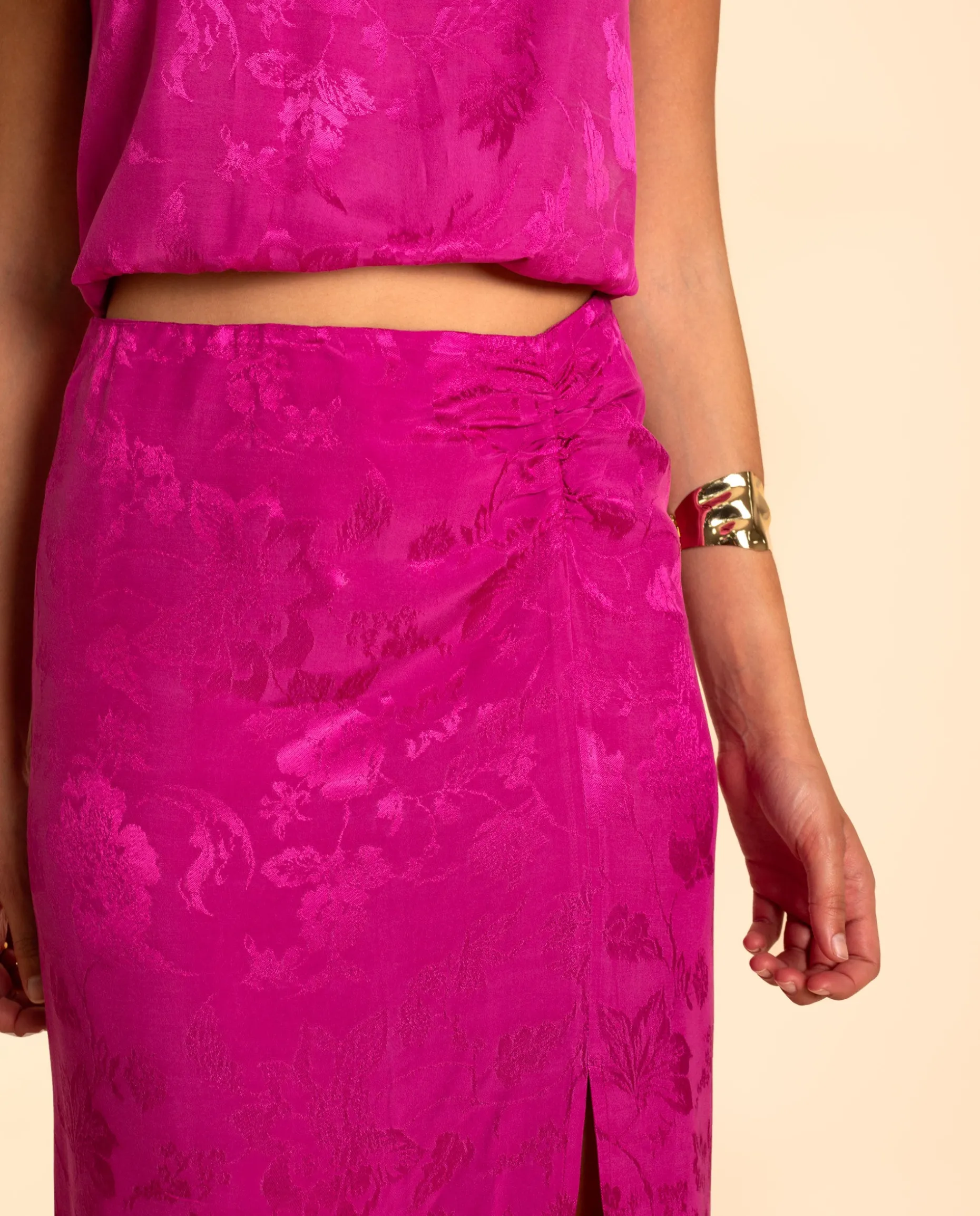 Este conjunto de invitada está hecho al detalle para que no pases desapercibida en tu próximo evento. Es una falda elegante que al ser de corte midi podrás llevarla en ocasiones especiales tanto de día como de noche y con la que siempre irás perfecta. Al ser de talle alto estiliza y favorece muchísimo la silueta gracias a su abertura lateral y el detalle drapeado en la cintura. El tejido es ligero, pero con mucha caída confeccionado en un tejido jacquard de estampado flores con textura, muy agradable al tacto. El efecto óptico de este total look es el de un vestido, pero al ser dos piezas podrás llevarlo junto o por separado.