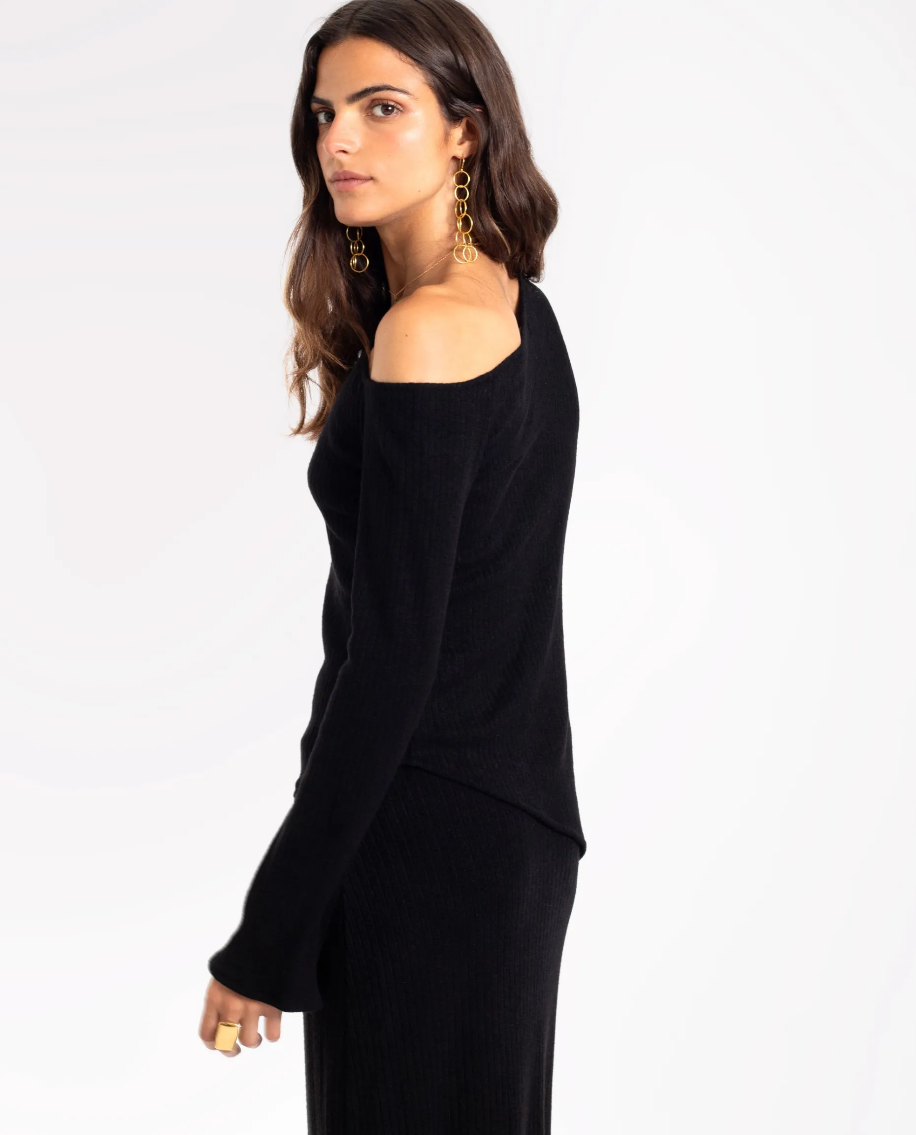 Este conjunto de jersey y falda de punto se convertirá en tu favorito para el día a día. Está hecho de punto canalé elástico, así que es súper cómodo y lo puedes combinar de mil maneras distintas. El jersey destaca por su escote asimétrico que deja un hombro al descubierto y su bajo asimétrico que tanto se lleva esta temporada. No vas a querer quitártelo!