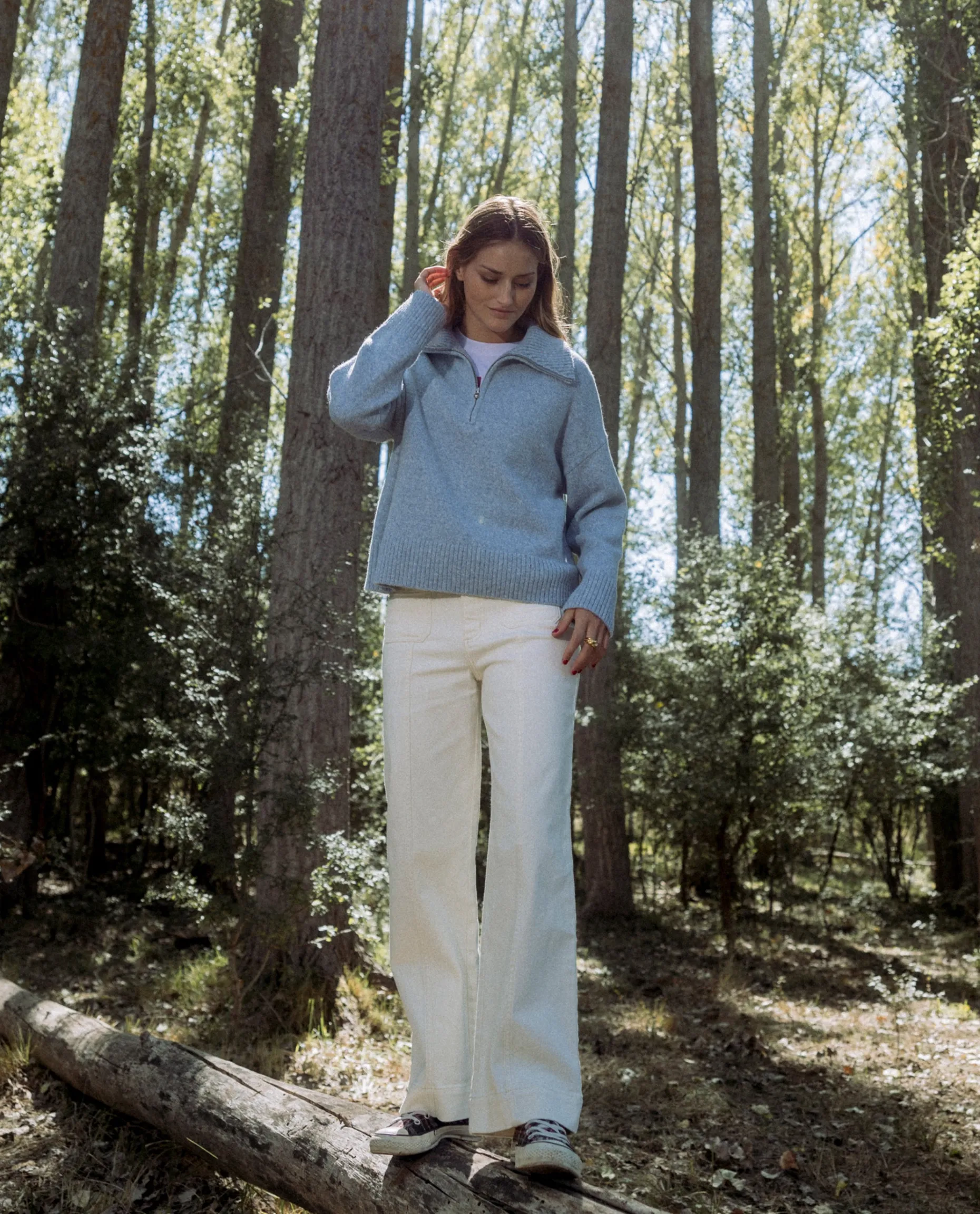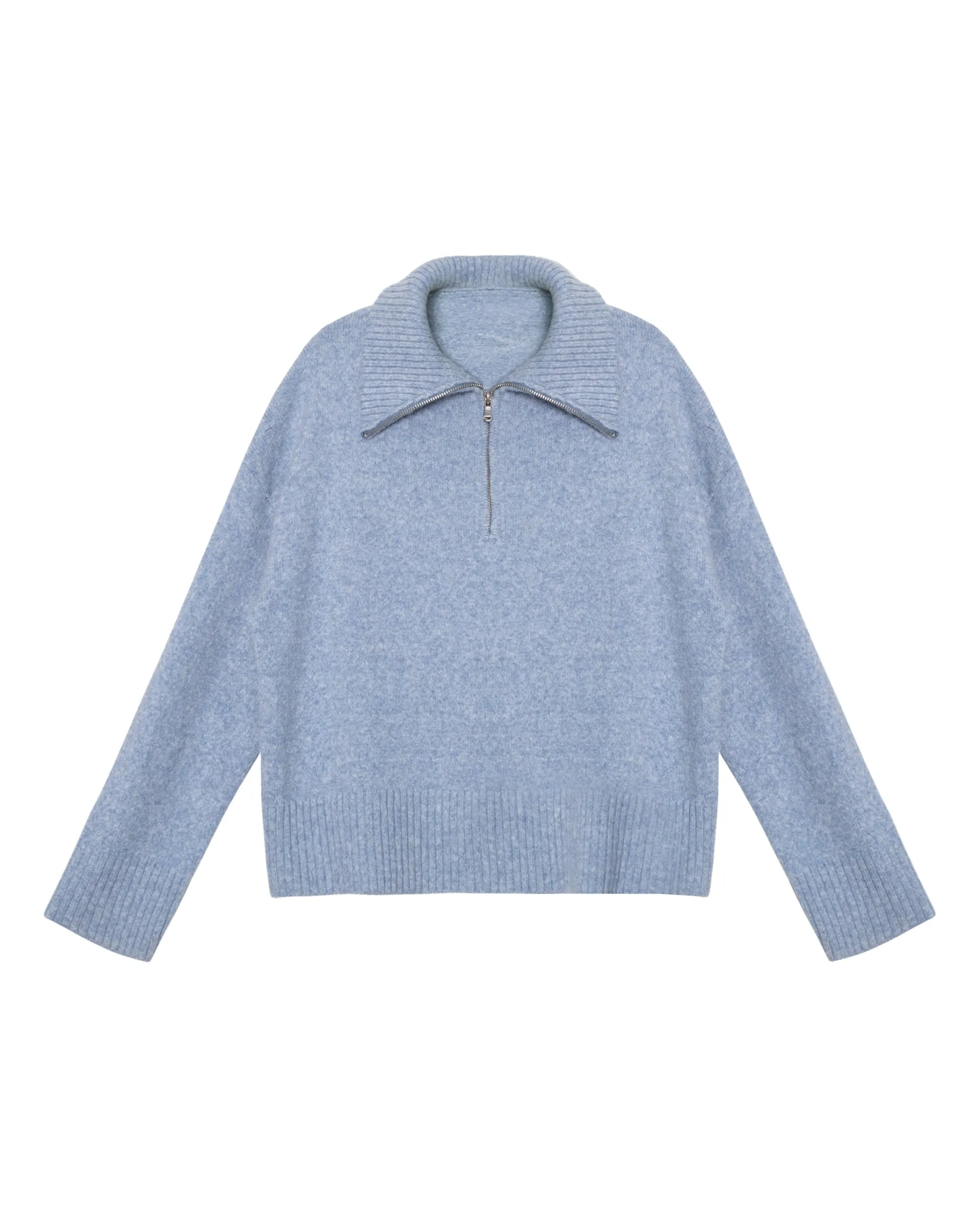 Los jerséis con cremallera están por todo el street style, y este de aquí se convertirá en tu básico de invierno que no querrás quitarte. De corte oversize y confeccionado en un punto grueso muy suave, es perfecto para mantenerte abrigada sin renunciar a la comodidad. Lo hemos diseñado en un color azul claro que, junto a su cuello alto con cremallera, favorece muchísimo y es fácil de combinar. Lo tiene todo para convertirse en tu imprescindible.๐’