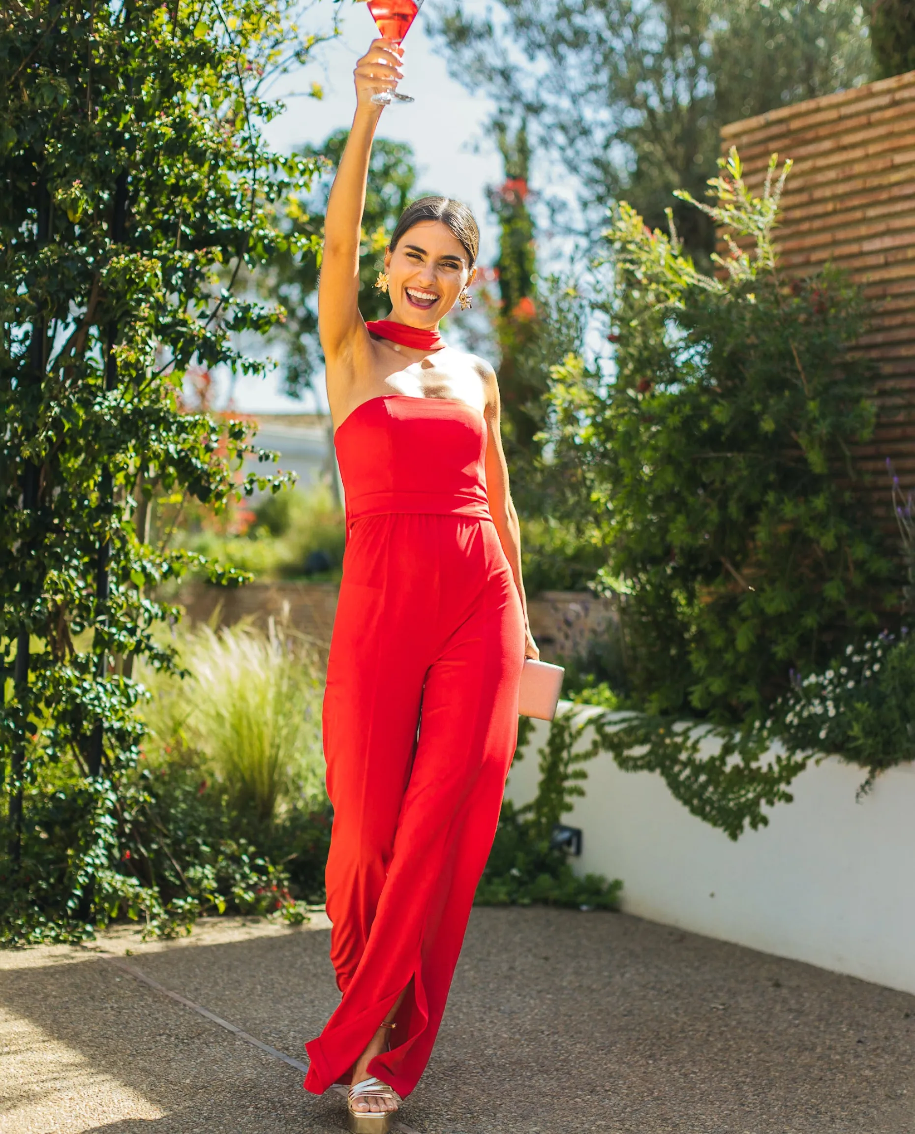 Nuestra diseñadora ha pensado en todo para que sea el mono que mejor siente: escote de palabra de honor, tejido de punto elástico para estilizar y lazada al cuello efecto fular. Sin duda, es uno de los monos elegantes que desde el primer momento nos enamoramos de él! El cuerpo es ajustado y el pantalón palazzo es talle alto efecto push up para estilizar al máximo. Lleva los hombros completamente al descubierto y lo llevarás muy cómodo porque gracias a la silicona se ajusta a la perfección. El color rojo es súper elegante, uno de los favoritos para vestir en eventos y favorecedor para todo tipo de tonos de piel. Póntelo para tu graduación o evento con accesorios en dorado y serás la invitada perfecta.