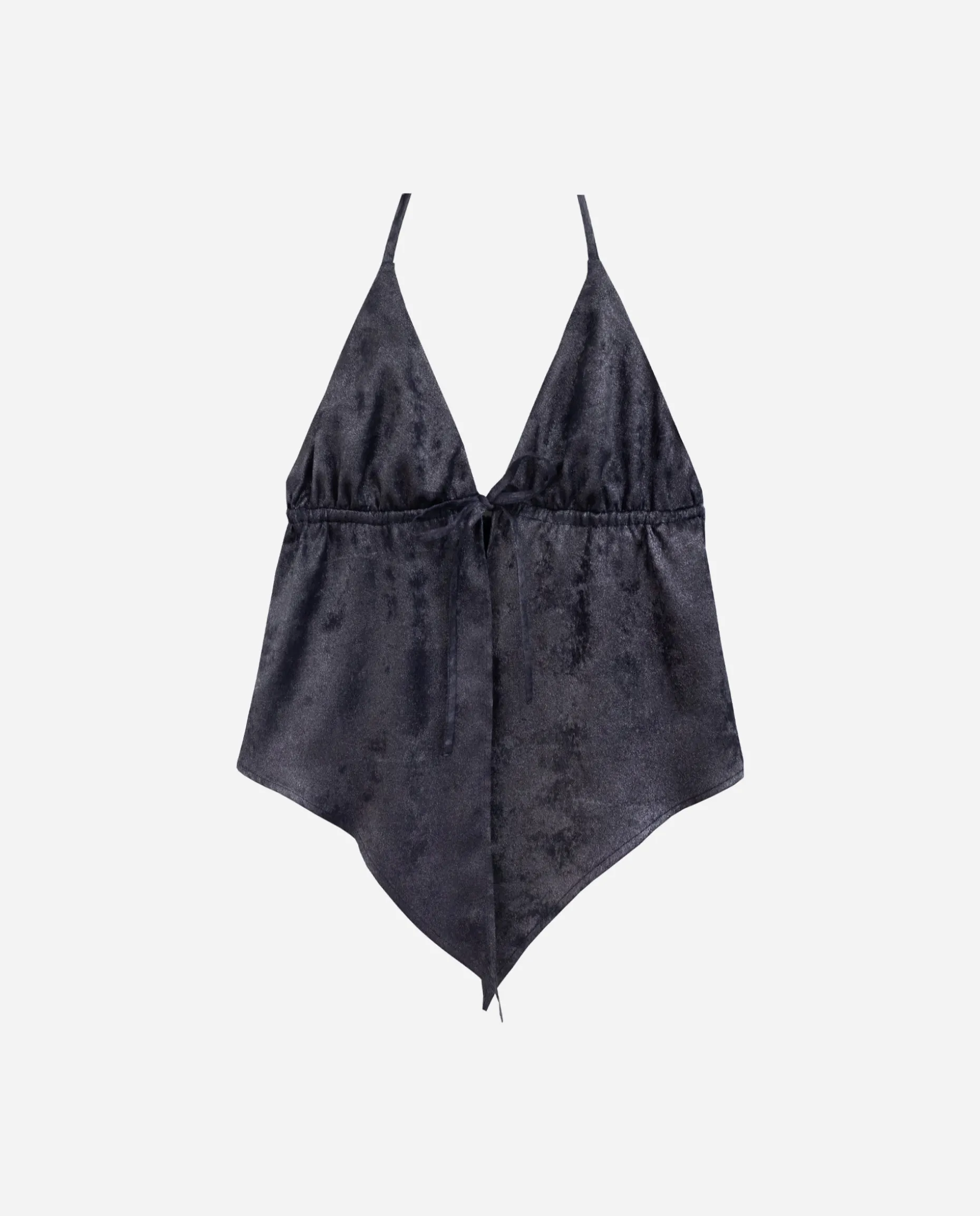 Este top te va a encantar especialmente por su tejido metalizado con lurex y la espalda al descubierto, con él no pasarás desapercibida! El escote triángulo es abierto y totalmente regulable, por lo que lo puedes llevar más abierto o cerrado. Va anudado al cuello con una lazada, así que sienta perfecto. Atrévete con este look, lo llevarás en todas tus fiestas!