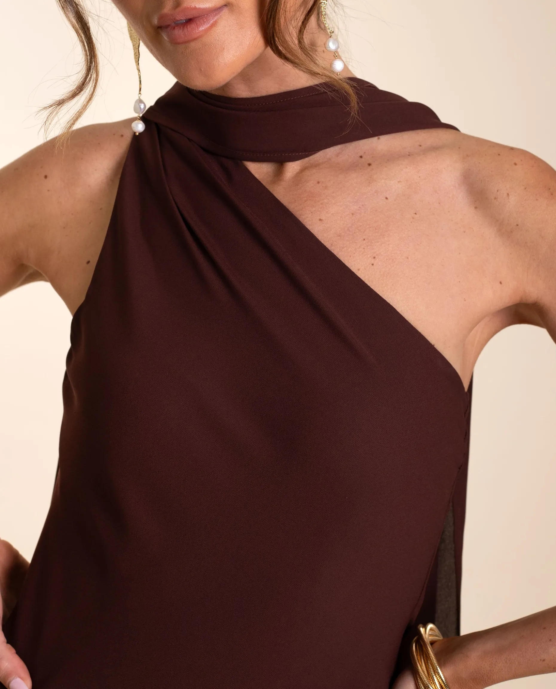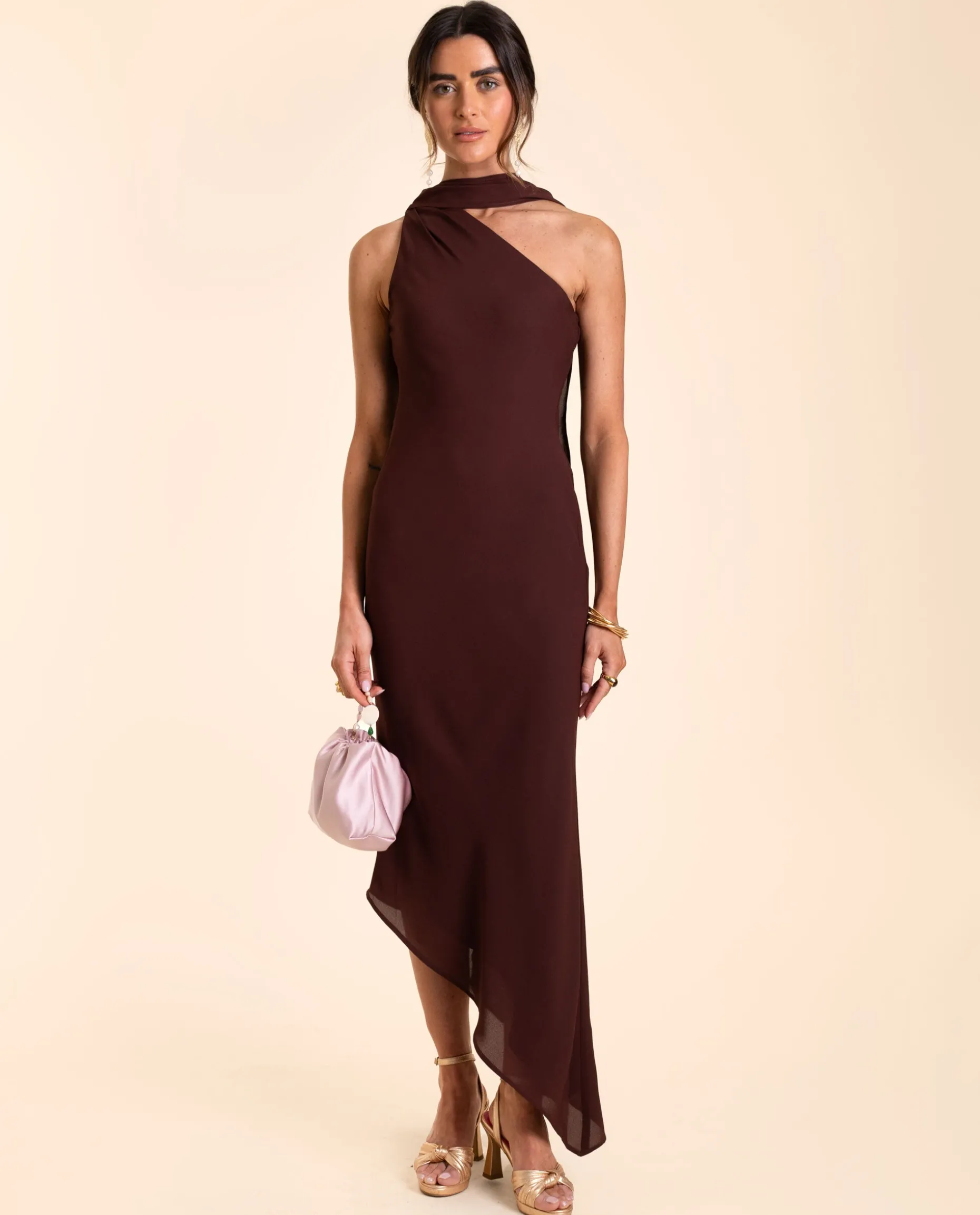 Un vestido con el que triunfarás en cualquier evento de la temporada es este vestido midi asimétrico con lazada al cuello y confeccionado en un color chocolate que sienta espectacular a todo tipo de pieles. El tejido es una doble gasa con mucha caída y gracias a su bajo asimétrico y fular al tono este vestido tiene un movimiento increíble al caminar. El color combina a la perfección con unas sandalias platino y complementos en dorado. Es uno de esos diseños con los que te verás muy estilizada y elegante.