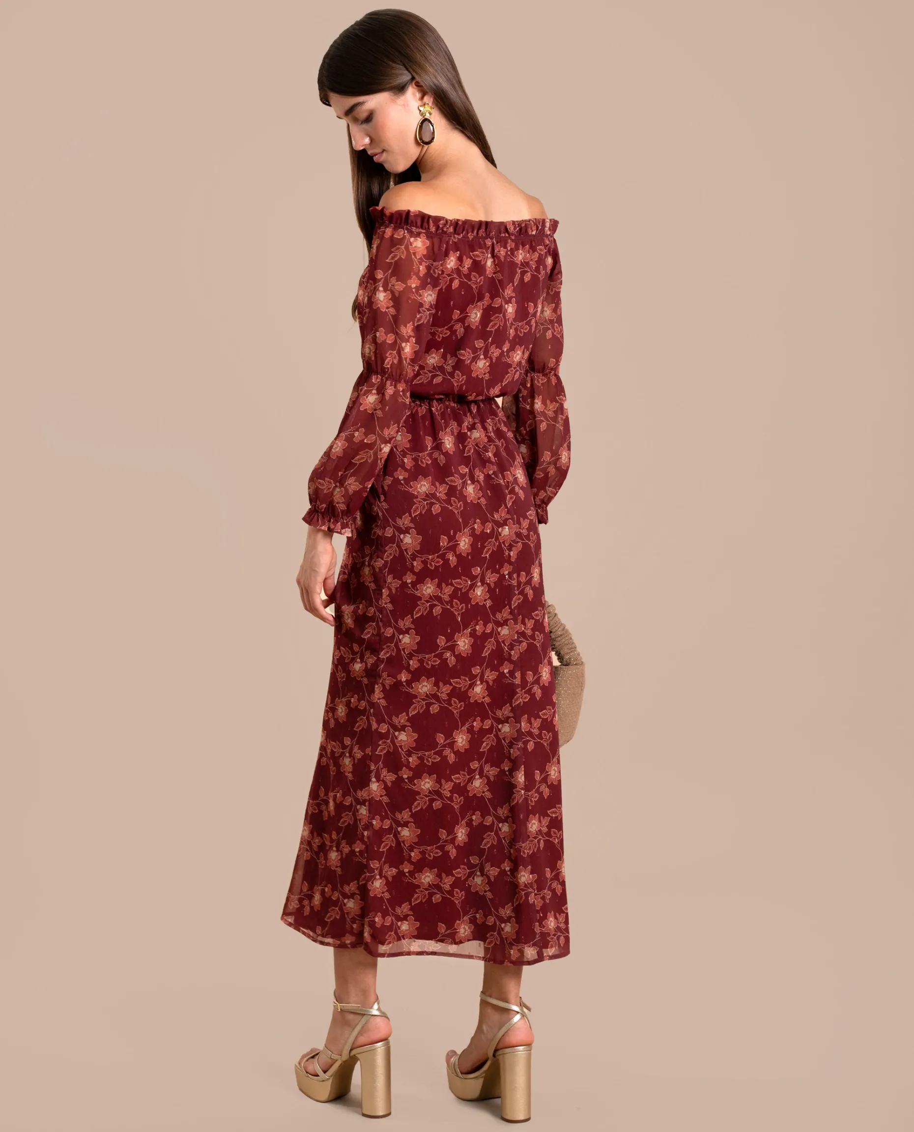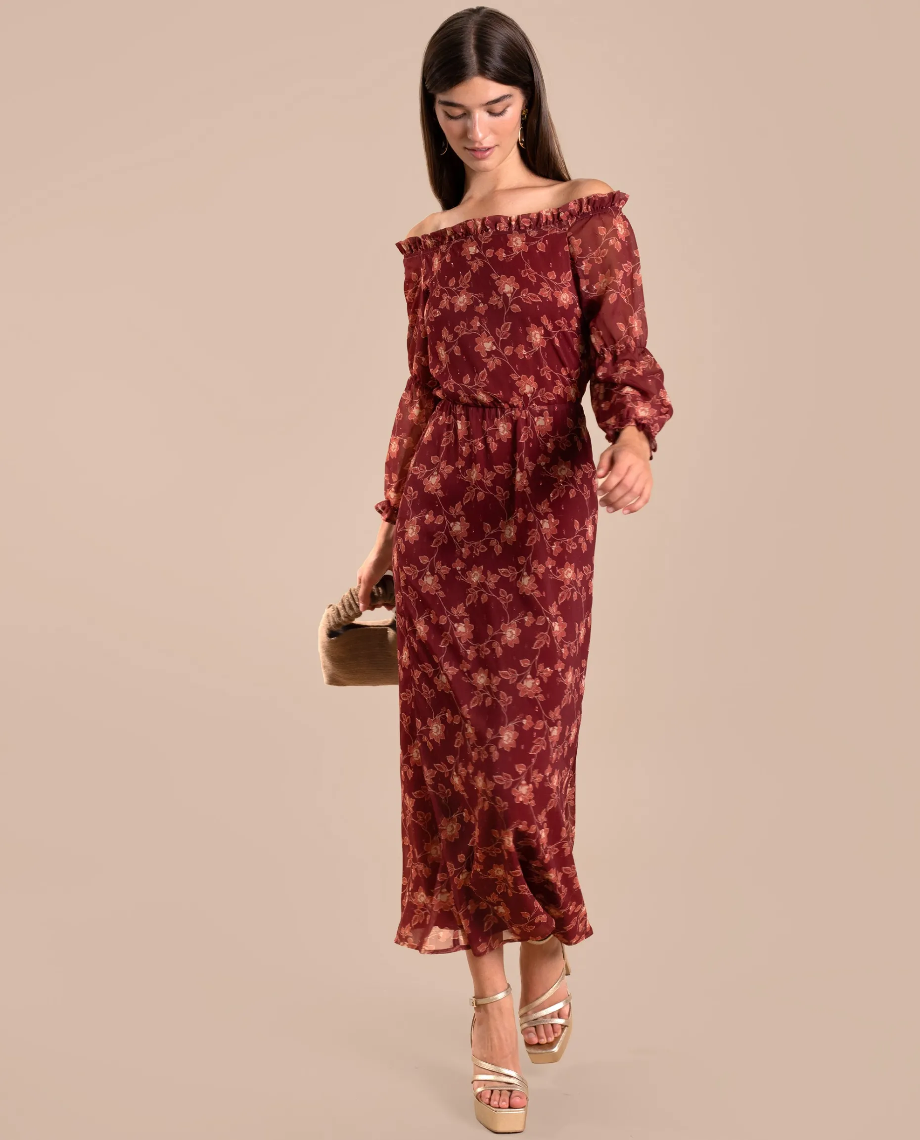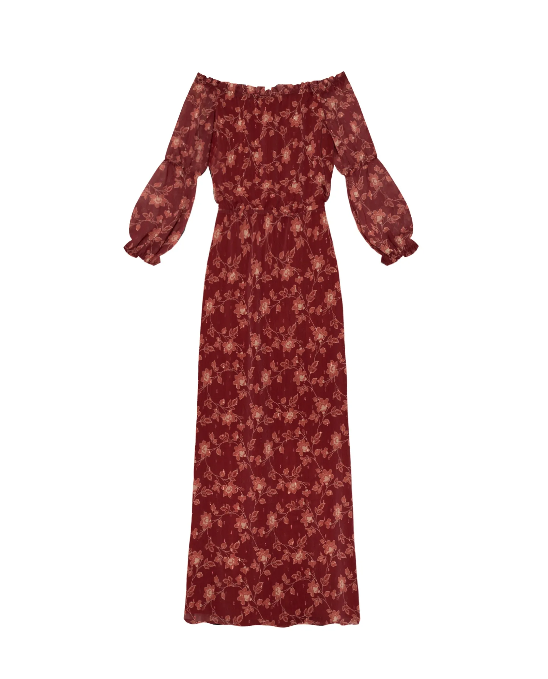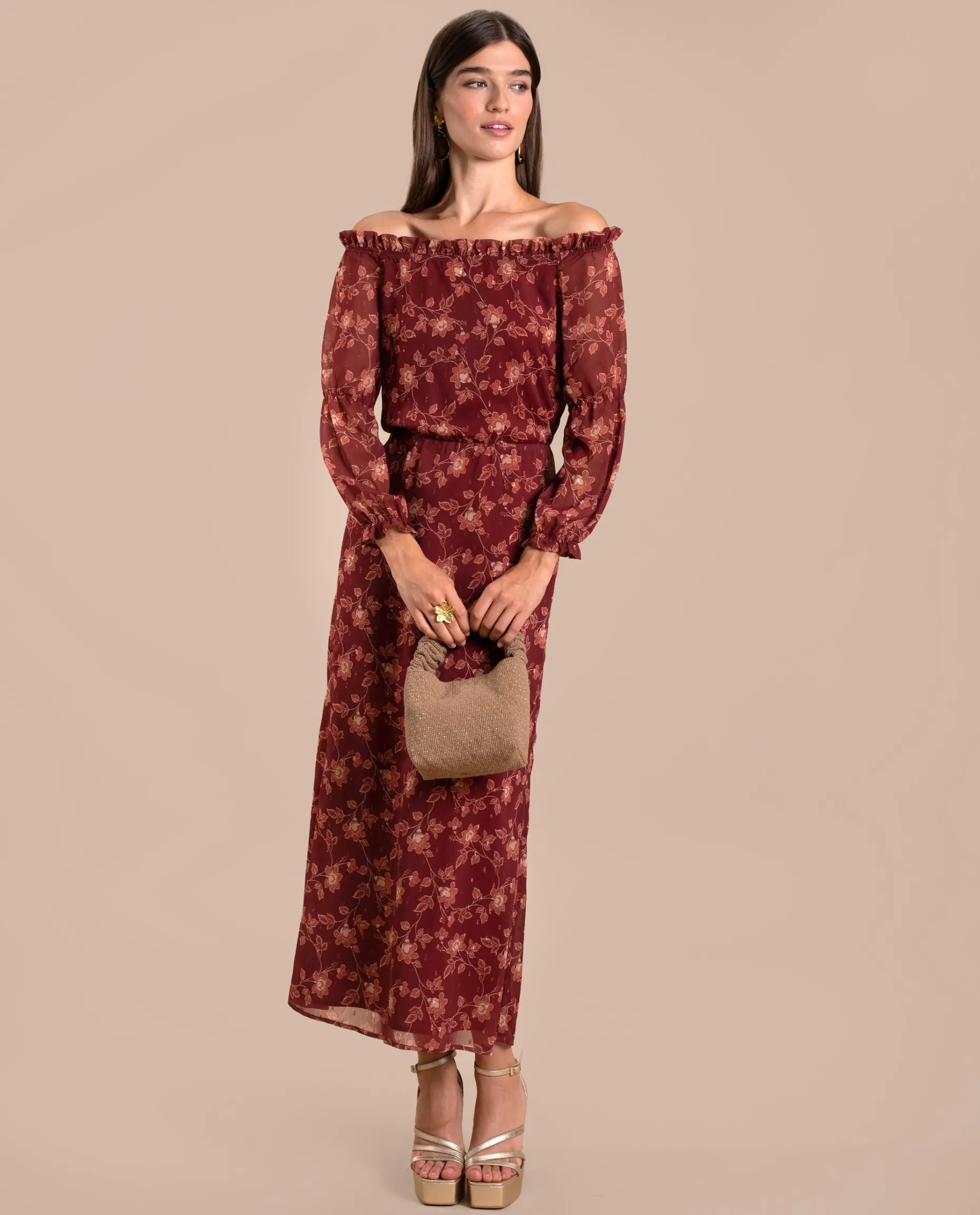 Este vestido destaca por su elegante diseño y estampado único, lo que lo convierte en la elección ideal para eventos. El escote palabra de honor, favorito entre las invitadas, deja los hombros al descubierto, aportando un aire sofisticado. La cintura engomada realza la figura, mientras que los volantes en el escote y las mangas añaden un toque romántico al look. El tejido, con hilos de lurex que aportan un sutil brillo, hacen de este vestido una pieza muy elegante.