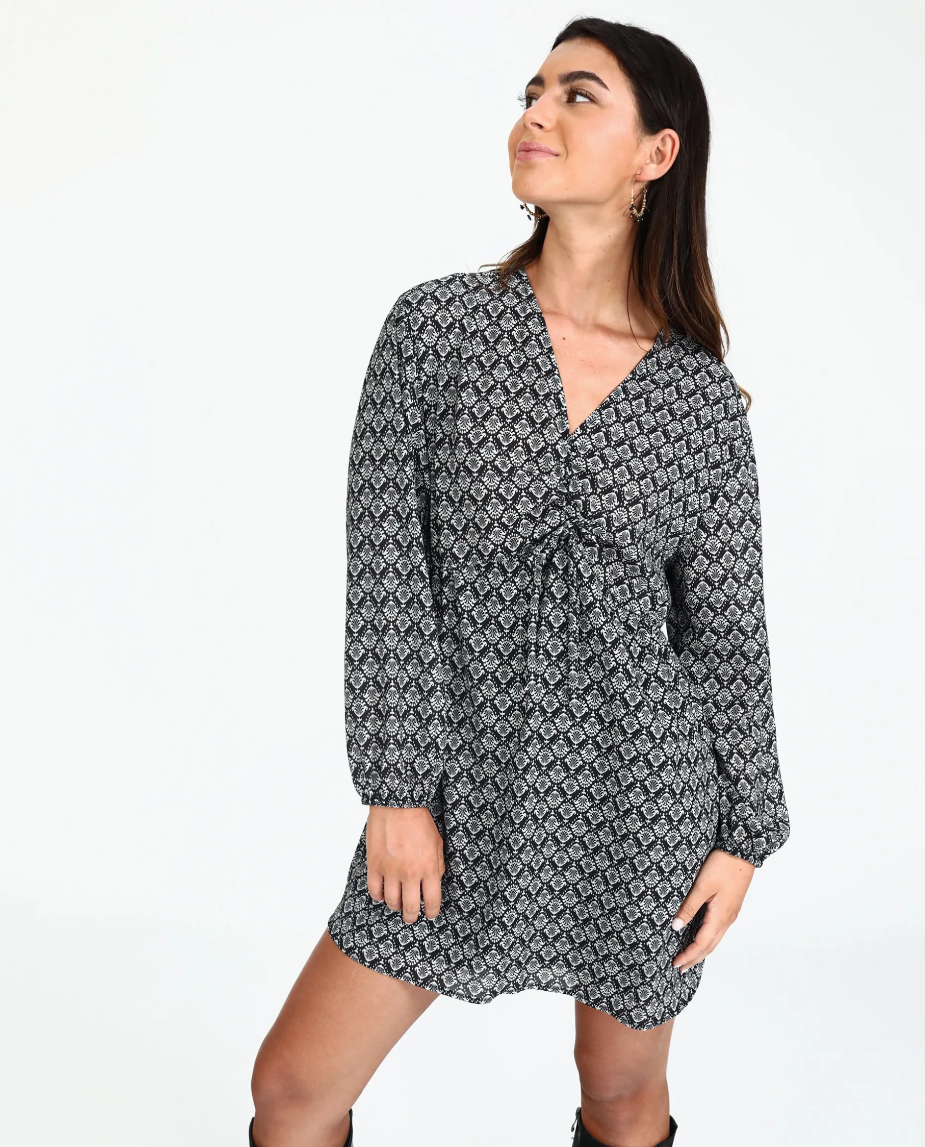 El vestido que todas vamos a querer para llevar durante toda la temporada! El diseño es estilo blusón, para que no marque nada y lo lleves muy cómodo en tu día a día. El estampado original es muy especial, diseñado 100% por nosotras desde cero. Este vestido tiene el escote en pico fruncido con el detalle de una lazada y las mangas ligeramente abullonadas. Los vestidos cortos nunca son suficientes, así que añádelo ya a tu armario!