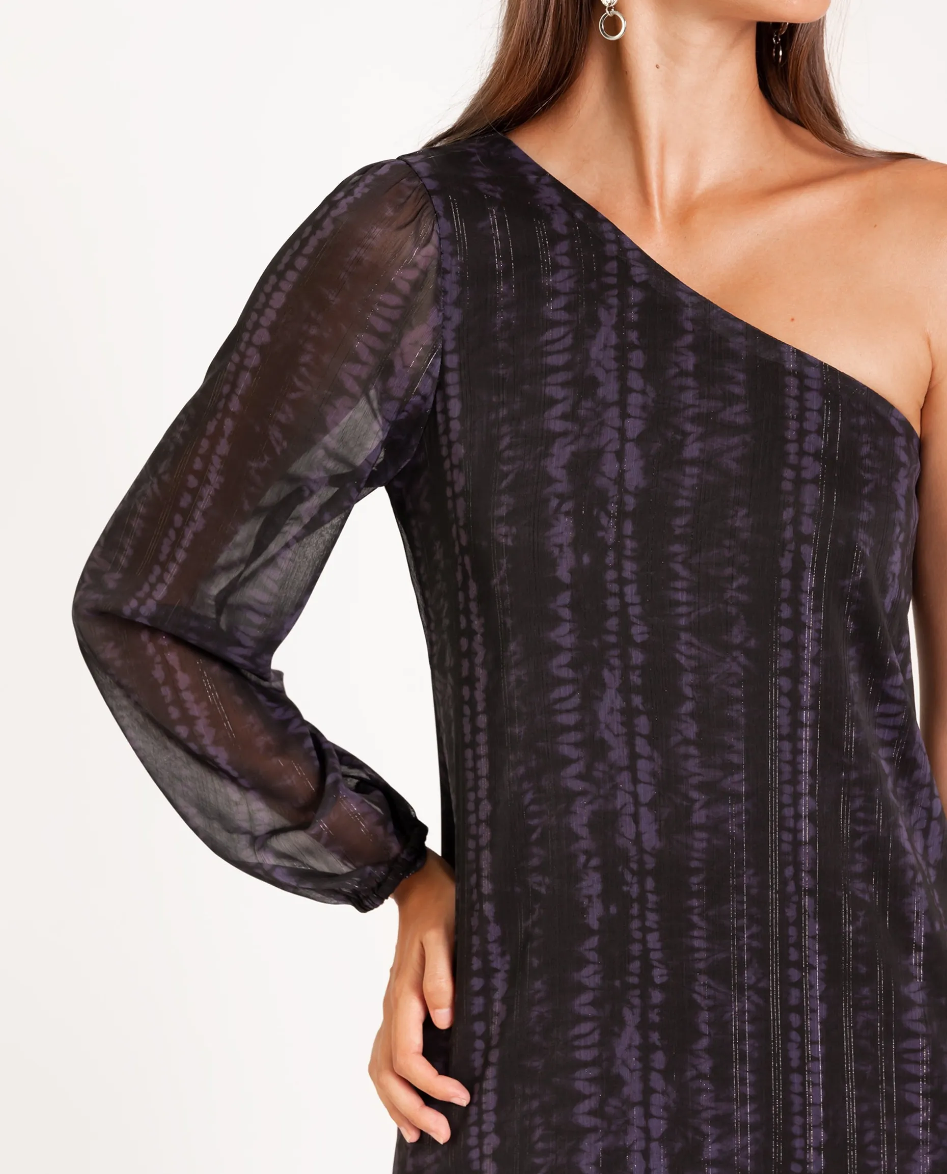 Uno de los vestidos favoritos que nos recuerda a esos planes con amigas que se alargan hasta el amanecer. El escote asimétrico, el corte evasé para que no marque nada (y muy favorecedor) y manga larga abullonada hacen que sea un vestido que llevarás en mil ocasiones. El estampado es muy especial, tie-dye en tonos morados con el detalle de hilo de lúrex, que le da un toque de brillo a este look. Nos encanta con botas altas y pendientes largos, con este vestido estarás ready para cualquier plan!