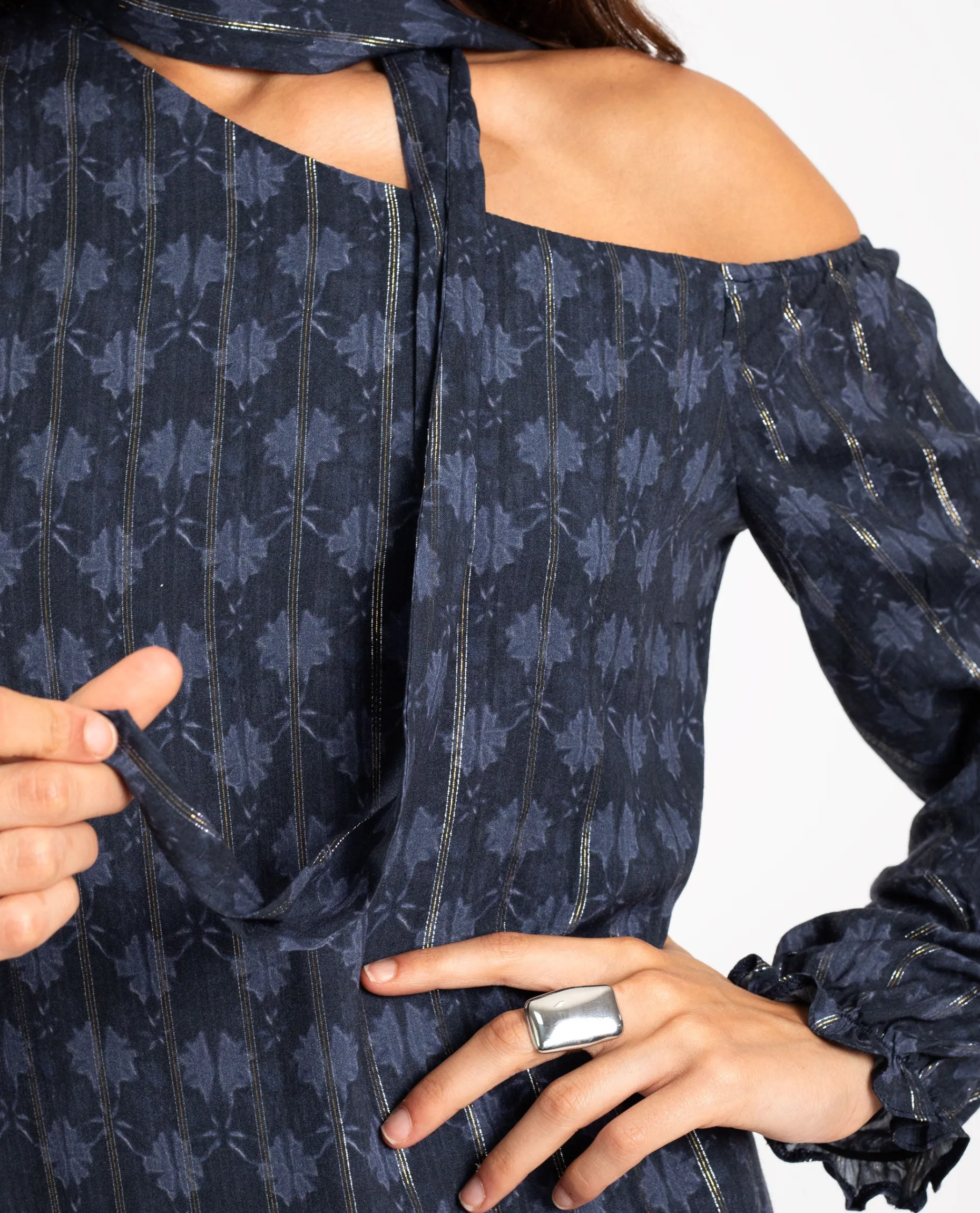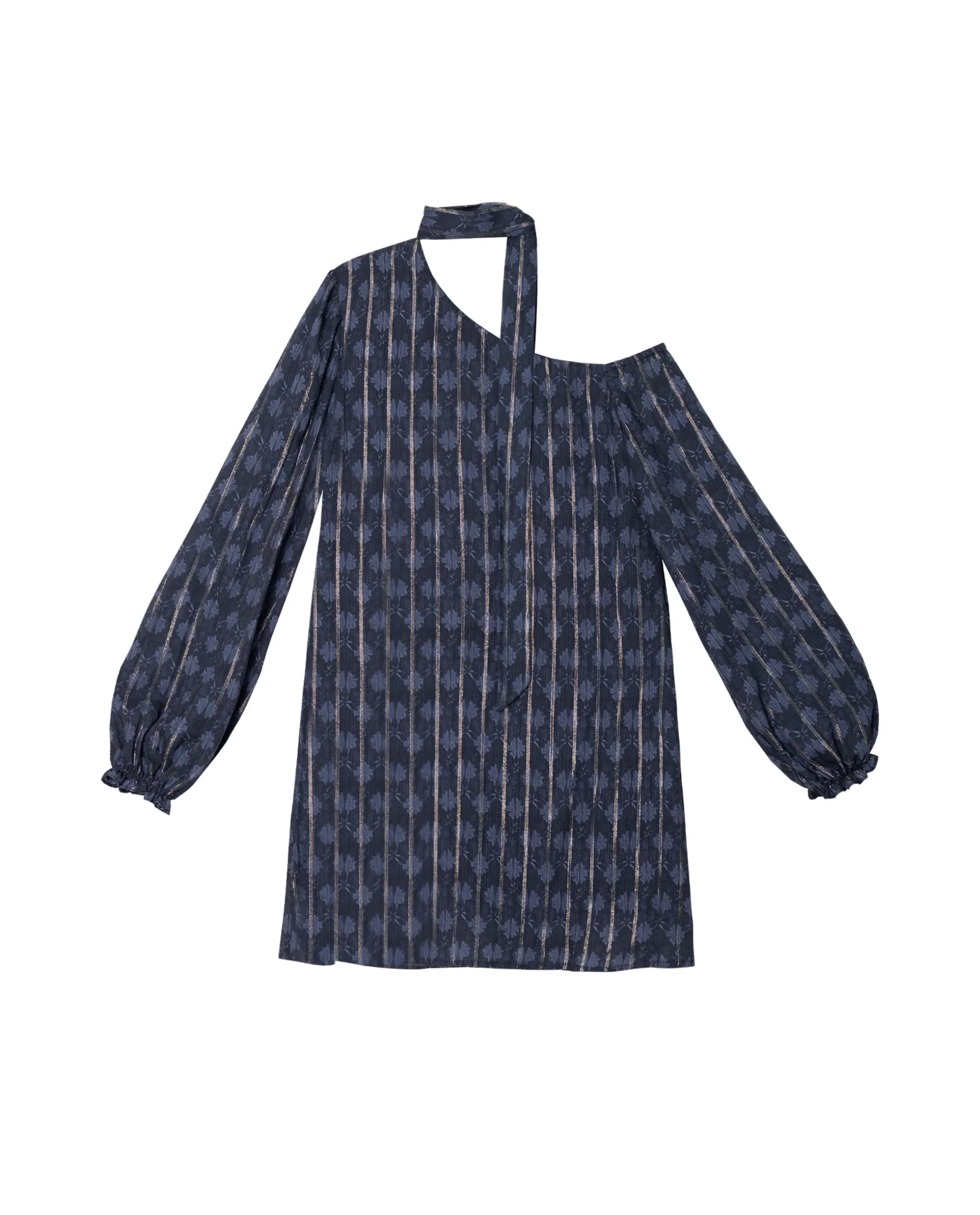 Estamos seguras de que este vestido se convertirá en tu favorito porque lo puedes llevar en cualquier ocasión! Está confeccionado en un tejido especial con tonos azul marino combinado hilos metalizados que añaden brillo al look. Tiene un escote asimétrico que deja un hombro un descubierto y mangas largas con puños elásticos. Además, incluye una lazada al cuello que le da un toque extra de estilo.