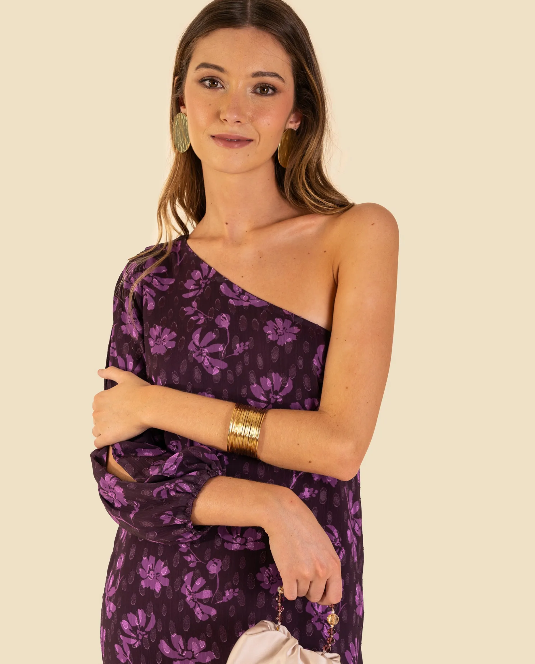 Este vestido se convierte en una opción segura para acompañarte en un evento especial. Diseñado con un patrón fluido que sienta a la perfección a todo tipo de siluetas. Escote asimétrico, manga larga con abertura y vuelo en el bajo, un acierto para conseguir un look de invitada sofisticado. Su estampado de flores en tonos morados hacen que sea un acierto total para cualquier tipo de evento.