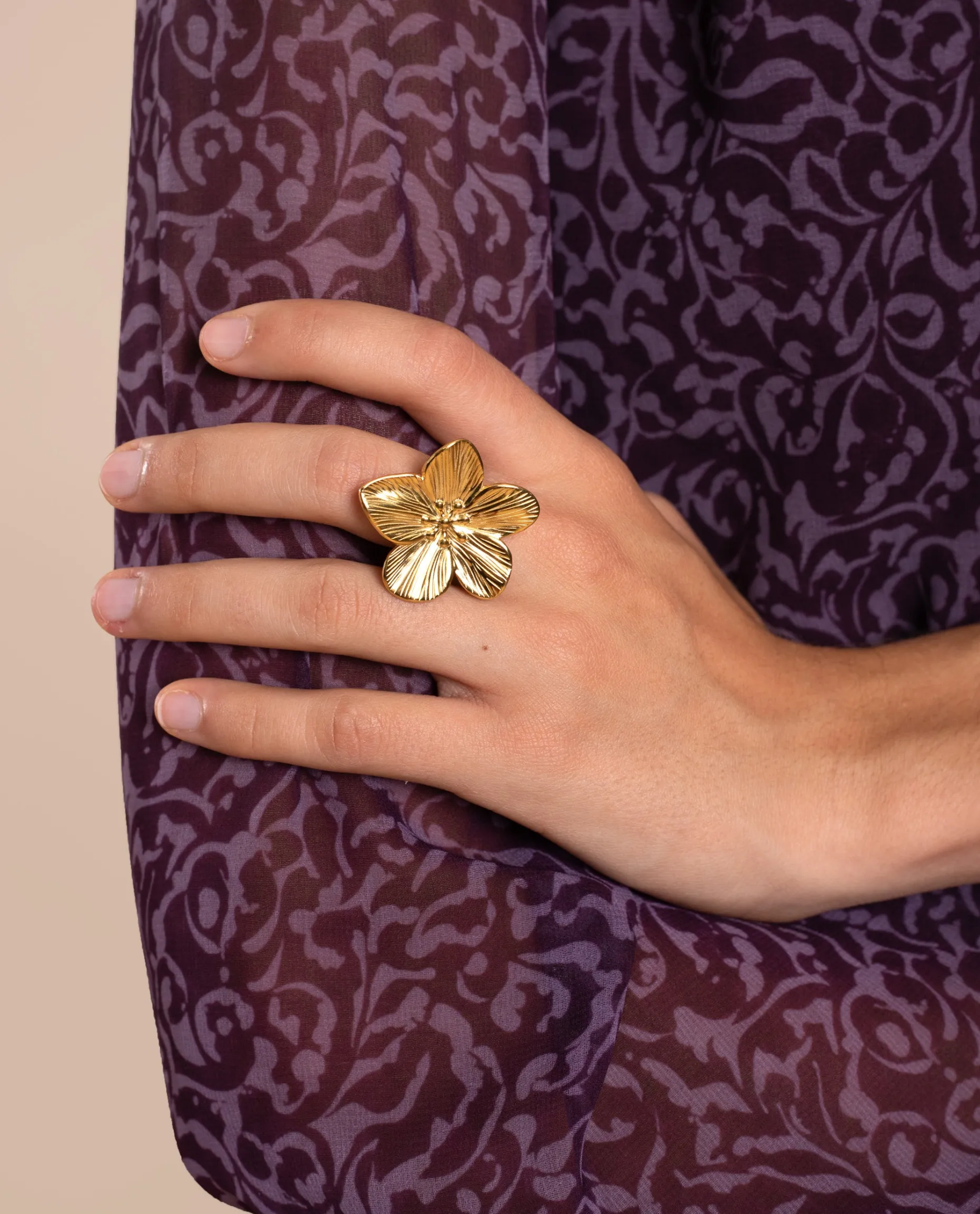Este anillo de flor tamaño maxi tiene un elegante diseño que querrás llevar en tus ocasiones más especiales. Tiene un tono dorado brillante y su tamaño es ajustable. Si eres amante de los accesorios originales, hazte con este anillo!