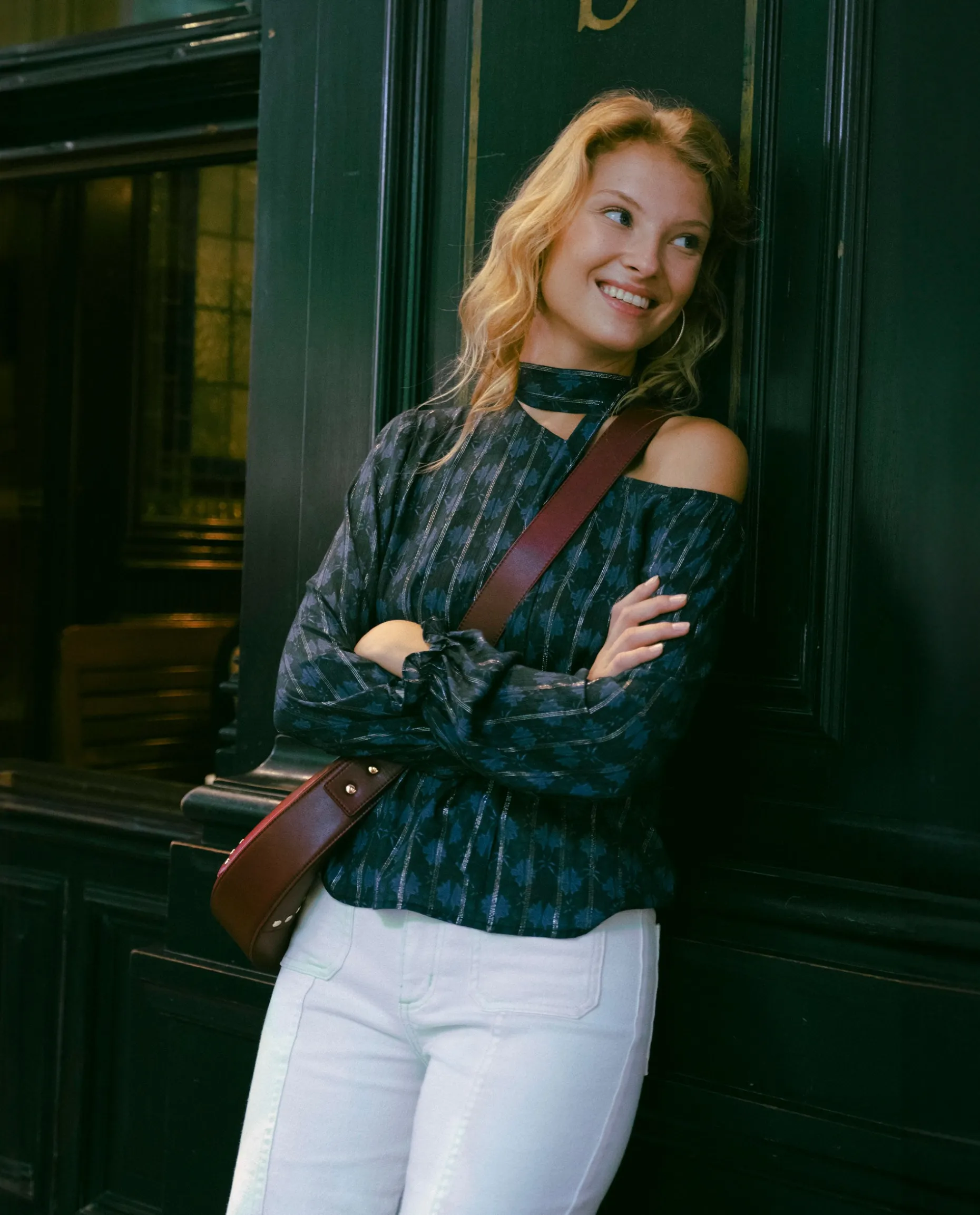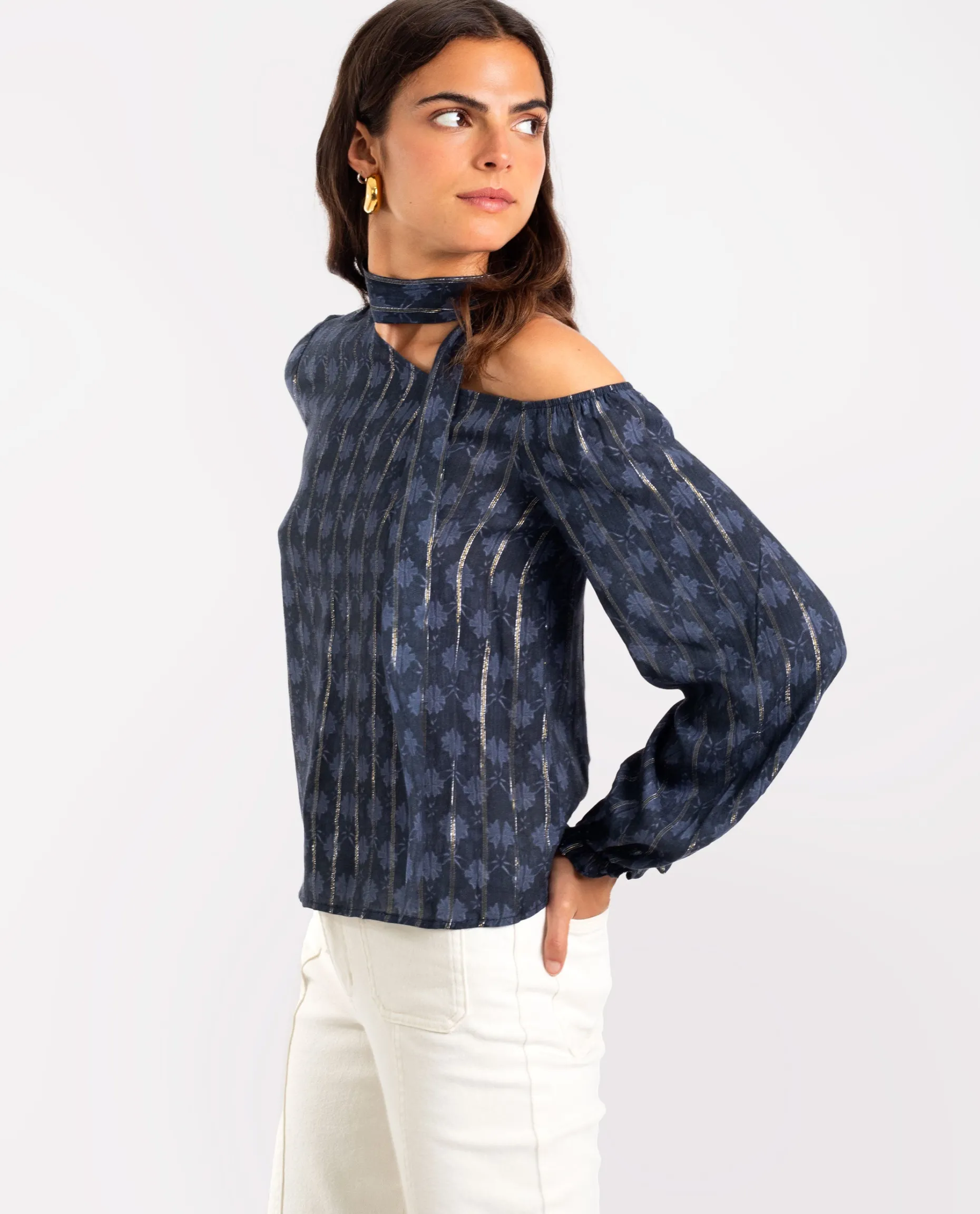 Estamos seguras de que esta blusa se convertirá en tu favorita porque la puedes llevar en cualquier ocasión! Está confeccionada en un tejido especial con tonos azul marino combinado hilos metalizados que añaden brillo al look. Tiene un escote asimétrico que deja un hombro un descubierto y mangas largas con puños elásticos. Además, incluye una lazada al cuello que le da un toque extra de estilo. Combínala con nuestros pantalones crudos y complementos plateados!