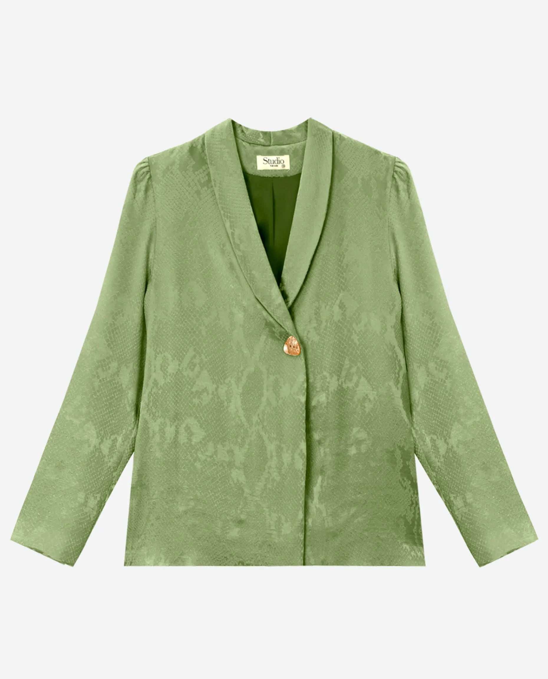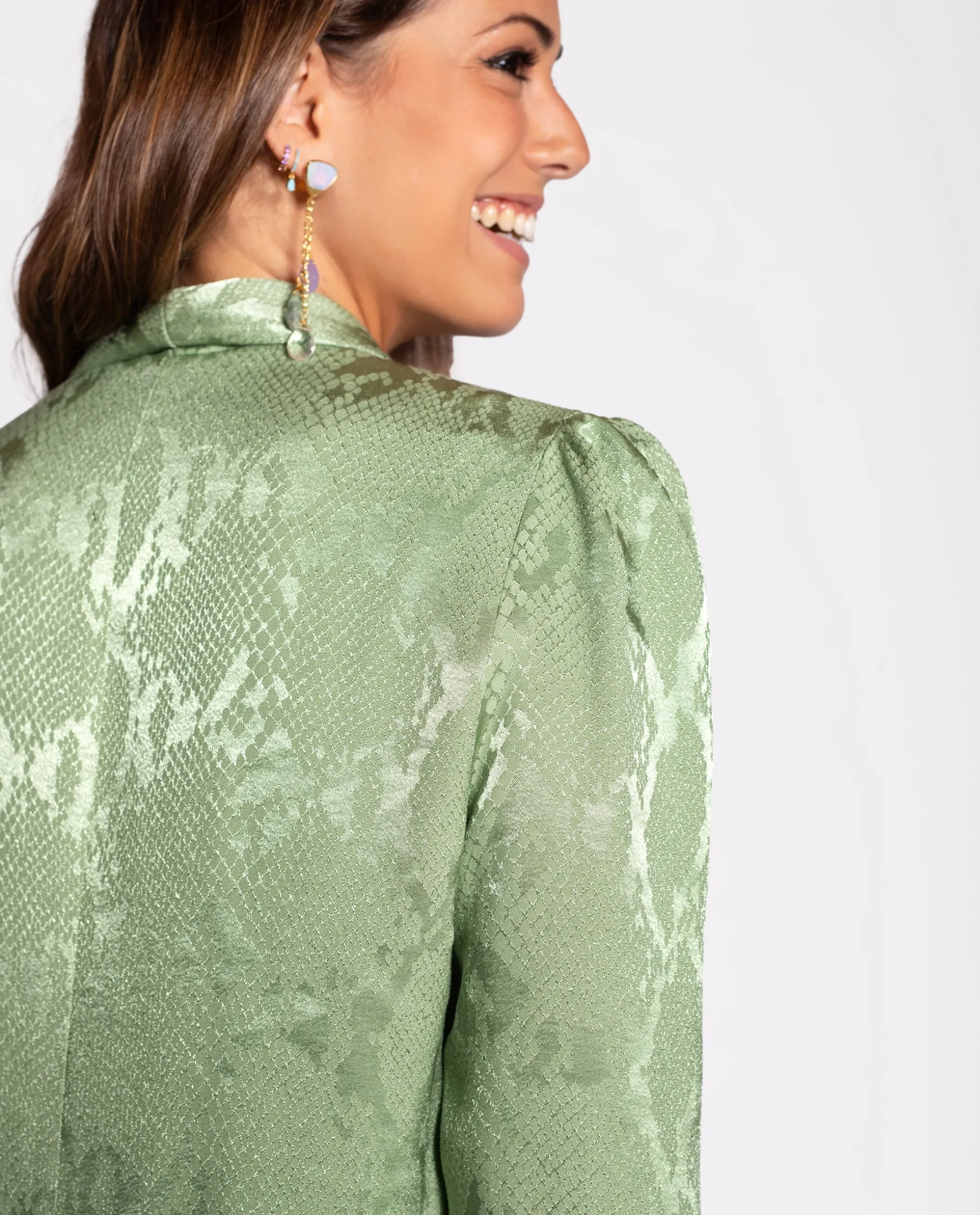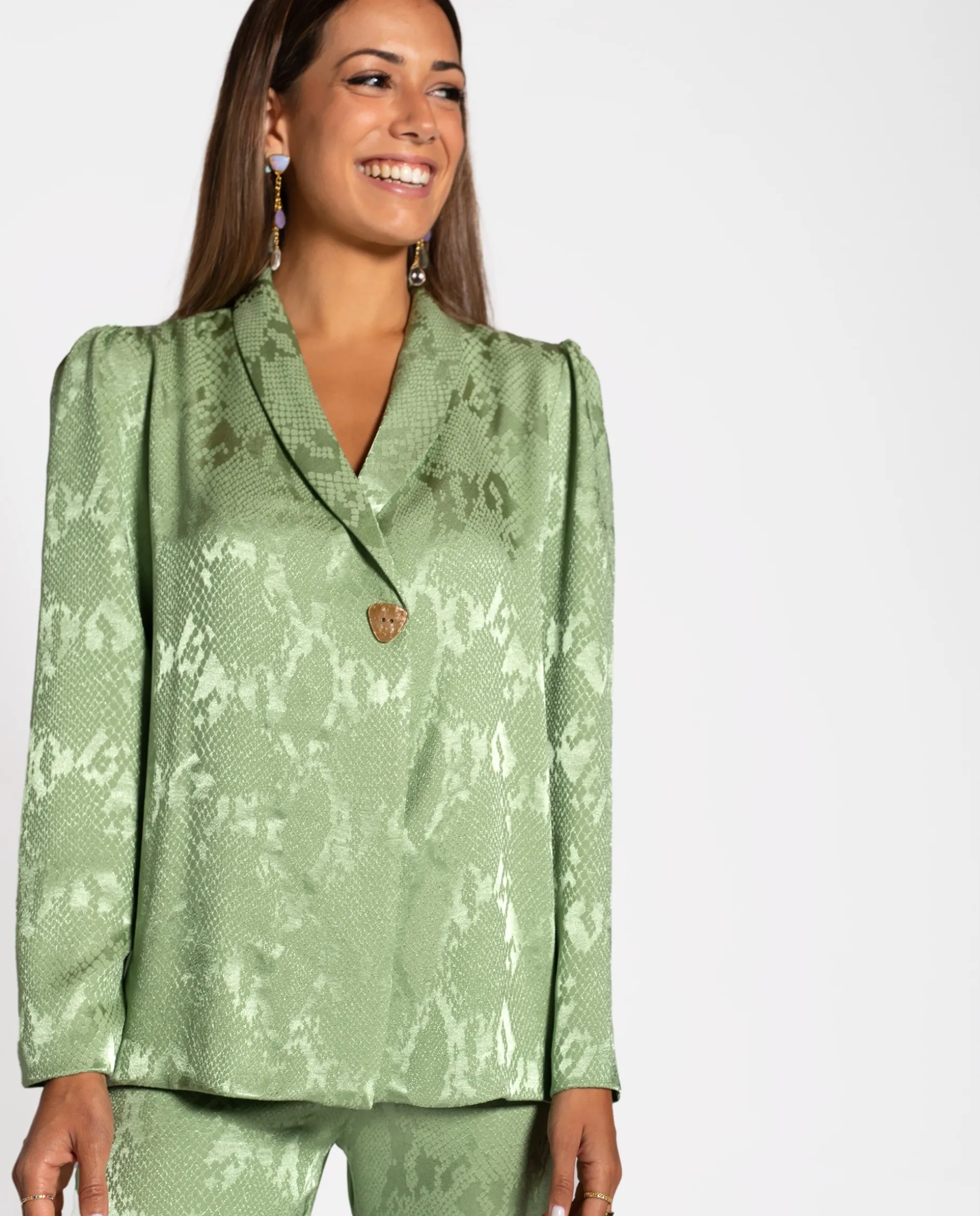Por fin en THE-ARE el traje de chaqueta más increíble para ser la invitada perfecta! Compuesto por una chaqueta entallada y un pantalón campana confeccionados en un tejido jacquard color verde y satinado. Blazer entallada, con botones y solapas.