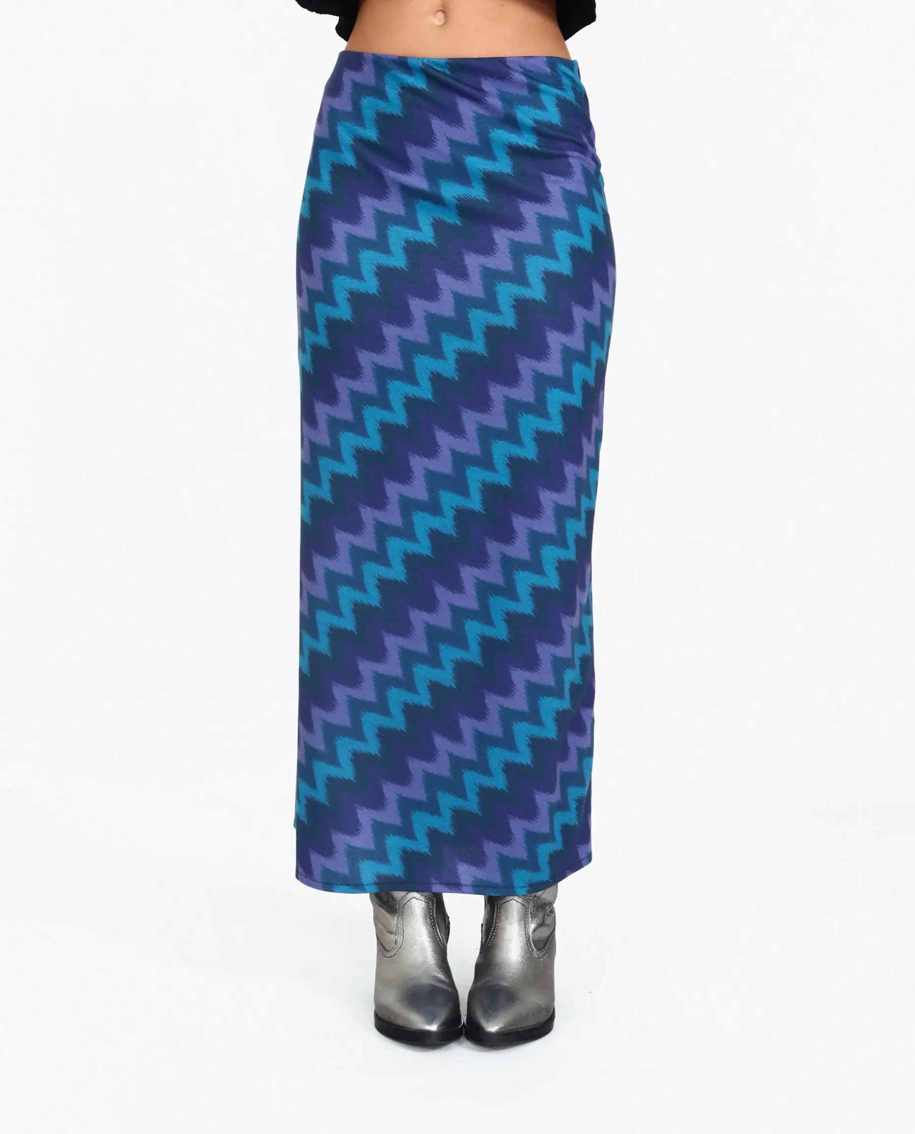 ¡El brillo de esta falda es espectacular! Su tejido es uno de los más especiales, combina las tonalidades azules sobre un estampado zig zag original. Esta falda destaca por su patrón de falda midi de tubo que gracias a su tejido elástico se adapta a tu silueta sin perder comodidad. Lleva una abertura lateral a la altura de la rodilla y la cintura alta elástica para que la puedas combinar tanto con un top corto como con una blusa, jersey o sudadera. Cuando la tengas en tus manos verás que los colores quedan increíbles. Aprovecha para pillártela porque esta temporada las faldas midi son máxima tendencia!โจ