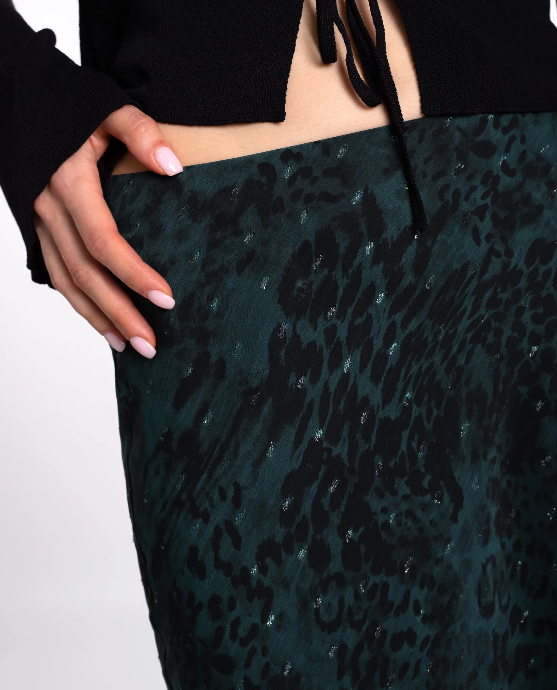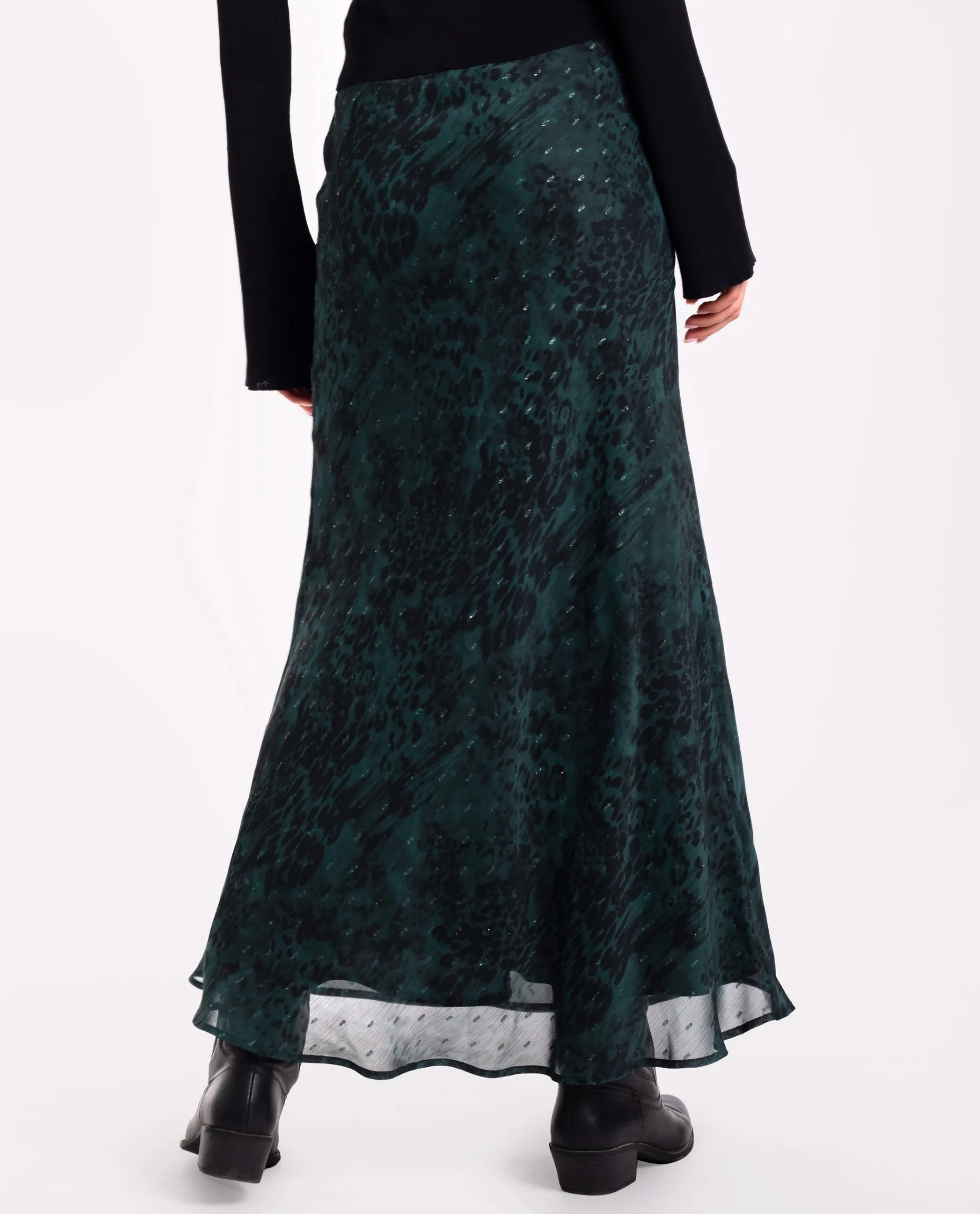 Esta falda tiene el largo midi perfecto para llevarla tanto con botas como con zapatillas, según el estilo que quieras darle. El estampado animal print, creado en tonos verdes y con hilos de lurex, aporta un brillo sutil que hace que este conjunto sea muy versátil y perfecto para llevar a diario y también en ocasiones especiales. ¡Combínala con la blusa a conjunto y consigue el look completo!