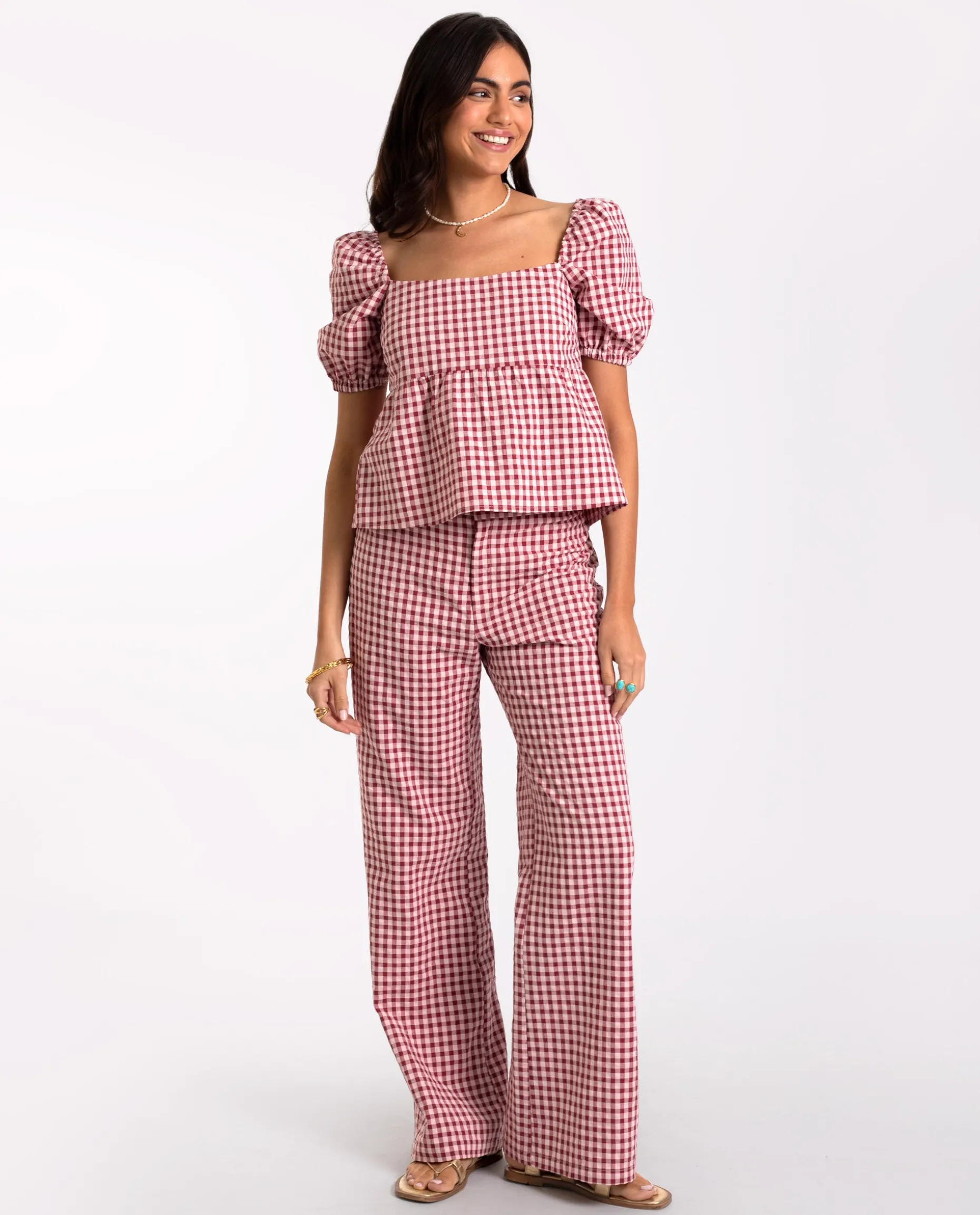 Flechazo a primera vista con este total look!๐ Inspirándonos en las últimas tendencias, hemos diseñado este conjunto de top y pantalón para acompañarte en todos tus planes de la temporada. Se compone de una blusa con estampado vichy y mangas engomadas al hombro, y un pantalón de corte recto con talle alto. El pantalón tiene la cintura elástica que se ajusta perfectamente. Son muy cómodos y ligeros de llevar. Combínalo con la blusa Rita y elevará tu look a otro nivel.๐