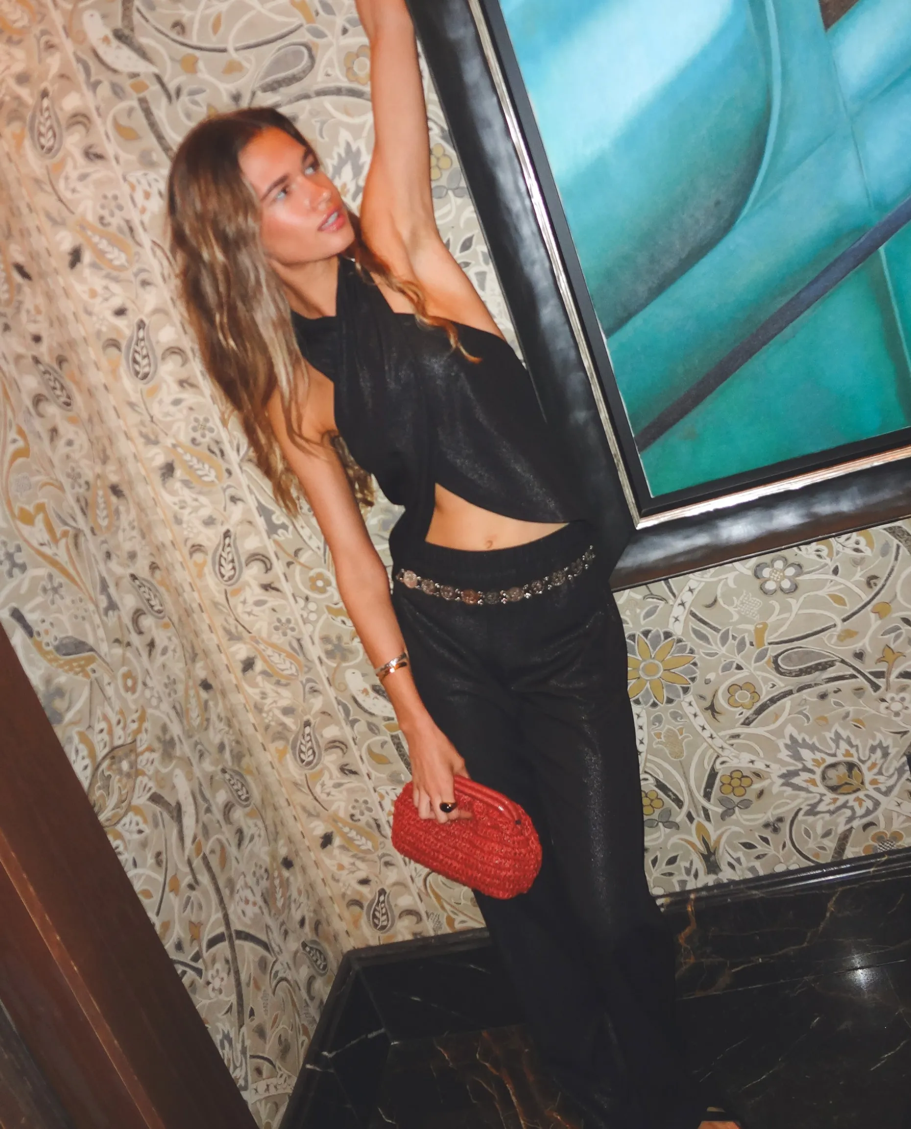Necesitas este conjunto para verano! Su tejido es uno de los más especiales, ligero con un poco de brillo dorado. Los pantalones son largos, con la cintura elástica para un ajuste perfecto. Como detalle, tiene dos aberturas laterales en el bajo, una de nuestras tendencias favoritas para poder lucir sandalia. El top del mismo tejido tiene un patrón cruzado con escote halter que puedes regular como más te guste. Este total look nos parece ideal para una de esas noches de verano que no quieres que acaben nunca!๐