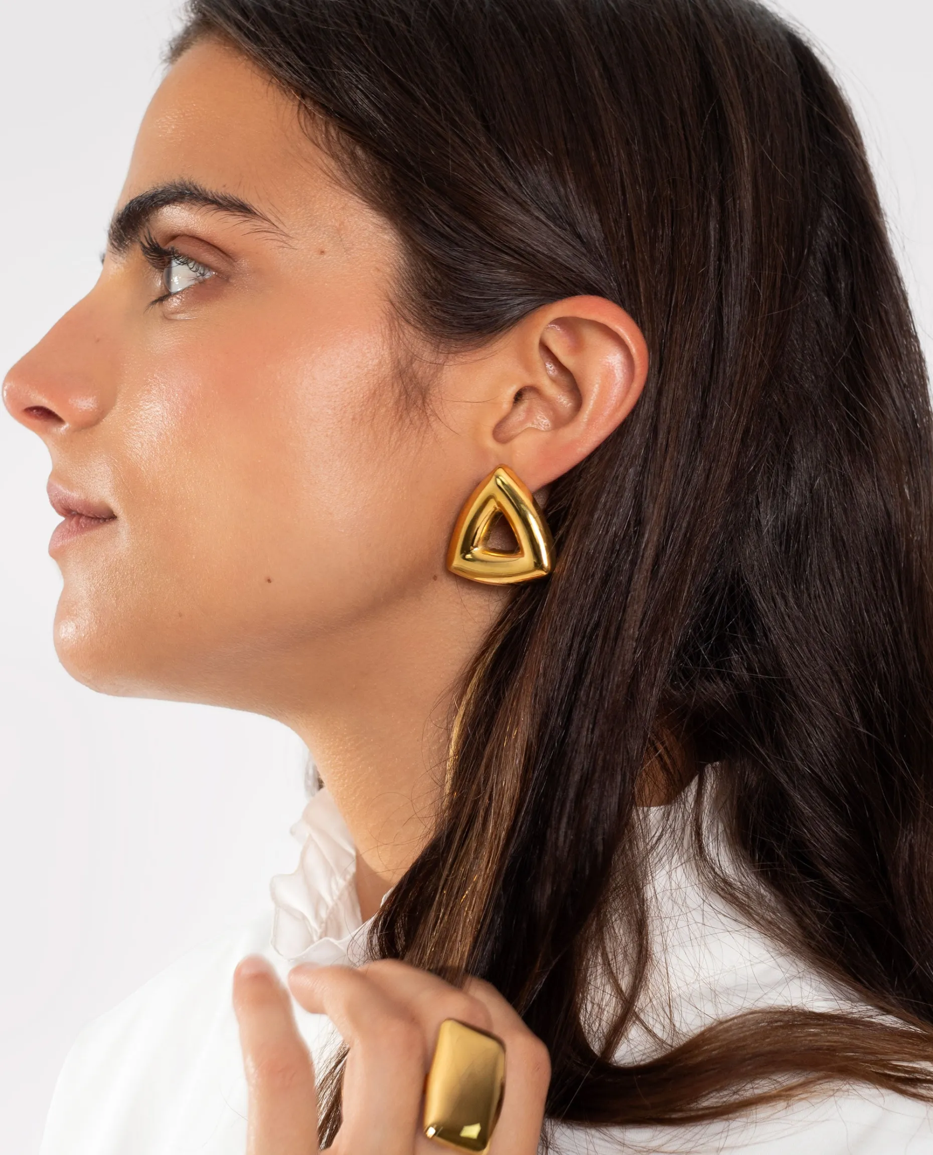 Los Pendientes Cleo son originales y diferentes gracias a su diseño triangular. Bañado en Oro de 18kt y hecho de acero inoxidable para que te acompañe aún más tiempo, estos pendientes gruesos con forma hinchada son ideales para llevar tanto a diario como en ocasiones más especiales.