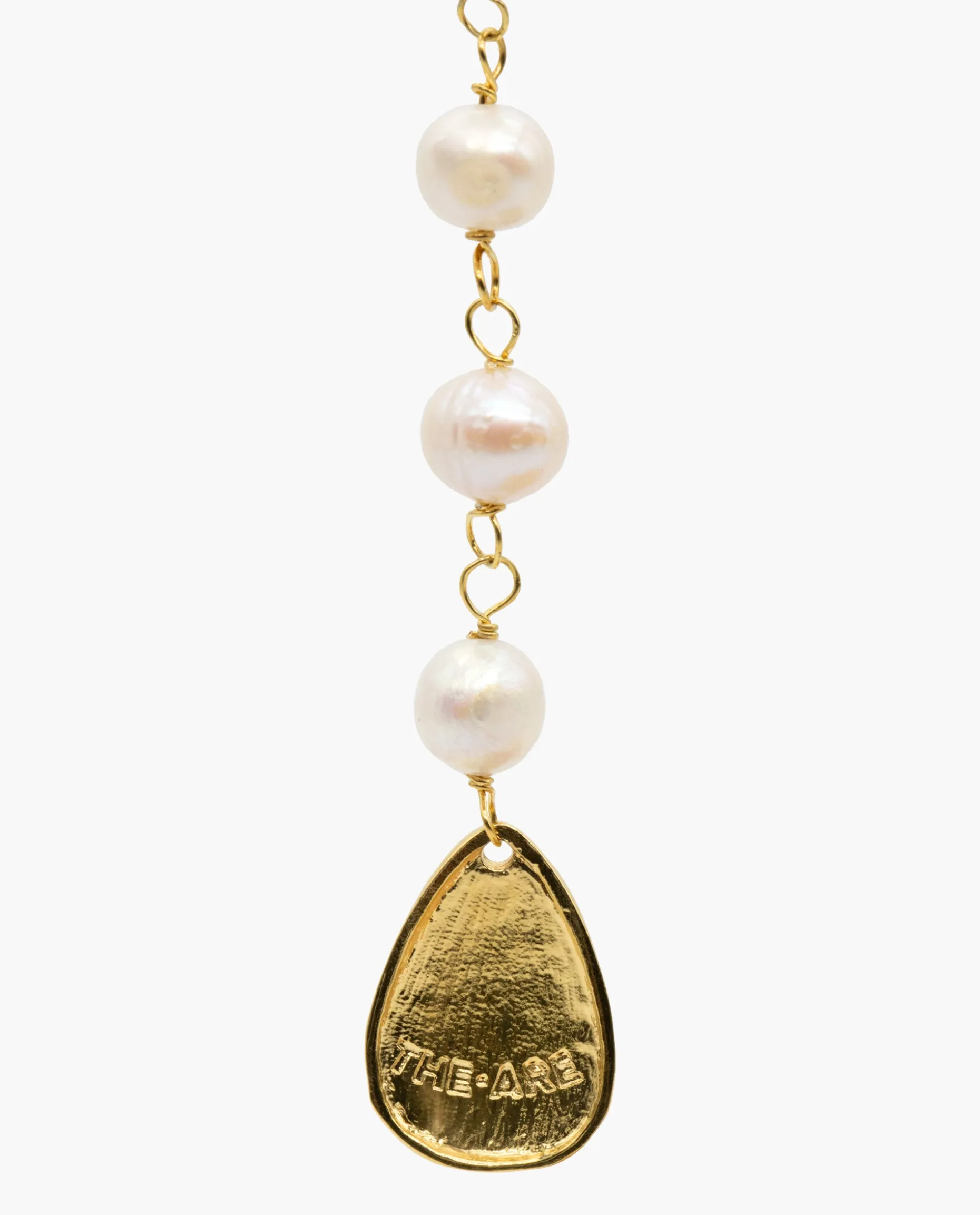 Los Pendientes Dream Pearls son los pendientes largos que estabas buscando para tu próximo evento.โจ Unos pendientes colgantes con 5 perlas naturales de tamaño irregular y bañados en Oro de 18kt que conquistarán a todos los invitados. Está compuesto por un botón con textura y en el extremo una gota irregular con la parte trasera grabada con THE-ARE. Son muy ligeros y tienen un movimiento precioso, favorecen mucho al rostro!!