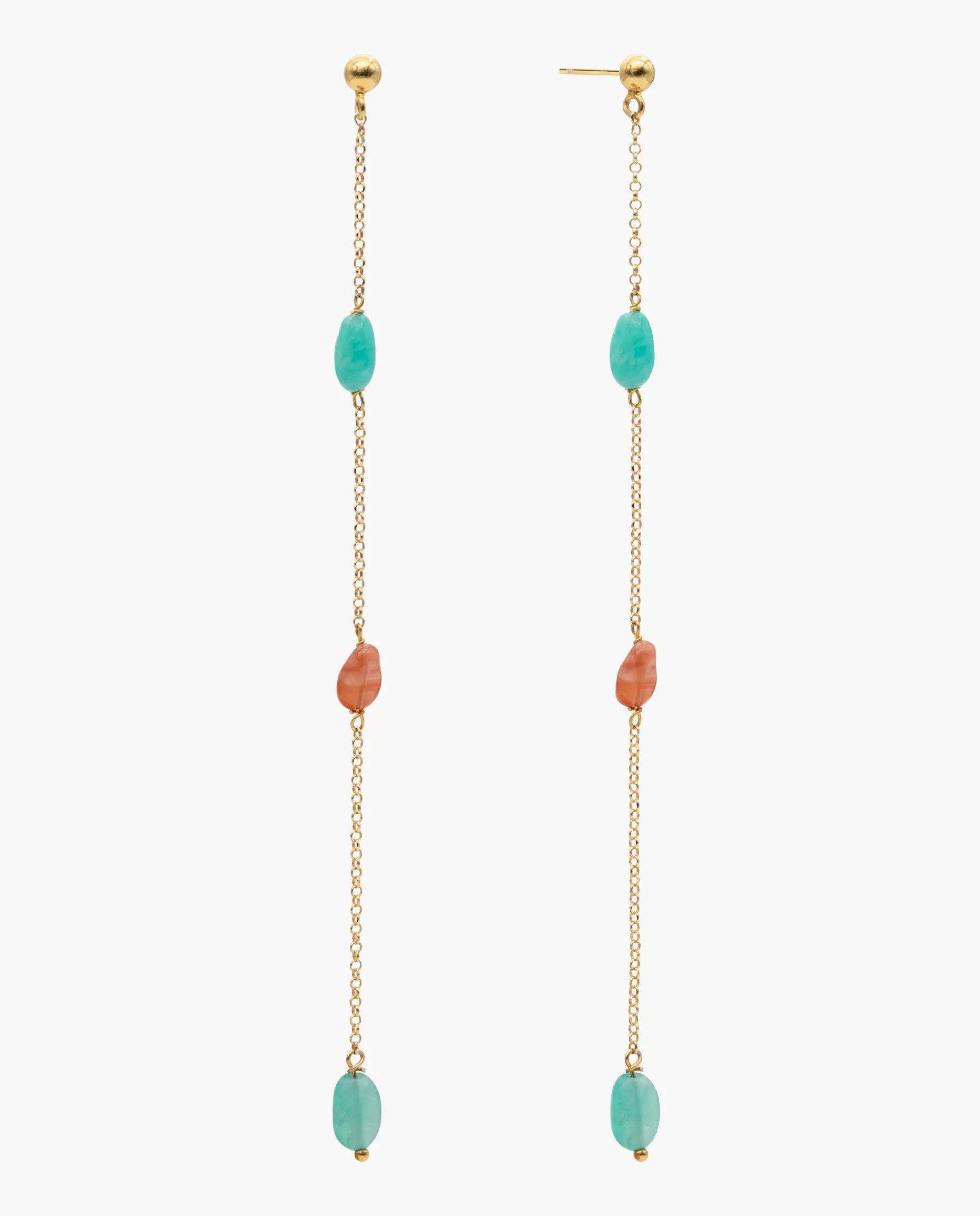 Una cascada de color para refrescar tus looks! Estos pendientes largos bañados en Oro de 18kt harán que tu look del verano sea el protagonista. Tienen mucho movimiento, compuesto por una cadena finada dorada y piedras naturales, por lo que el tamaño puede variar.