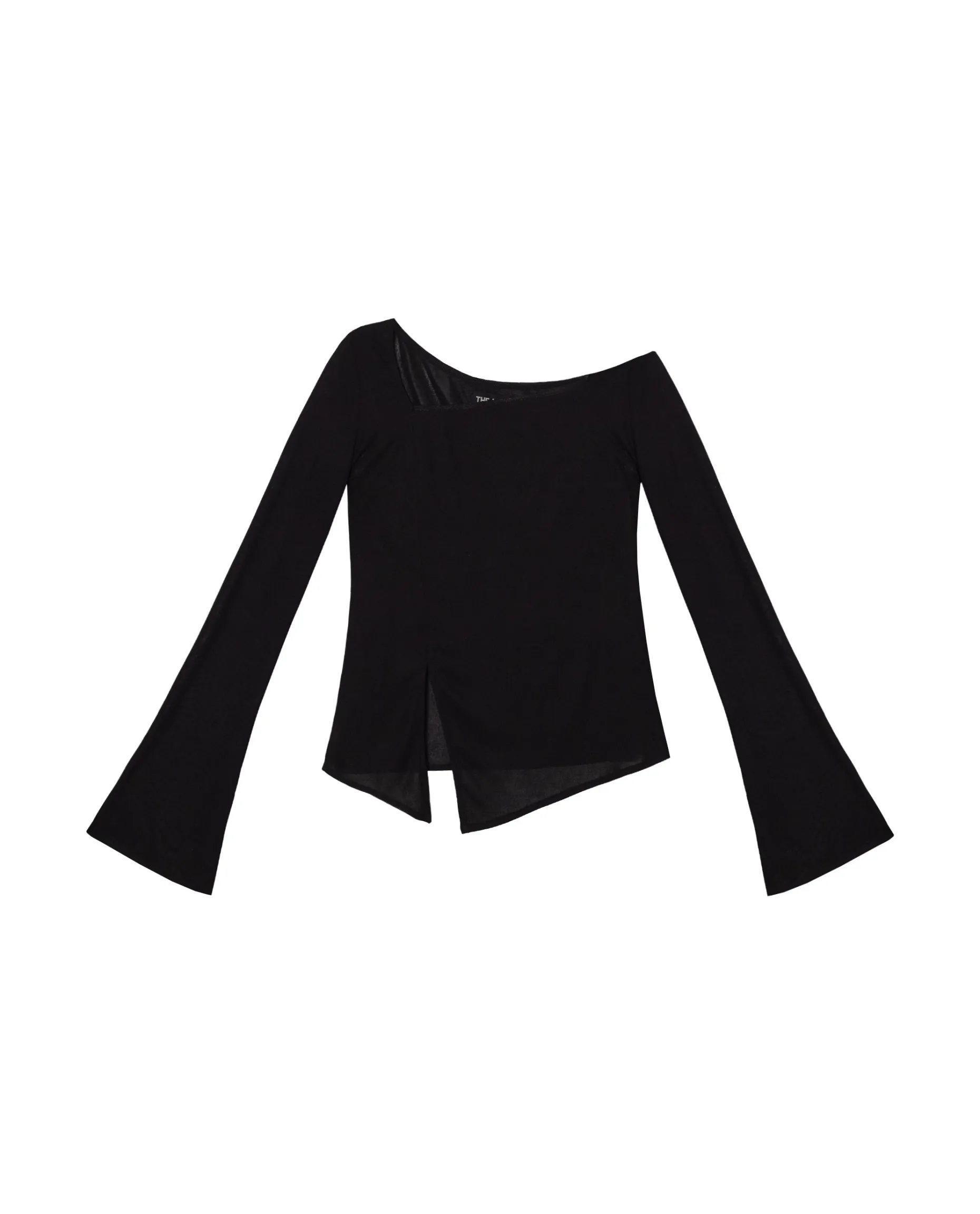 Este top es la opción perfecta para darle un toque original a cualquier look con unos jeans. El tejido es de punto elástico que se adapta a ti y destaca por su diseño asimétrico tanto en el escote como en el bajo. Tiene las mangas acampanadas, mientras que el escote asimétrico deja uno de los hombros al descubierto, aportando un toque sexy y elegante. El detalle del bajo abierto en dos picos le añade ese extra de estilo.