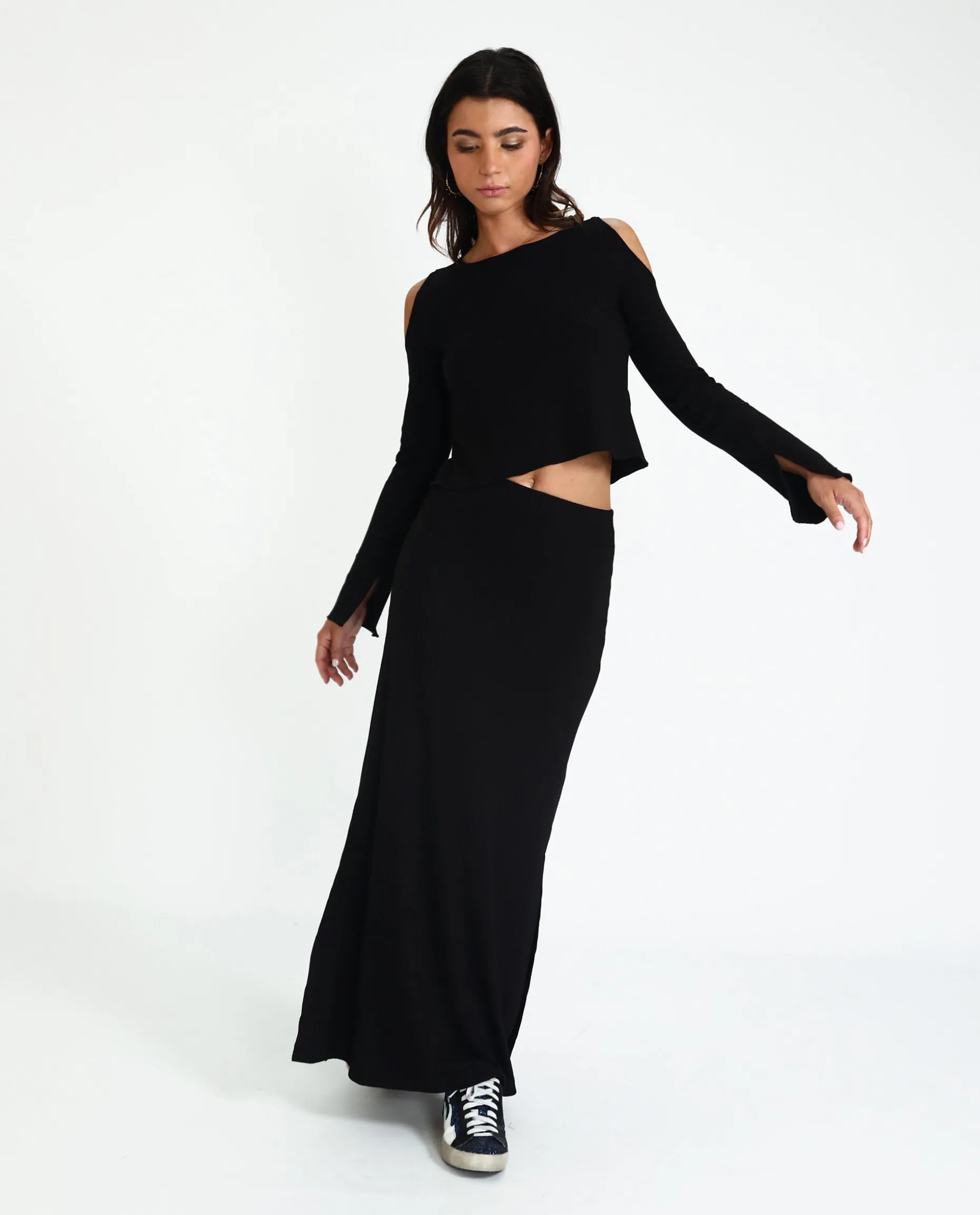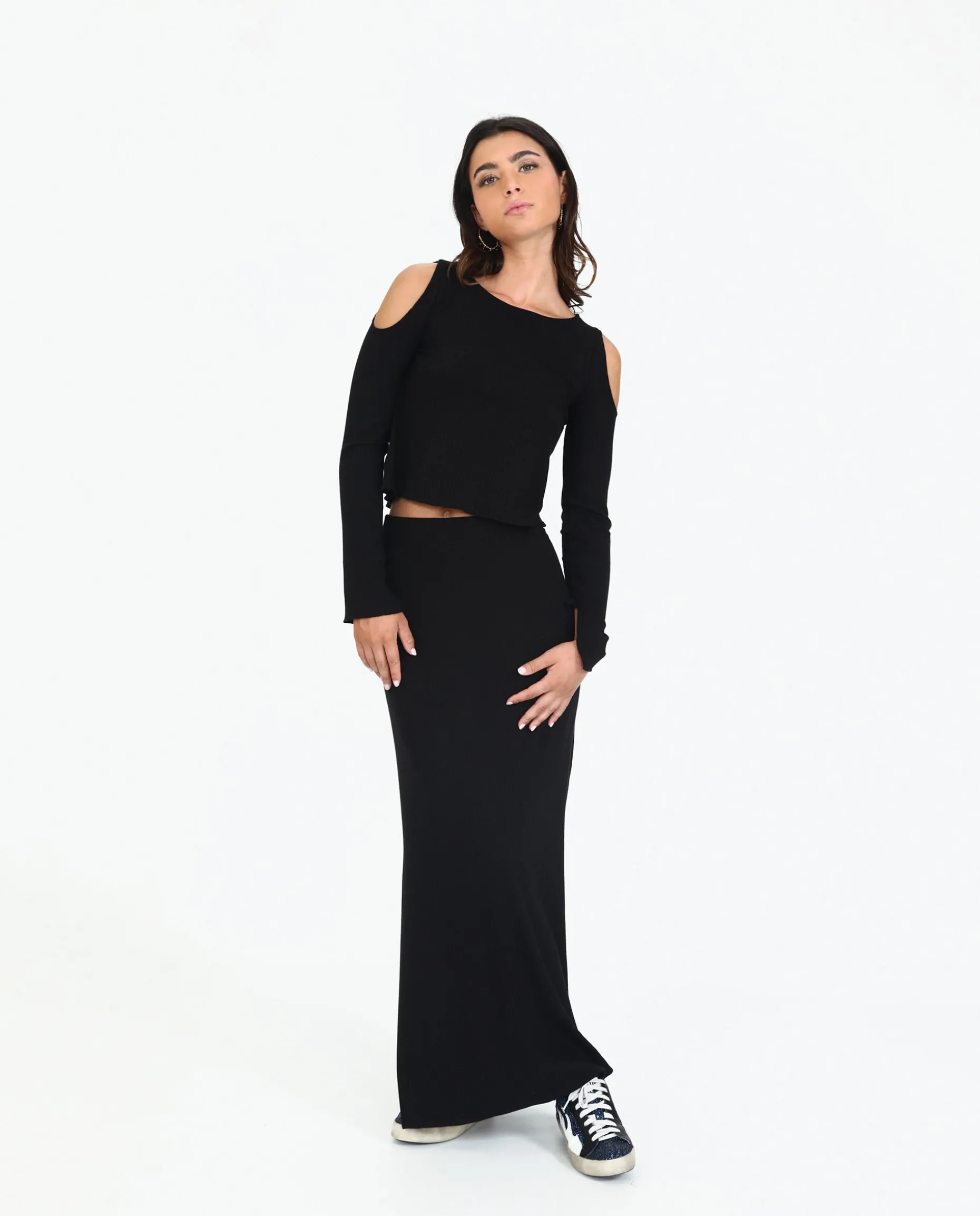 Este conjunto de dos piezas se convertirá en uno de tus favoritos nada más te lo pruebes. Nos encanta lo versátil que es este top, es una de esas prendas todoterreno que te pondrías para todo. Hemos elegido el mejor tejido, un punto de canalé elástico, muy suave y cómodo de llevar. El top es muy favorecedor, con los hombros al descubierto, la manga acampanada con el detalle de las aberturas en el puño y el escote redondo. Puedes combinarlo tanto con la fada a conjunto como con unos jeans, y siempre irás ideal.โจ