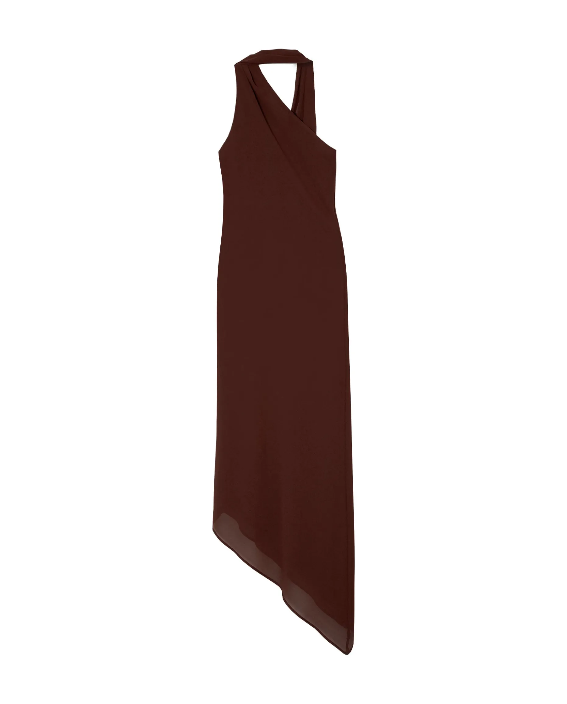 Un vestido con el que triunfarás en cualquier evento de la temporada es este vestido midi asimétrico con lazada al cuello y confeccionado en un color chocolate que sienta espectacular a todo tipo de pieles. El tejido es una doble gasa con mucha caída y gracias a su bajo asimétrico y fular al tono este vestido tiene un movimiento increíble al caminar. El color combina a la perfección con unas sandalias platino y complementos en dorado. Es uno de esos diseños con los que te verás muy estilizada y elegante.