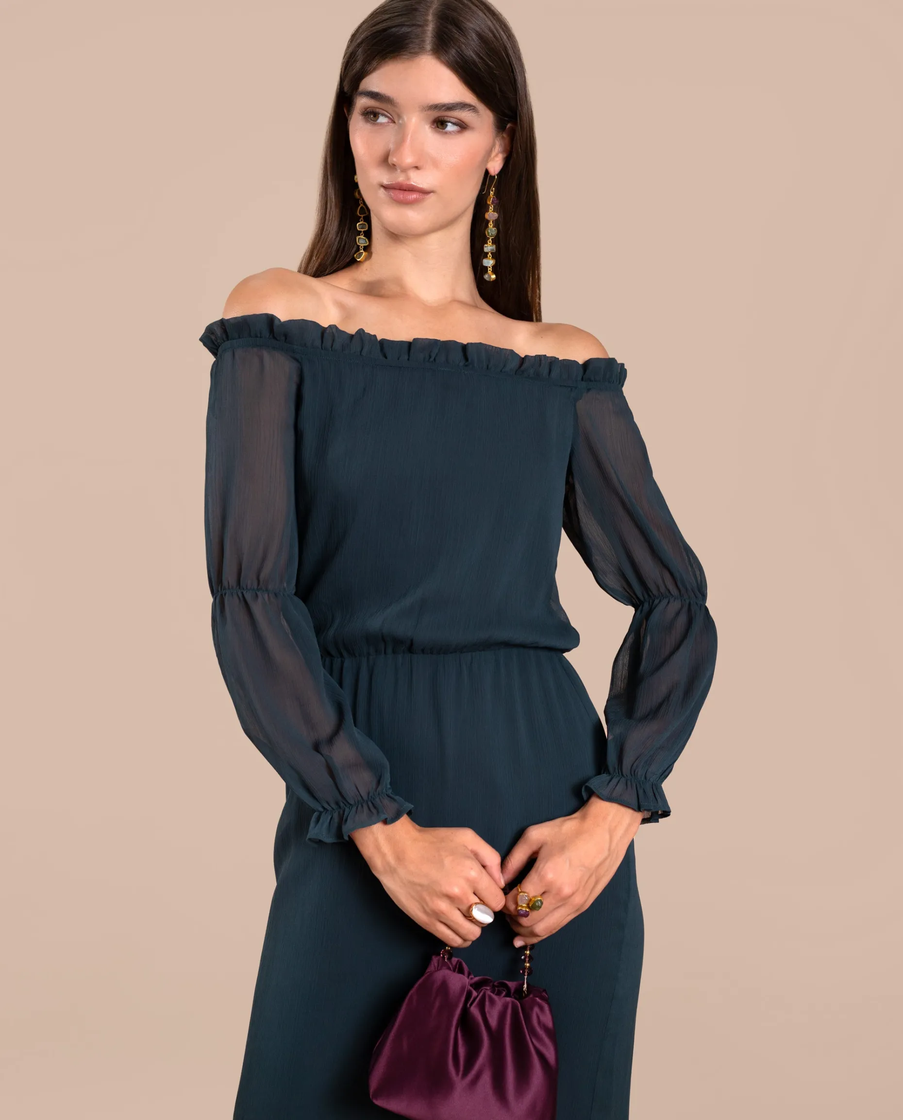 Este vestido destaca por su elegante diseño, lo que lo convierte en la elección ideal para eventos. El escote palabra de honor, favorito entre las invitadas, deja los hombros al descubierto, aportando un aire sofisticado. La cintura engomada realza la figura, mientras que los volantes en el escote y las mangas añaden un toque romántico al look. Confeccionado en gasa verde, este color es perfecto para lucir en cualquier ocasión especial.