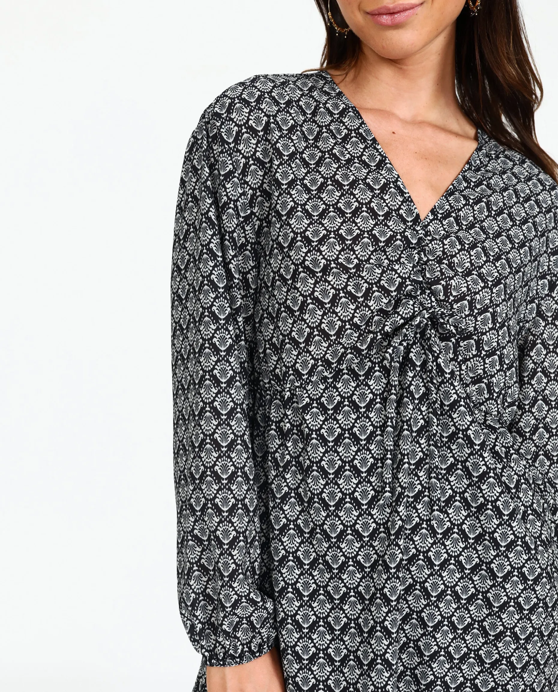 El vestido que todas vamos a querer para llevar durante toda la temporada! El diseño es estilo blusón, para que no marque nada y lo lleves muy cómodo en tu día a día. El estampado original es muy especial, diseñado 100% por nosotras desde cero. Este vestido tiene el escote en pico fruncido con el detalle de una lazada y las mangas ligeramente abullonadas. Los vestidos cortos nunca son suficientes, así que añádelo ya a tu armario!