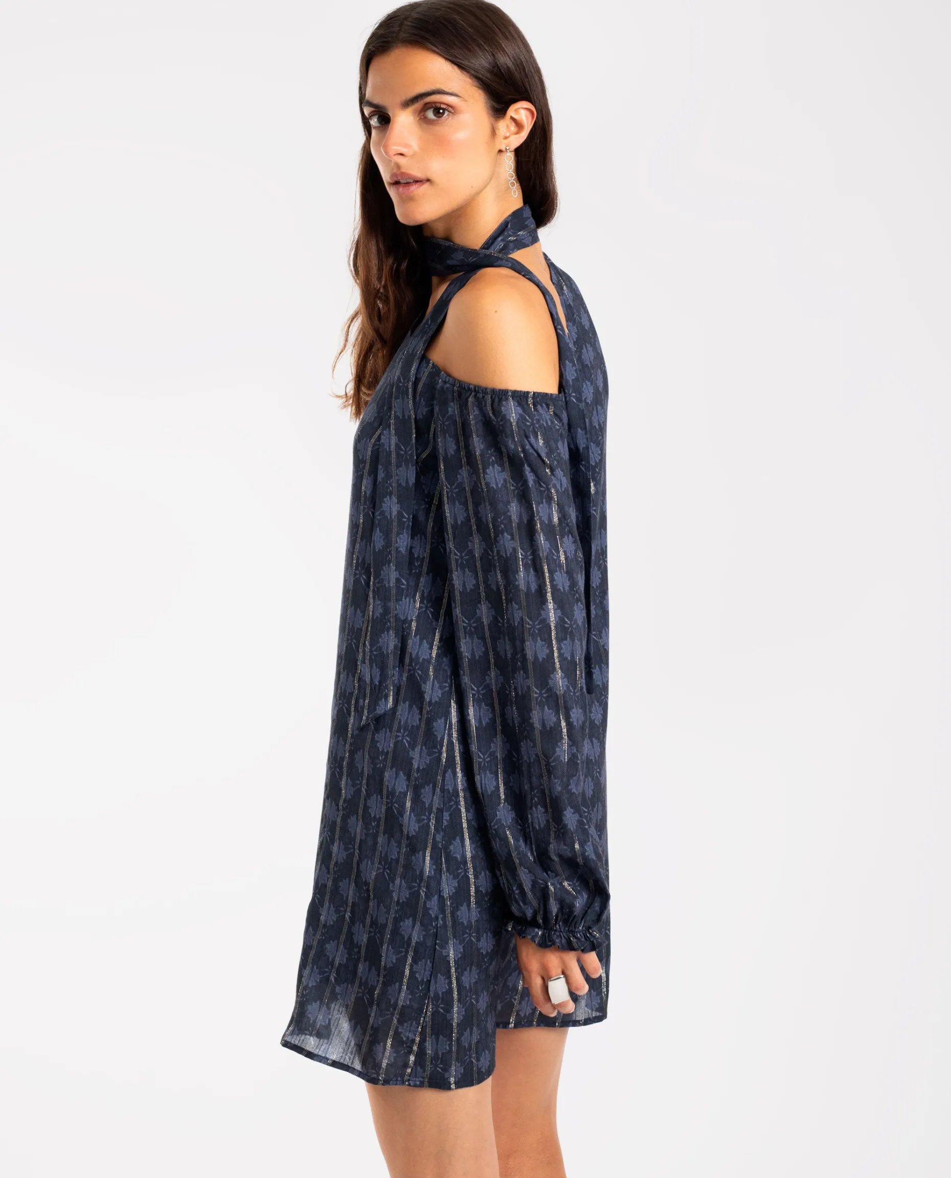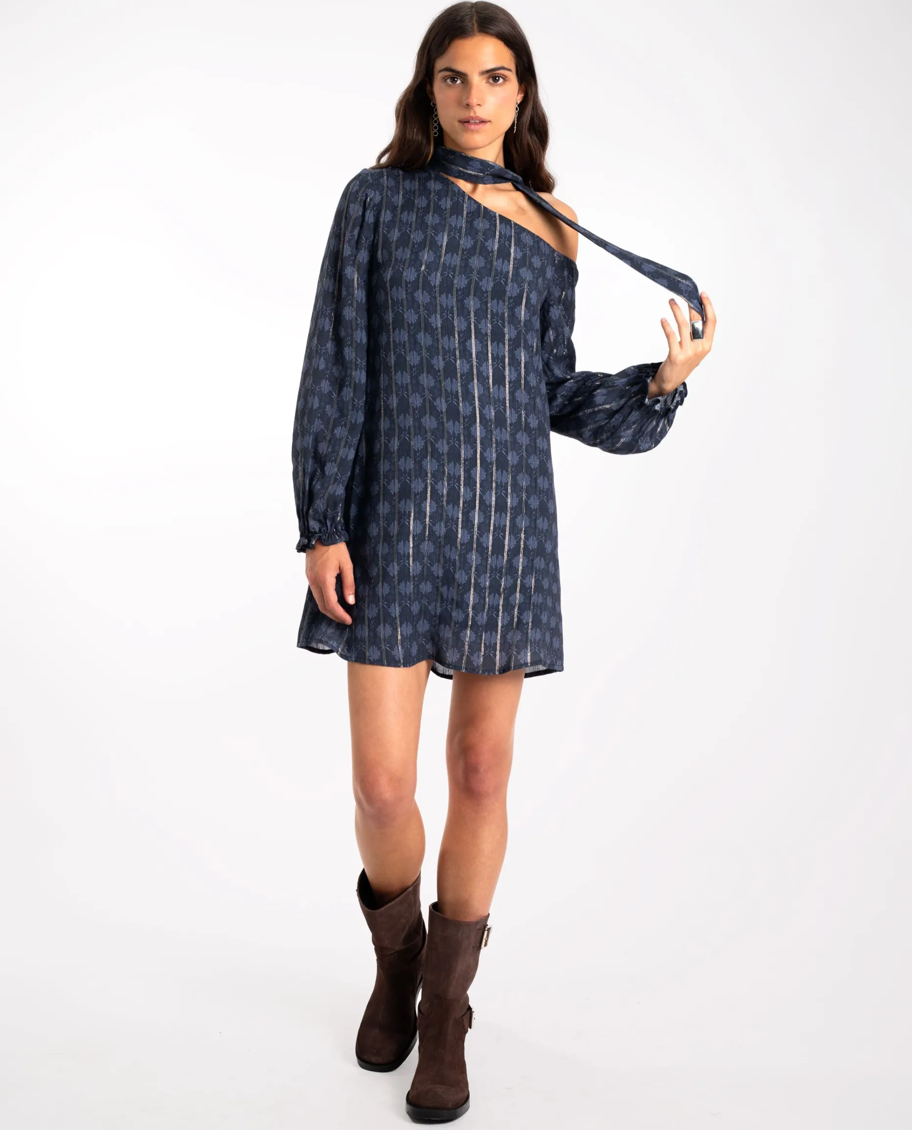 Estamos seguras de que este vestido se convertirá en tu favorito porque lo puedes llevar en cualquier ocasión! Está confeccionado en un tejido especial con tonos azul marino combinado hilos metalizados que añaden brillo al look. Tiene un escote asimétrico que deja un hombro un descubierto y mangas largas con puños elásticos. Además, incluye una lazada al cuello que le da un toque extra de estilo.