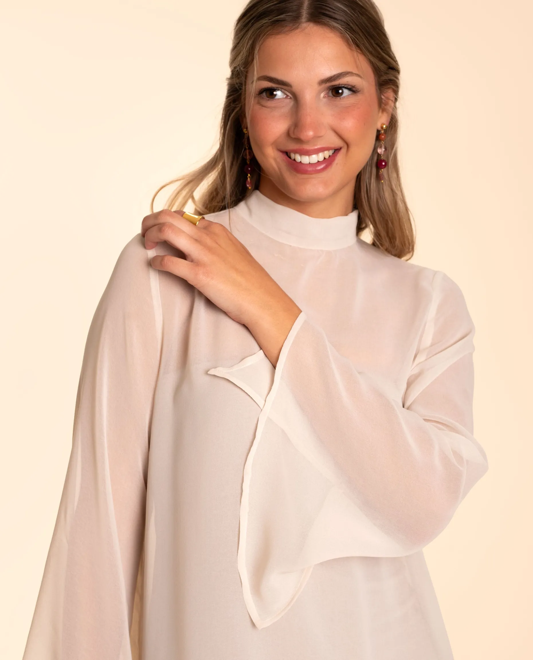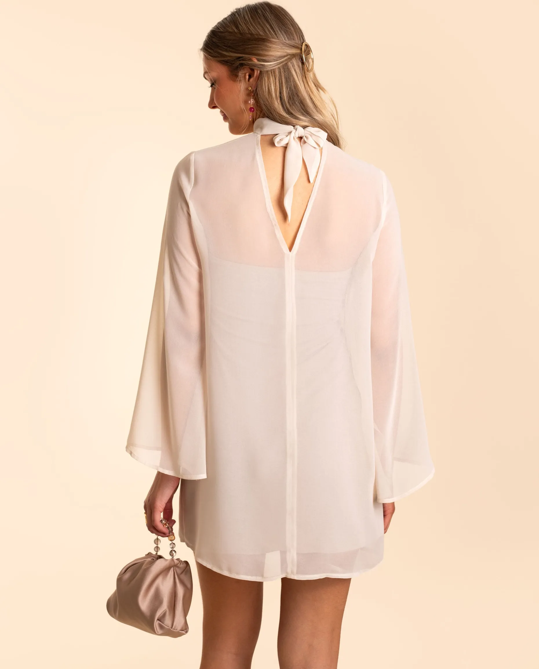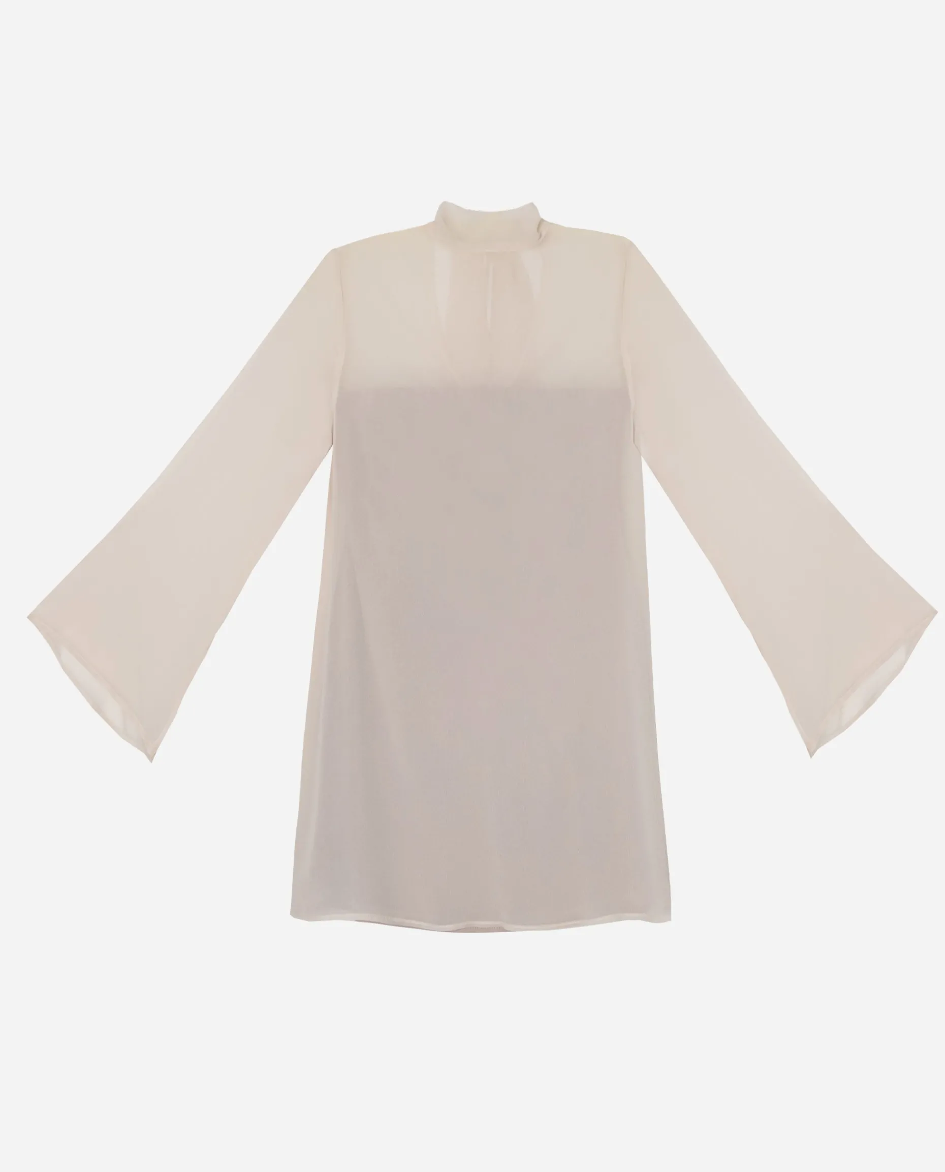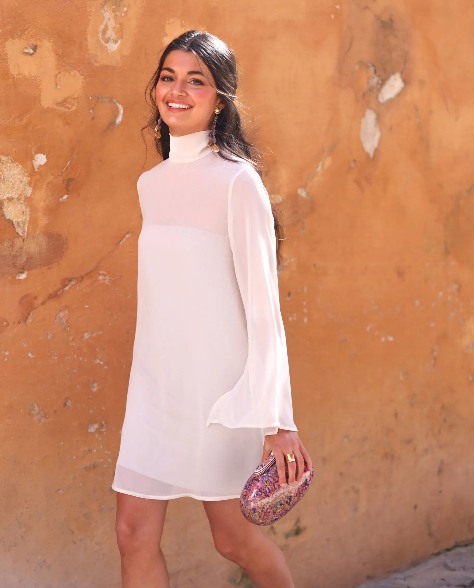 El vestido perfecto para las que buscan ir de corto en una ocasión especial. Este vestido con transparencia lleva un forro interior del mismo tono con un escote palabra de honor. Lo mejor es que en el interior lleva unas tiras para poder llevar sujetador sin preocupaciones. El cuello alto se anuda a la espalda con una lazada que deja una pequeña abertura. Las mangas de este diseño son muy especiales, acampanadas con aberturas. Gracias a su corte evasé favorece a todo tipo de cuerpos, es uno de esos vestidos que llevarás muy cómodo y que podrás reutilizar en mil ocasiones.