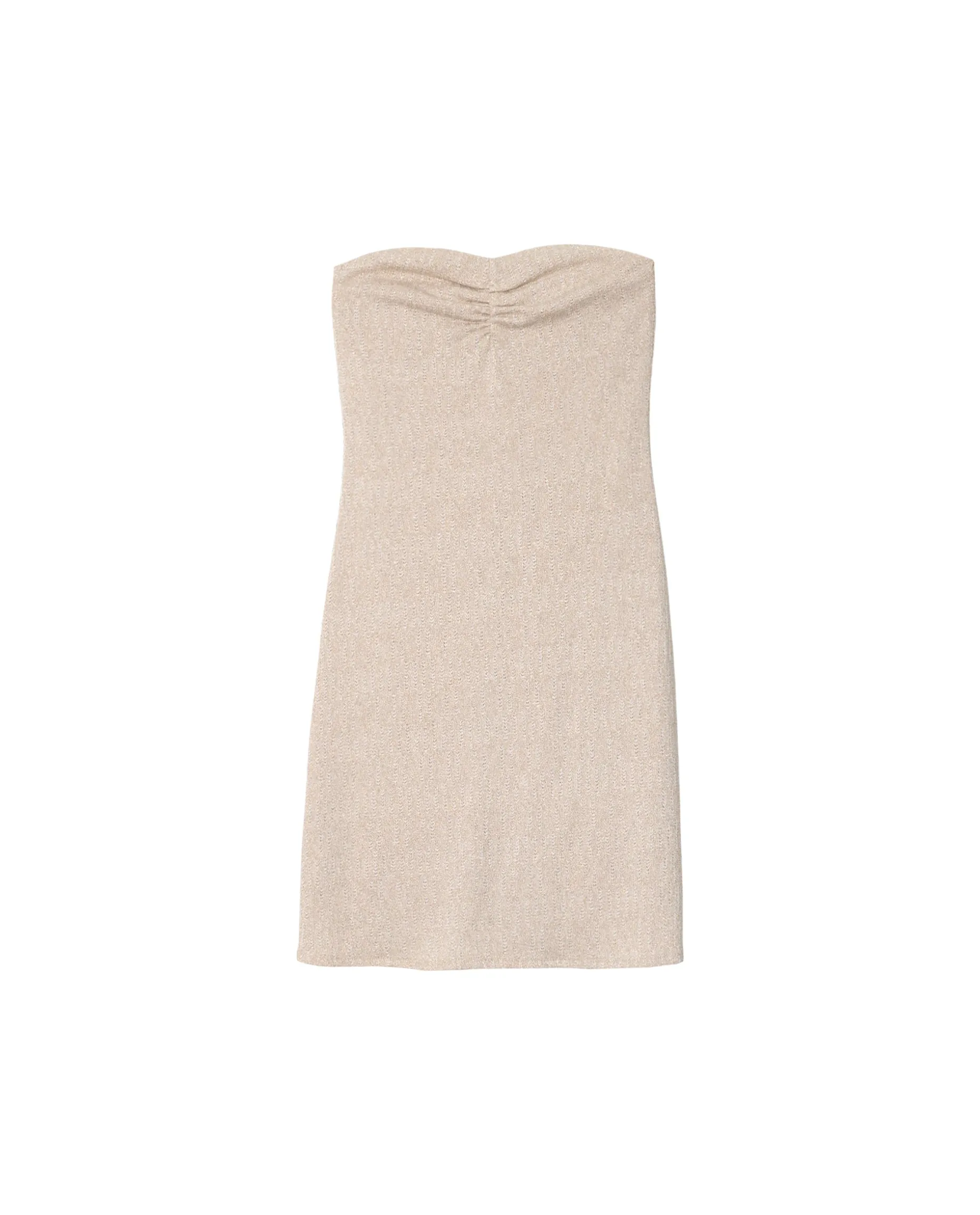 Este diseño nos transporta directamente a los mejores momentos del verano. En esta colección hemos apostado por el brillo y para este vestido corto hemos elegido un tejido que no puede ser más especial: punto elástico con hilo de lurex dorado hecho en España. Este vestido de corte evasé sienta increíble, con los hombros al descubierto y el detalle fruncido en el pecho. No tardes en hacerte con él porque va a volar!