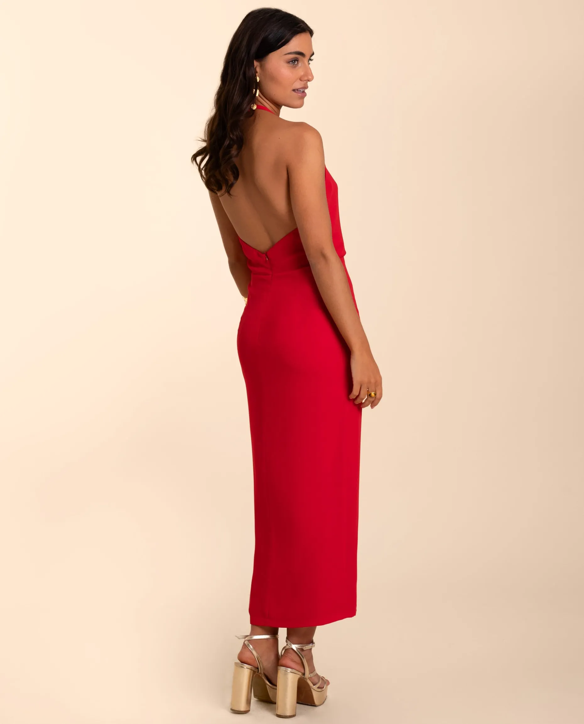 Es la combinación perfecta de un diseño elegante y minimalista con un toque sexy. El escote cruzado se anuda al cuello con una lazada, así que lo puedes regular a tu medida, y deja la espalda completamente al descubierto. El drapeado en el cuerpo con la abertura en la falda hace que sea uno de esos vestidos que potencian la silueta, además de que al llevar el corte en la cintura hace que visualmente te haga parecer más alta. Para que asiente perfecto, lleva una cremallera invisible trasera y va completamente forrado.
