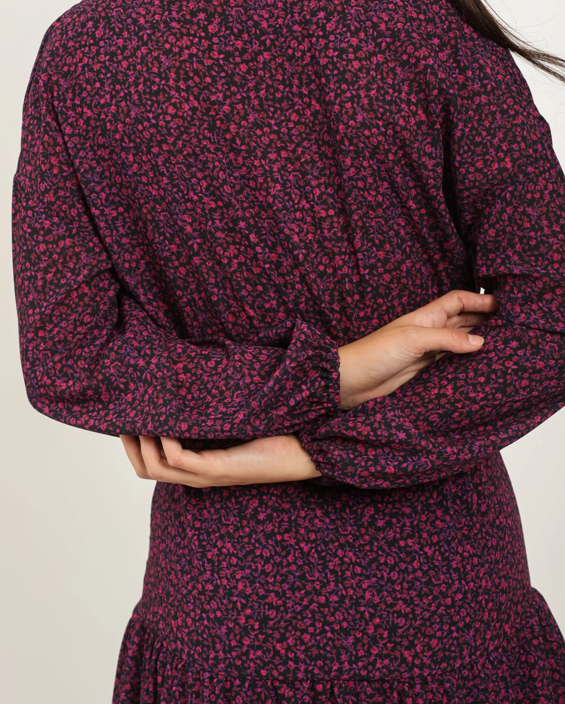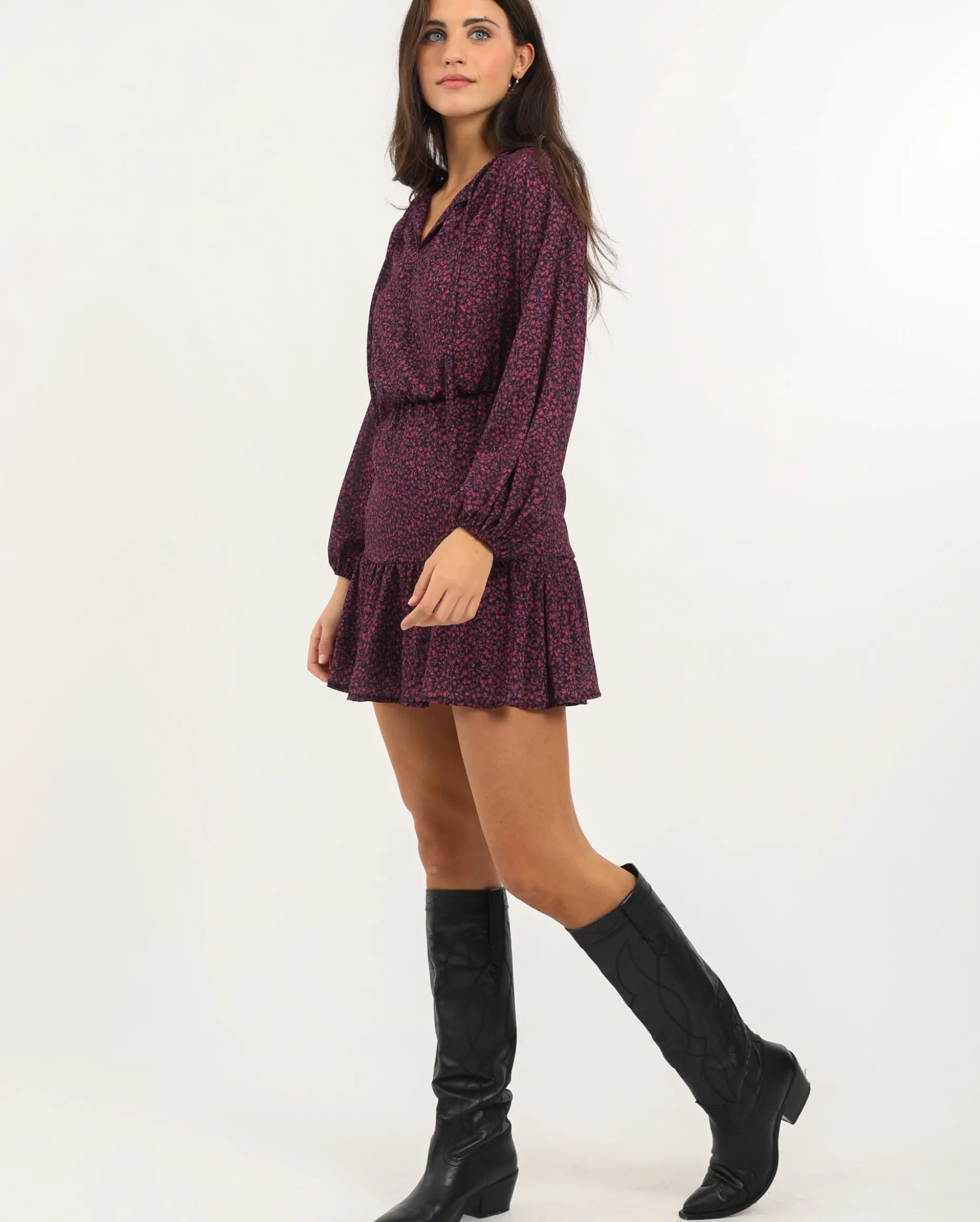 ¡Nuevo vestido favorito que todas vamos a querer llevar durante toda la temporada! El diseño es ideal, con volantes en la falda y ajustado a la cintura para un efecto ablusado. Es uno de esos vestidos cortos que puedes combinar de mil formas y siempre irás perfecta. El tejido es muy agradable, una gasa con mucho movimiento y de estampado de flores en tonos borgoña. ¿A qué esperas para incluirlo en tu colección?