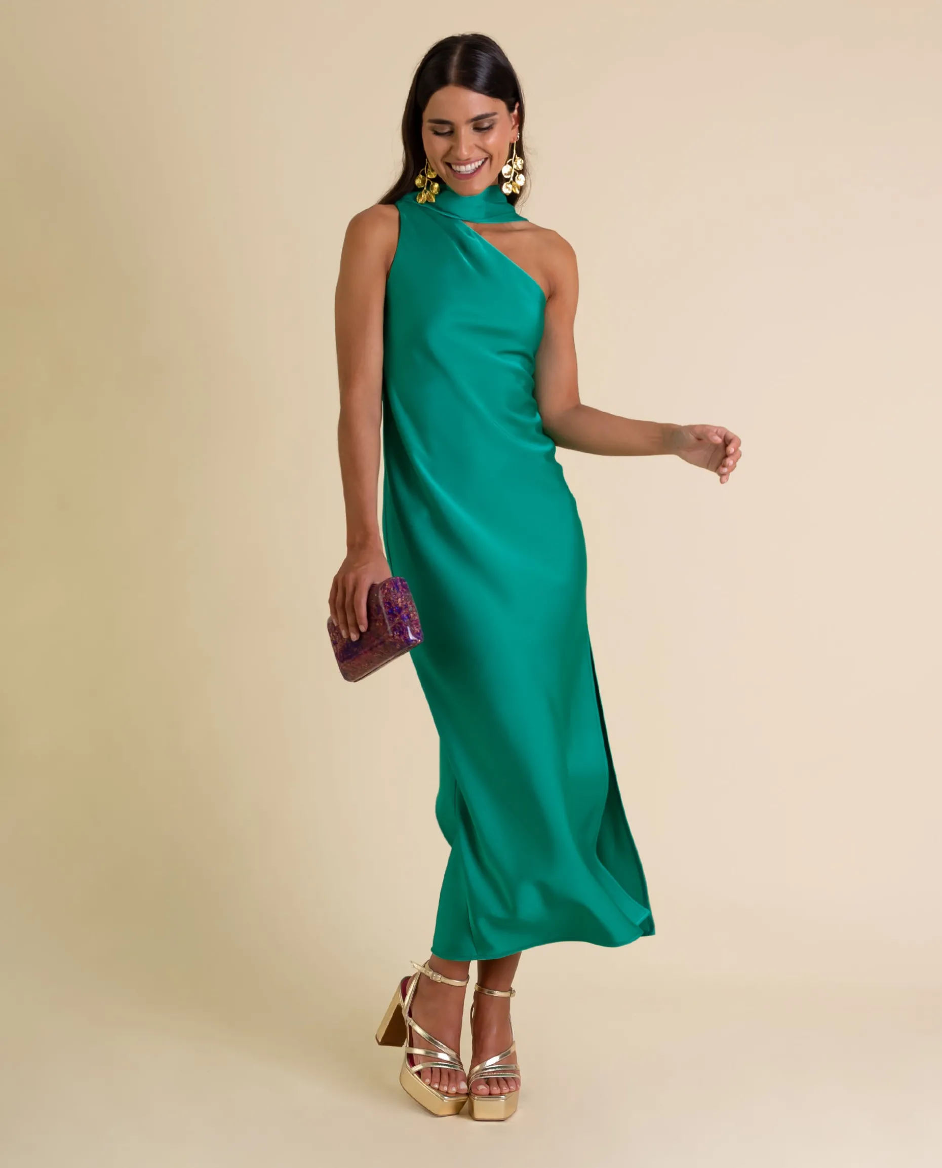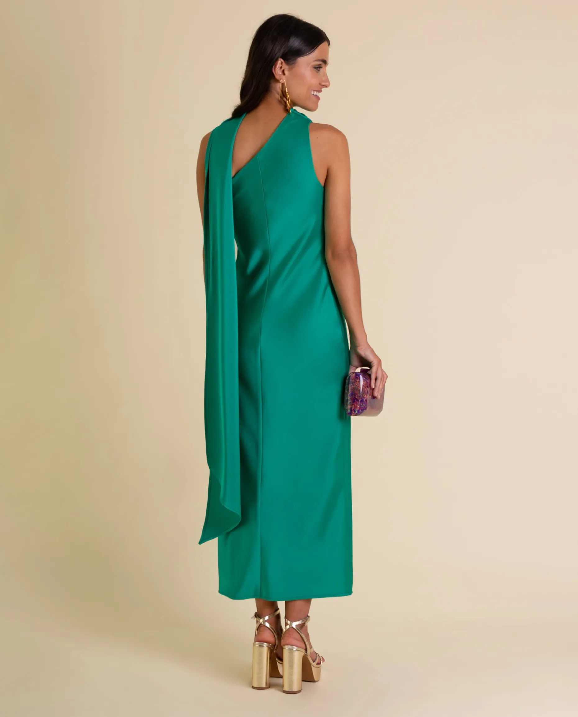 Este vestido verde midi será la pieza perfecta para cualquier invitada que busque un look elegante y sofisticado. Diseñado para que una vez te lo pruebes te sientas espectacular! Confeccionado en un suave tejido verde esmeralda satinado, el color por excelencia para acudir a un evento especial. Con su escote asimétrico drapeado y el cuello alto con una elegante lazada, este vestido verde es sinónimo de elegancia. El efecto chal de invitada añade un toque original y tendencia al look. Elígelo ahora y prueba a combinarlo con accesorios en dorado, es el match perfecto!