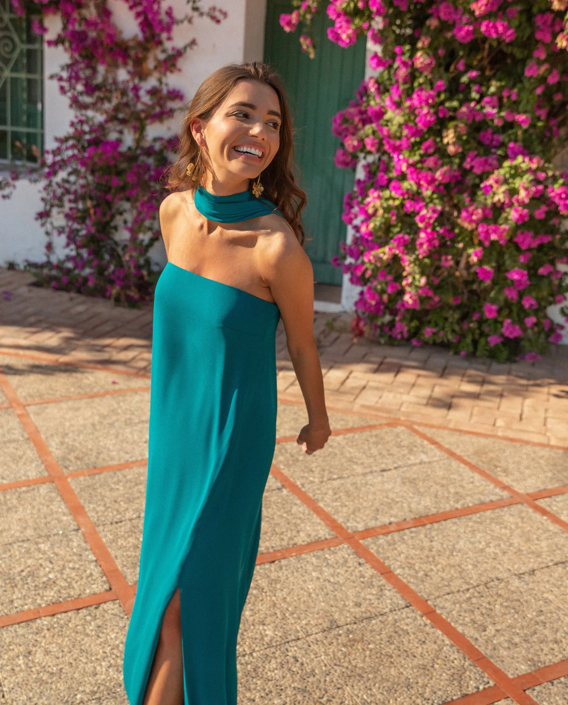 Este elegante y sofisticado vestido midi azul para invitadas está confeccionado en un tejido de gasa con mucho movimiento. Este patrón se ajusta a ti, sin marcar pero creando una silueta muy favorecedora. Este modelo incluye un fular a tono para un efecto chal, una de las tendencias de la temporada que arrasa en eventos. La abertura lateral en la falda es perfecta para lucir zapato y su color azul nos parece ideal para eventos de día y de noche, además de que es un tono que favorece cualquier tipo de piel.๐’