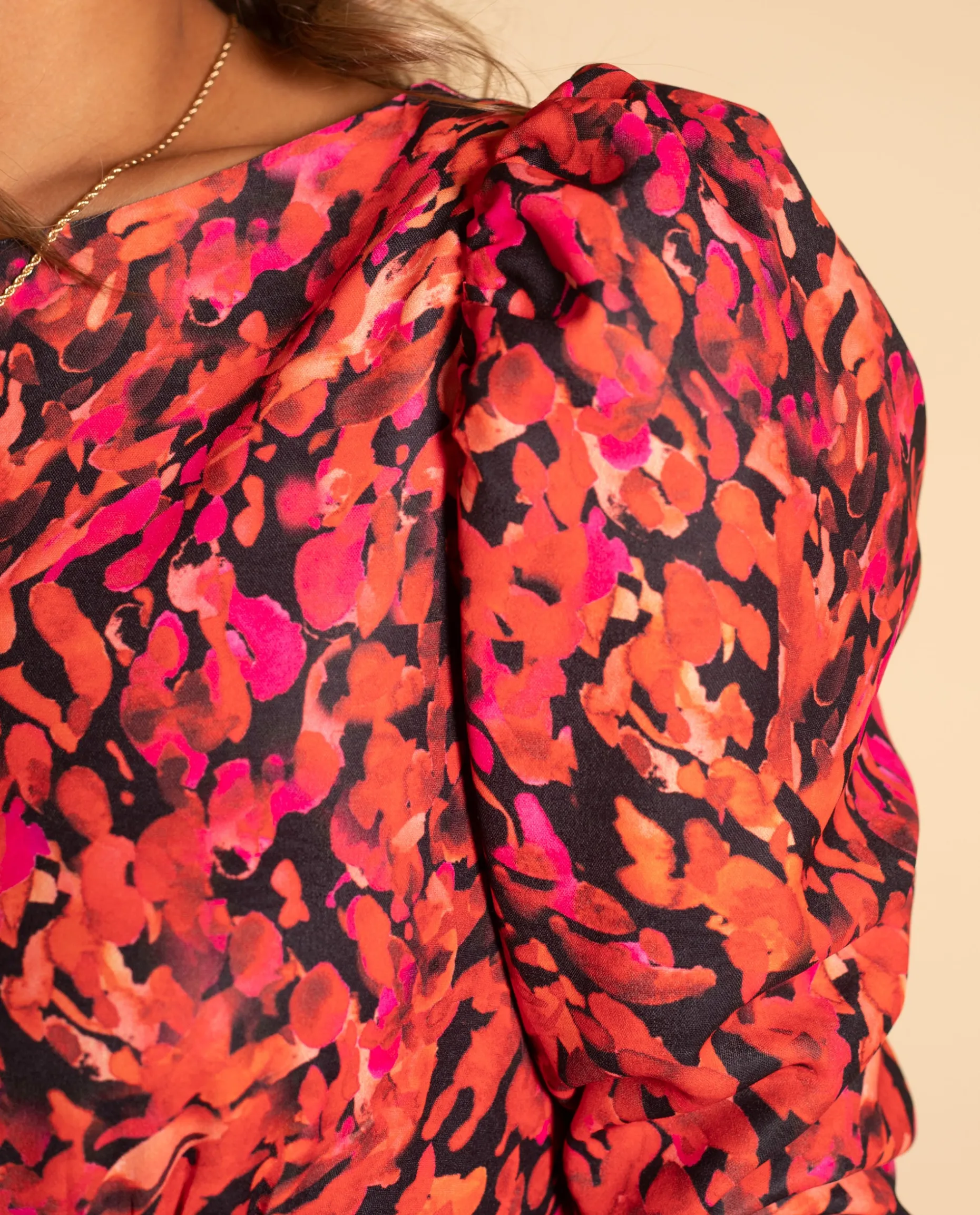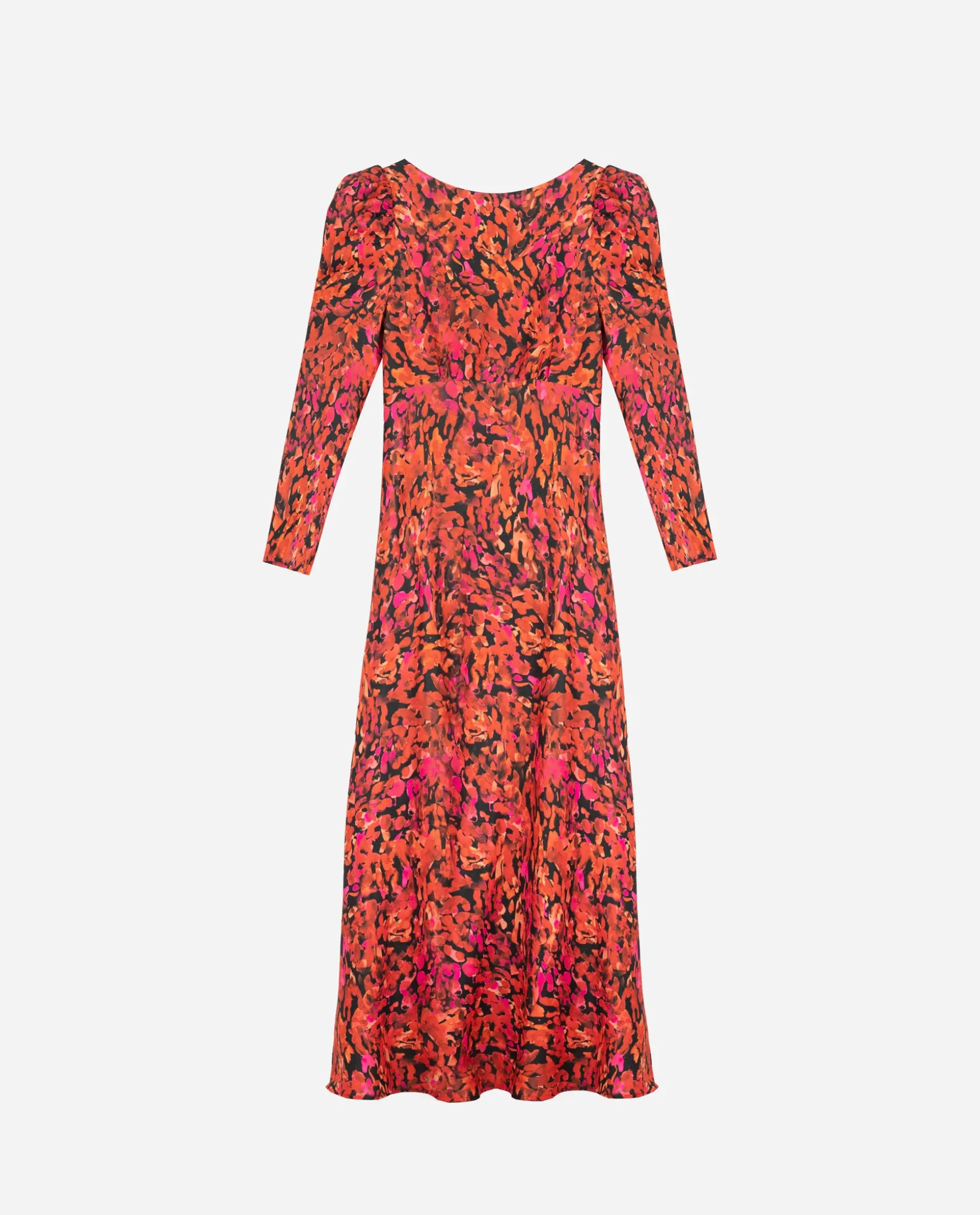 El estampado más especial de nuestra colección de eventos es este. Colores atrevidos como fresa, rojo y negro en forma abstracta sobre un tejido ligero con textura, este vestido ya se ha convertido en uno de los más buscado de invitada. Tiene el cuello cerrado, manga larga abullonada y es de corte evasé con vuelo, por lo que favorece a todo tipo de siluetas.