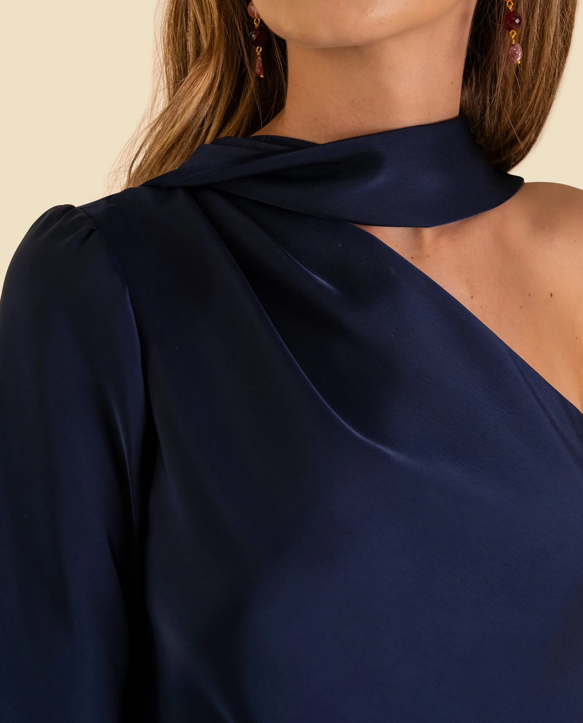 Mrs. Cortés es esa invitada que busca un vestido elegante y sofisticado para atraer todas las miradas. Diseñado para que te sientas absolutamente espectacular, el tejido azul satinado, el escote asimétrico drapeado y el cuello alto con una elegante lazada, harán de tu look una clara declaración para ser la invitada perfecta. Está cortado al bies por lo que tiene mucha caída y se adapta a todo tipo de siluetas. El efecto chal de invitada es la última tendencia y es de una sola manga larga acampanada, con un hombro completamente al descubierto. Con unos accesorios dorados, el look perfecto está asegurado.