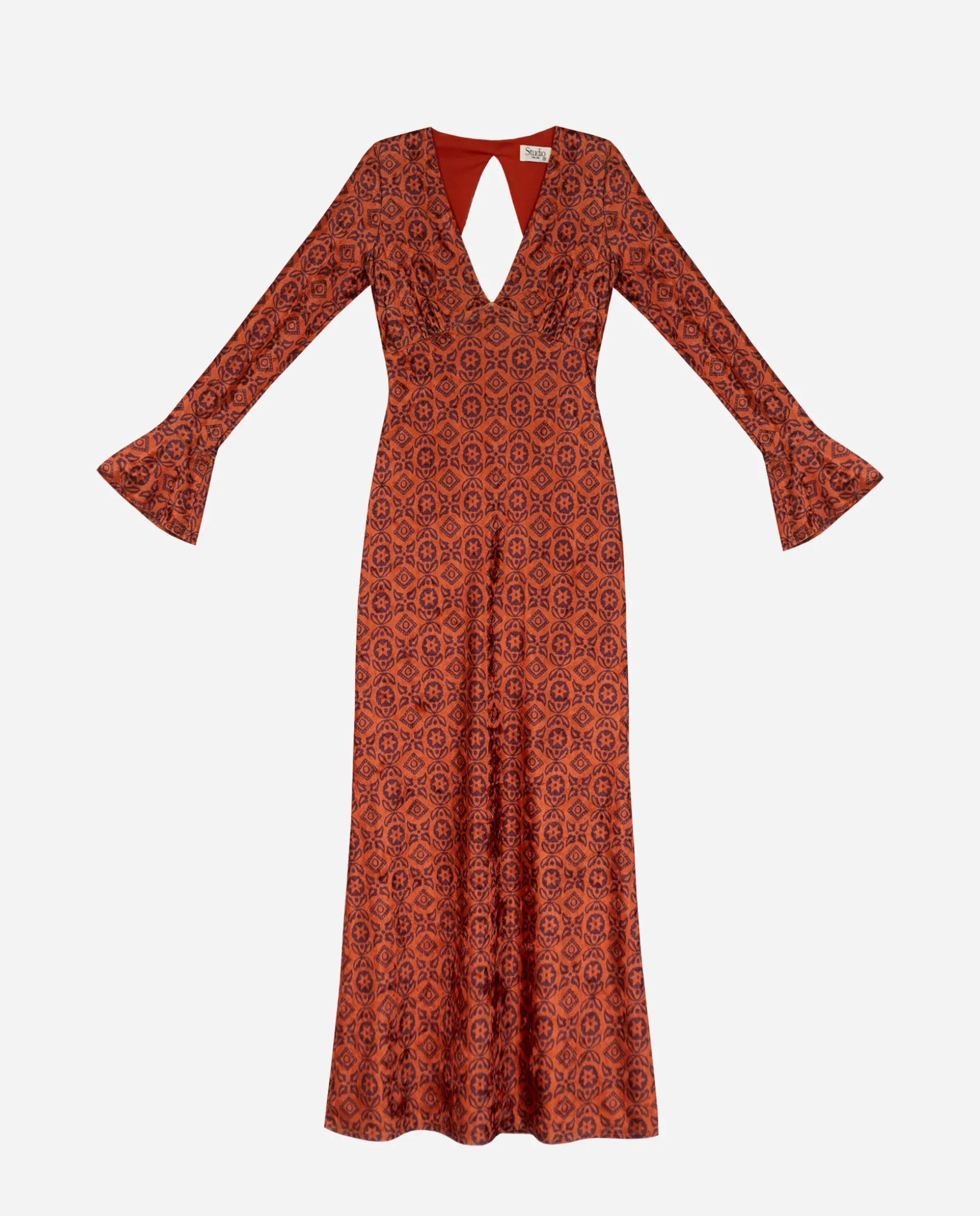 Este vestido será testigo de todos tus eventos especiales de este otoño-invierno. El diseño y patrón de este vestido de invitada no puede ser más favorecedor, un poco ajustado con un poco de vuelo en el bajo creando una silueta de sirena. Los detalles de este diseño lo convierten en una pieza única: manga acampanada, escote en pico y una preciosa abertura en la espalda para darle ese punto elegante y sexy al look. El tejido es muy especial, un terciopelo elástico naranja con un estampado ornamental que, nada más te lo pruebes, no te imaginarás llevando otro vestido!