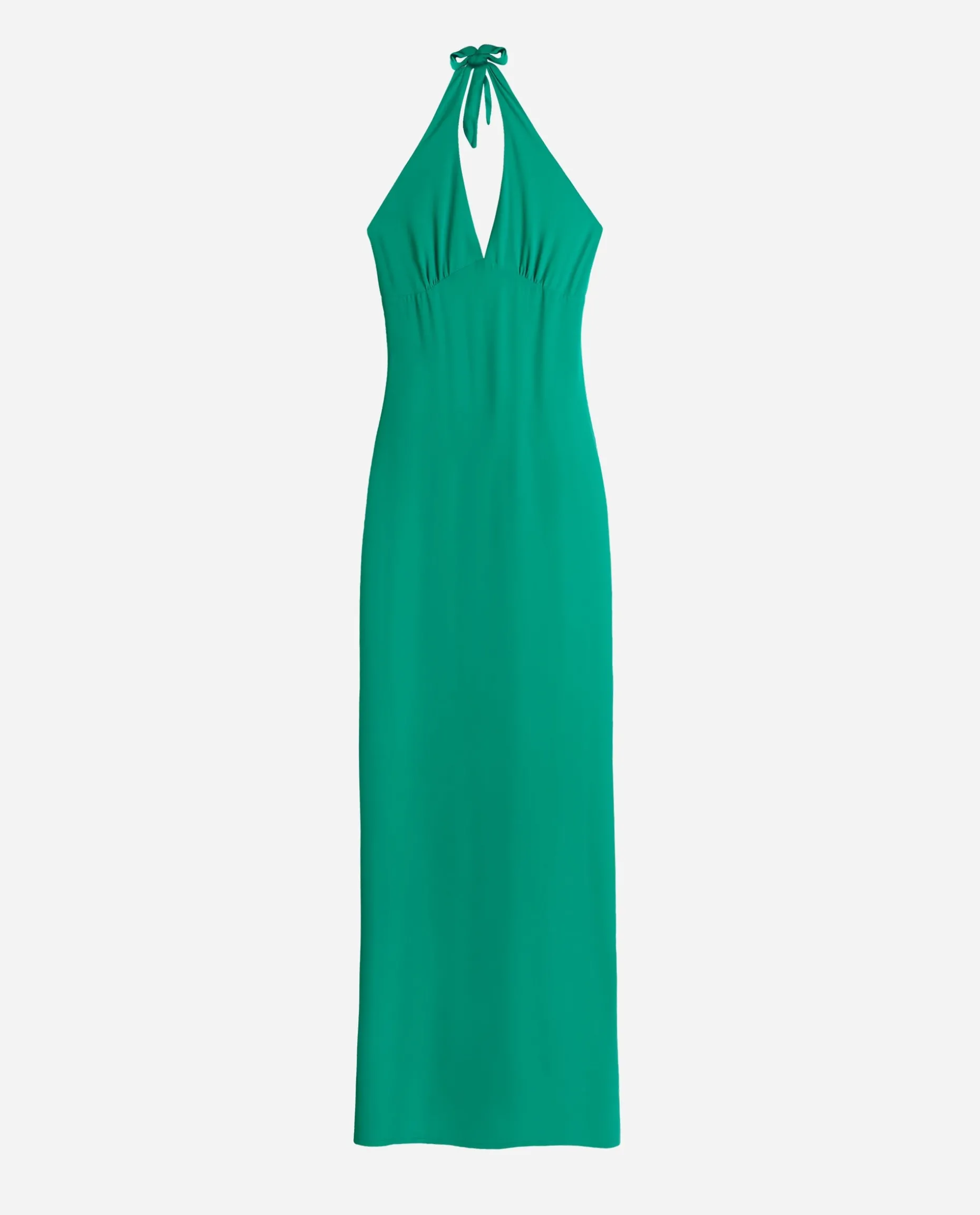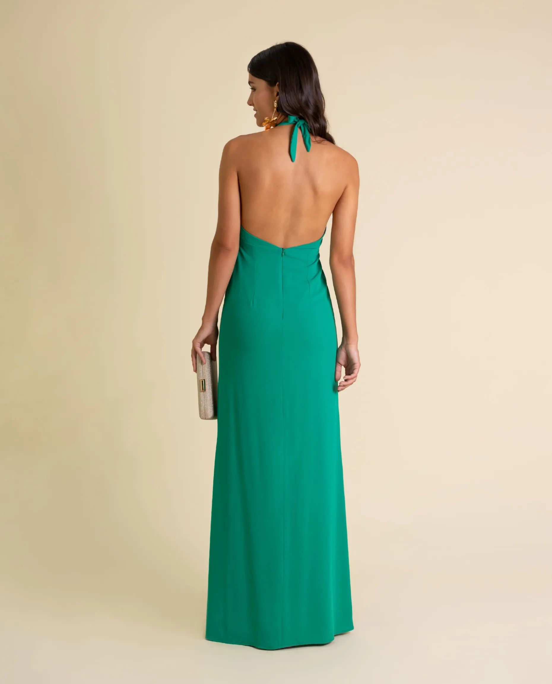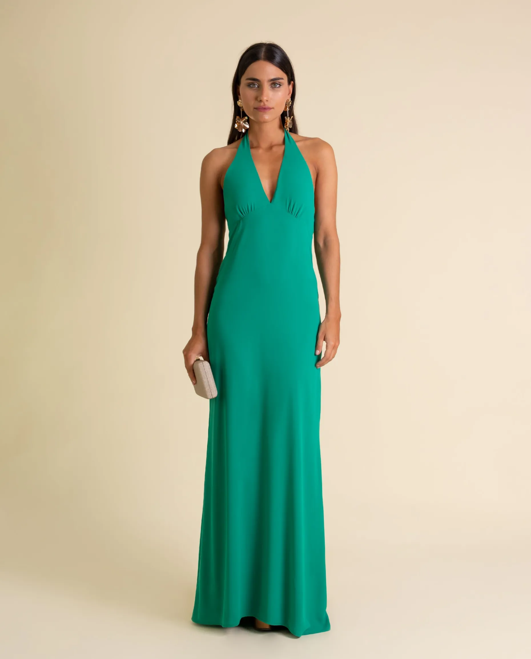 Este vestido verde será la prenda perfecta para cualquier invitada que busque un look elegante con un punto sexy. Nuestro equipo de diseño ha trabajado en el patrón de este vestido para que siente perfecto, con la espalda descubierta y detalles que lo convierten en una pieza muy especial: escote en ‘v’ drapeado, con lazada al cuello para que quede muy acoplado al pecho y lo lleves cómodo y de corte evasé para aportar la caída perfecta. El tejido es un crep verde, uno de los colores favoritos para vestir en todo tipo de eventos. Combínalo con unos accesorios dorados para convertirte en la invitada perfecta. โจ