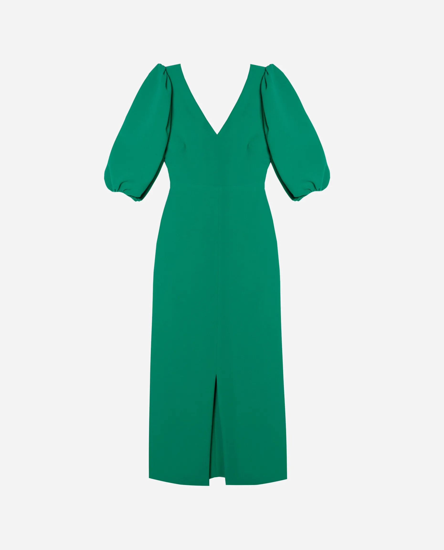 Elegancia, sencillez y dulzura, son las tres palabras que elegiríamos para definir este vestido. Es de corte midi, uno de los largos favoritos entre las invitadas, confeccionado en un tejido crep gordito que no da nada de calor pero que sienta fenomenal y es muy favorecedor. Toda la atención de este vestido se la lleva la manga corta abullonada y el color verde tan especial que hemos elegido para él. Otro detalle que no pasa desapercibido en este diseño es el escote en pico de la espalda, sienta de 10!!๐