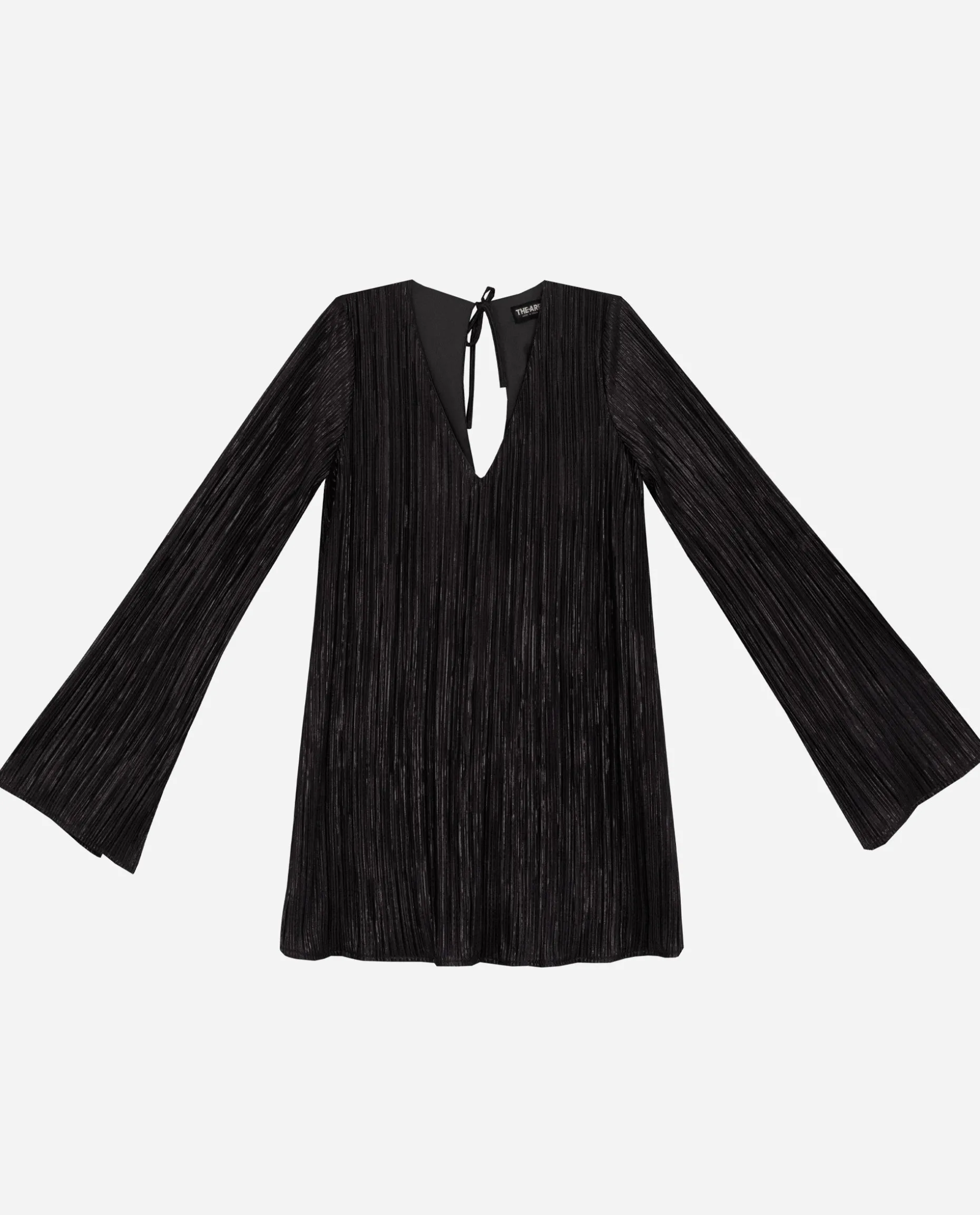 Uno de los favoritos de nuestra colección de fiesta! Este vestido es corto y te va a encantar lo bien que sienta, además su patrón es muy favorecedor. Es de corté evasé y lleva el escote en pico y las mangas ligeramente acampanadas con el detalle de las aberturas. Lo mejor es su forro de pantalón, así que es un diseño muy cómodo y elegante. El tejido plisado es otro nivel: el color, la caída, los brillos y los reflejos… Simplemente impresionante chicas!