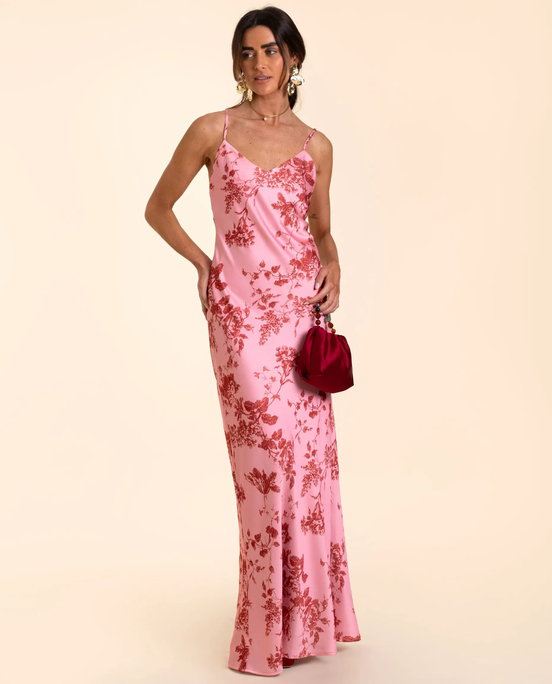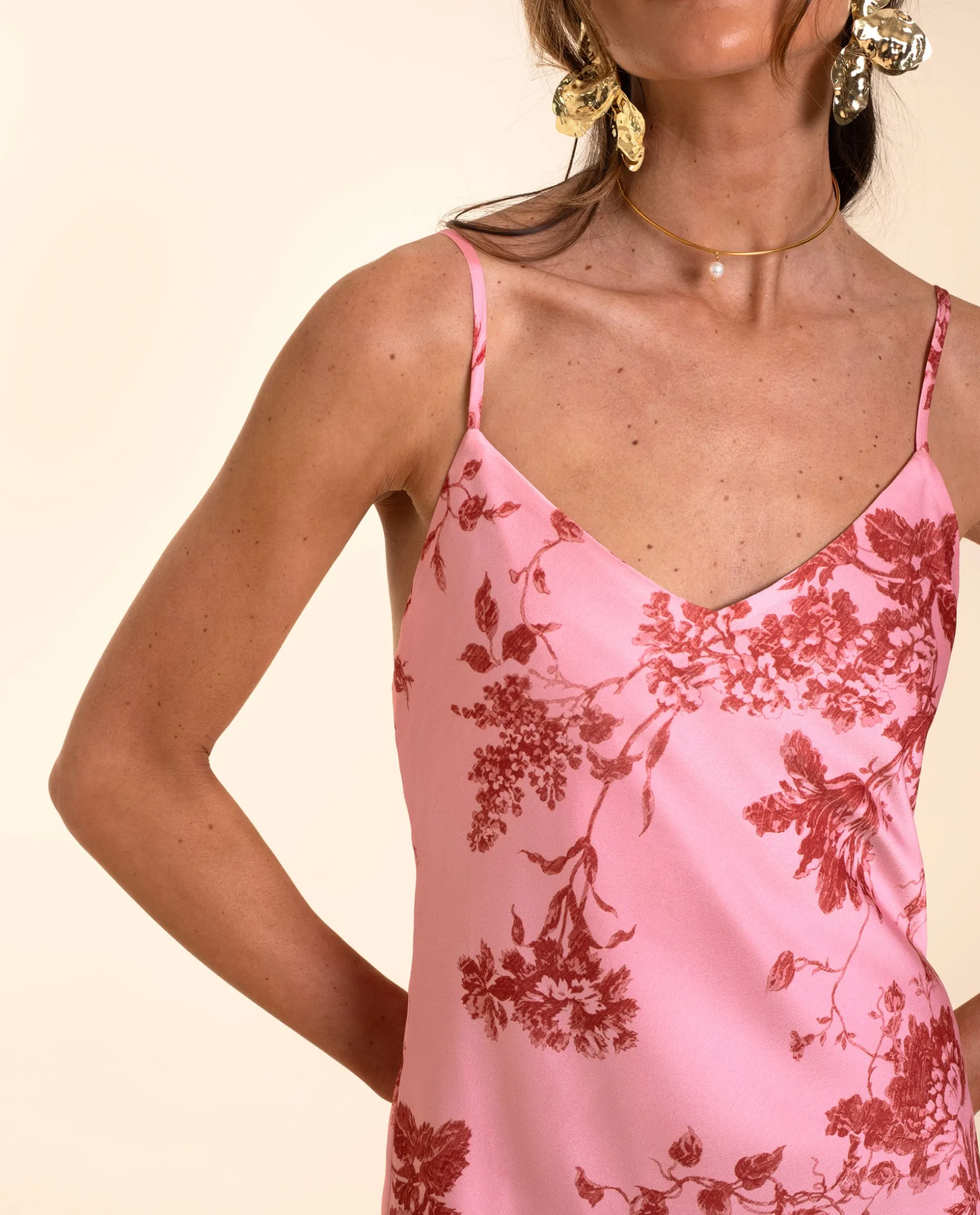 Un diseño con el que no pasarás desapercibida es este vestido satén, cortado al bies para que tenga una caída espectacular y siente como un guante. Confeccionado con un tejido satinado estampado de flores rojas que contrastan sobre el fondo rosa, una combinación con la que 100% acertar. Lleva unos tirantes finos que dejan la espalda totalmente descubierta, muy sexy! Es un vestido muy versátil que podrás ponerte tanto para eventos como para un día especial de verano, le darás muchísimo uso!